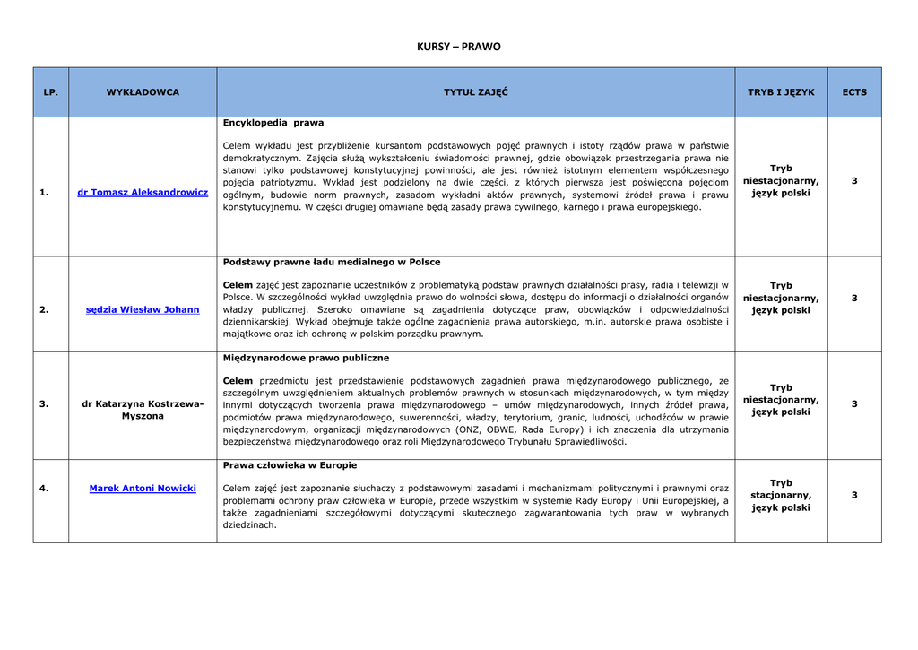 KURSY – PRAWO LP. WYKŁADOWCA TYTUŁ ZAJĘĆ TRYB I JĘZYK ECTS Celem wykładu jest przybliżenie kursantom podstawowych pojęć prawnych i istoty rządów prawa w państwie demokratycznym. Zajęcia służą wykształceniu świadomości prawnej, gdzie obowiązek przestrzegania prawa nie stanowi tylko podstawowej konstytucyjnej powinności, ale jest również istotnym elementem współczesnego pojęcia patriotyzmu. Wykład jest podzielony na dwie części, z których pierwsza jest poświęcona pojęciom ogólnym, budowie norm prawnych, zasadom wykładni aktów prawnych, systemowi źródeł prawa i prawu konstytucyjnemu. W części drugiej omawiane będą zasady prawa cywilnego, karnego i prawa europejskiego. Tryb niestacjonarny, język polski 3 Tryb niestacjonarny, język polski 3 Tryb niestacjonarny, język polski 3 Tryb stacjonarny, język polski 3 Encyklopedia prawa 1. dr Tomasz Aleksandrowicz Podstawy prawne ładu medialnego w Polsce 2. sędzia Wiesław Johann Celem zajęć jest zapoznanie uczestników z problematyką podstaw prawnych działalności prasy, radia i telewizji w Polsce. W szczególności wykład uwzględnia prawo do wolności słowa, dostępu do informacji o działalności organów władzy publicznej. Szeroko omawiane są zagadnienia dotyczące praw, obowiązków i odpowiedzialności dziennikarskiej. Wykład obejmuje także ogólne zagadnienia prawa autorskiego, m.in. autorskie prawa osobiste i majątkowe oraz ich ochronę w polskim porządku prawnym. Międzynarodowe prawo publiczne 3. dr Katarzyna KostrzewaMyszona Celem przedmiotu jest przedstawienie podstawowych zagadnień prawa międzynarodowego publicznego, ze szczególnym uwzględnieniem aktualnych problemów prawnych w stosunkach międzynarodowych, w tym między innymi dotyczących tworzenia prawa międzynarodowego – umów międzynarodowych, innych źródeł prawa, podmiotów prawa międzynarodowego, suwerenności, władzy, terytorium, granic, ludności, uchodźców w prawie międzynarodowym, organizacji międzynarodowych (ONZ, OBWE, Rada Europy) i ich znaczenia dla utrzymania bezpieczeństwa międzynarodowego oraz roli Międzynarodowego Trybunału Sprawiedliwości. Prawa człowieka w Europie 4. Marek Antoni Nowicki Celem zajęć jest zapoznanie słuchaczy z podstawowymi zasadami i mechanizmami politycznymi i prawnymi oraz problemami ochrony praw człowieka w Europie, przede wszystkim w systemie Rady Europy i Unii Europejskiej, a także zagadnieniami szczegółowymi dotyczącymi skutecznego zagwarantowania tych praw w wybranych dziedzinach.