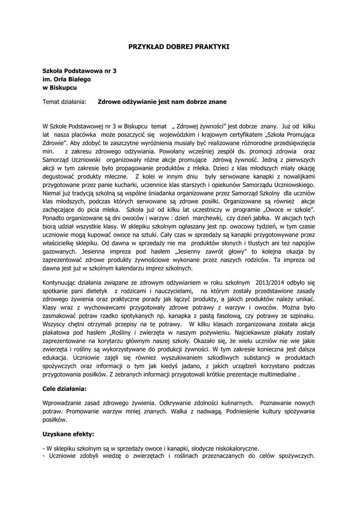 PRZYKŁAD DOBREJ PRAKTYKI Szkoła Podstawowa nr 3 im. Orła Białego w Biskupcu Temat działania: Zdrowe odżywianie jest nam dobrze znane W Szkole Podstawowej nr 3 w Biskupcu temat „ Zdrowej żywności” jest dobrze znany. Już od kilku lat nasza placówka może poszczycić się wojewódzkim i krajowym certyfikatem „Szkoła Promująca Zdrowie”. Aby zdobyć te zaszczytne wyróżnienia musiały być realizowane różnorodne przedsięwzięcia min. z zakresu zdrowego odżywiania. Powołany wcześniej zespół ds. promocji zdrowia oraz Samorząd Uczniowski organizowały różne akcje promujące zdrową żywność. Jedną z pierwszych akcji w tym zakresie było propagowanie produktów z mleka. Dzieci z klas młodszych miały okazję degustować produkty mleczne. Z kolei w innym dniu były serwowane kanapki z nowalijkami przygotowane przez panie kucharki, uczennice klas starszych i opiekunów Samorządu Uczniowskiego. Niemal już tradycją szkolną są wspólne śniadanka organizowane przez Samorząd Szkolny dla uczniów klas młodszych, podczas których serwowane są zdrowe posiłki. Organizowane są również akcje zachęcające do picia mleka. Szkoła już od kilku lat uczestniczy w programie „Owoce w szkole”. Ponadto organizowane są dni owoców i warzyw : dzień marchewki, czy dzień jabłka. W akcjach tych biorą udział wszystkie klasy. W sklepiku szkolnym ogłaszany jest np. owocowy tydzień, w tym czasie uczniowie mogą kupować owoce na sztuki. Cały czas w sprzedaży są kanapki przygotowywane przez właścicielkę sklepiku. Od dawna w sprzedaży nie ma produktów słonych i tłustych ani też napojów gazowanych. Jesienna impreza pod hasłem „Jesienny zawrót głowy” to kolejna okazja by zaprezentować zdrowe produkty żywnościowe wykonane przez naszych rodziców. Ta impreza od dawna jest już w szkolnym kalendarzu imprez szkolnych. Kontynuując działania związane ze zdrowym odżywianiem w roku szkolnym 2013/2014 odbyło się spotkanie pani dietetyk z rodzicami i nauczycielami, na którym zostały przedstawione zasady zdrowego żywienia oraz praktyczne porady jak łączyć produkty, a jakich produktów należy unikać. Klasy wraz z wychowawcami przygotowały zdrowe potrawy z warzyw i owoców. Można było zasmakować potraw rzadko spotykanych np. kanapka z pastą fasolową, czy potrawy ze szpinaku. Wszyscy chętni otrzymali przepisy na te potrawy. W kilku klasach zorganizowana została akcja plakatowa pod hasłem „Rośliny i zwierzęta w naszym pożywieniu. Najciekawsze plakaty zostały zaprezentowane na korytarzu głównym naszej szkoły. Okazało się, że wielu uczniów nie wie jakie zwierzęta i rośliny są wykorzystywane do produkcji żywności. W tym zakresie konieczna jest dalsza edukacja. Uczniowie zajęli się również wyszukiwaniem szkodliwych substancji w produktach spożywczych oraz informacji o tym jak kiedyś jadano, z jakich urządzeń korzystano podczas przygotowania posiłków. Z zebranych informacji przygotowali krótkie prezentacje multimedialne . Cele działania: Wprowadzanie zasad zdrowego żywienia. Odkrywanie zdolności kulinarnych. Poznawanie nowych potraw. Promowanie warzyw mniej znanych. Walka z nadwagą. Podniesienie kultury spożywania posiłków. Uzyskane efekty: - W sklepiku szkolnym są w sprzedaży owoce i kanapki, słodycze niskokaloryczne. - Uczniowie zdobyli wiedzę o zwierzętach i roślinach przeznaczanych do celów spożywczych. - Podniosła się kultura spożywania posiłków, estetyka ich wykonania i podawania. Wzrosła liczba uczniów spożywających zdrową żywność. Posiłki uczniowskie uległy urozmaiceniu dzięki wprowadzeniu do menu nieznanych im dotąd potraw. Zwiększyła się liczba uczniów dbająca o prawidłową wagę ciała. Wnioski z realizacji: Dla wielu uczniów niektóre potrawy były sporym zaskoczeniem, a dla innych okazja do nauki i wykorzystania wiedzy i zdobytych przepisów w swoich domach. Podjęte działania należy kontynuować. Autorzy dobrej praktyki: Jolanta Okuniewska - nauczyciel wychowania fizycznego, koordynator zespołu do spraw promocji zdrowia, Hanna Szkop - nauczyciel edukacji wczesnoszkolnej, opiekun Samorządu Uczniowskiego, Danuta Leszek–Grabowska - nauczyciel informatyki, Roman Leśniewski - nauczyciel języka polskiego, Bernard Czerwiński - nauczyciel przyrody, koordynator działań ekologicznych