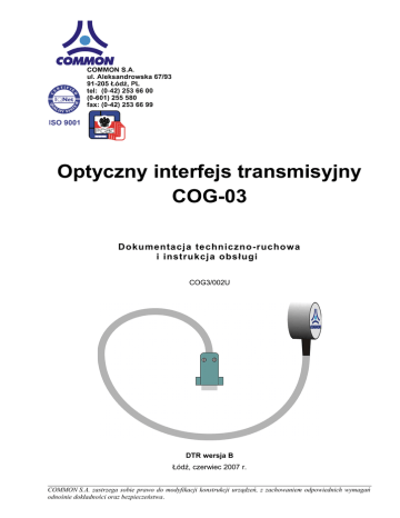 Optyczny interfejs transmisyjny COG-03 Dokumentacja techniczno-ruchowa i instrukcja obsługi COG3/002U DTR wersja B Łódź, czerwiec 2007 r. COMMON S.A. zastrzega sobie prawo do modyfikacji konstrukcji urządzeń, z zachowaniem odpowiednich wymagań odnośnie dokładności oraz bezpieczeństwa. COG-03 Dokumentacja Techniczno-Ruchowa COMMON S.A. Spis treści 1. Wstęp.......................................................................................................................................... 3 2. Budowa....................................................................................................................................... 4 3. Dane techniczne.......................................................................................................................... 5 3.1. Oznaczenia i certyfikaty........................................................................................................................ 5 3.2. Obudowa.............................................................................................................................................. 5 3.3. Warunki użytkowania............................................................................................................................ 5 3.4. Zasilanie............................................................................................................................................... 5 3.5. Transmisja............................................................................................................................................ 5 4. Podłączenie urządzenia.............................................................................................................. 6 5. Ochrona środowiska.................................................................................................................... 7 5.1. Postępowanie z odpadami opakowaniowymi........................................................................................7 5.2. Postępowanie z bateriami i urządzeniami po zakończeniu użytkowania..............................................7 6. Spis rysunków............................................................................................................................. 8 7. Historia zmian w dokumentacji....................................................................................................8 2 COG-03 1. Dokumentacja Techniczno-Ruchowa COMMON S.A. Wstęp Optyczny interfejs transmisyjny COG-03 przeznaczony jest do transmisji danych pomiędzy urządzeniem znajdującym się w strefie zagrożonej wybuchem, posiadającym łącze OPTO-GAZ, a urządzeniem wyposażonym w odpowiednie złącze i znajdującym się poza strefą zagrożenia wybuchem. Wymiana danych pomiędzy urządzeniem odczytywanym a głowicą interfejsu COG-03 odbywa się w podczerwieni. Głowicę umieszcza się na urządzeniu odczytywanym za pomocą wbudowanego magnesu trwałego. Do połączenia interfejsu COG-03 z urządzeniem odczytującym wykorzystane jest łącze RS232. Wygląd interfejsu wraz z opisem został przedstawiony poniżej na Rys. 1.1. Rys. 1.1 - Optyczny interfejs transmisyjny COG-03 Gwarantowana prędkość transmisji wynosi 9600 bitów/s. W przypadku optymalnych warunków współpracy portów optycznych możliwa jest szybsza komunikacja, nawet do 115200 bitów/s. W głowicy COG-03 znajduje się bardzo silny magnes! Należy więc postępować bardzo ostrożnie, aby nie uszkodzić innych urządzeń podatnych na wpływ obcych pól magnetycznych. W szczególności dotyczy to komputerów, monitorów, zegarków, itp. W przypadku niedostosowania się do ostrzeżenia, producent nie ponosi odpowiedzialności za powstałe straty. 3 ! COG-03 2. Dokumentacja Techniczno-Ruchowa COMMON S.A. Budowa Urządzenie składa się z dwóch części: • głowicy (w obudowie aluminiowej) z łączem optycznym OPTO-GAZ i magnesem trwałym, • wtyku DB9 (typu żeńskiego) z barierą zapewniającą iskrobezpieczeństwo Magnes trwały umieszczony w głowicy służy do aktywowania łącza optycznego w odczytywanym urządzeniu. Zapewnia on również prawidłowe przyleganie głowicy do obudowy urządzenia w miejscu do tego przewidzianym. Głowica (będąca w strefie zagrożonej wybuchem) połączona jest z wtyczką wraz z barierą (będącą poza strefą zagrożenia wybuchem) standardowo przewodem o długości 2.5m. Na życzenie klienta długość ta może być dobierana z zakresu od 1.5m do 30m. Interfejs COG-03 zachowa deklarowane właściwości iskrobezpieczne, gdy napięcie doprowadzone do pinów złącza RS232 nie przekroczy Um=30V. ! Interfejs COG-03 przystosowany został do współpracy ze standardowym portem RS232. Doprowadzenie do interfejsu napięć innych niż przewidzianych standardem RS232 może spowodować jego uszkodzenie. Uszkodzenie spowodowane przekroczeniem interfejsu COG-03 nie jest objęte gwarancją. 4 napięć doprowadzonych do ! COG-03 3. 3.1. Dokumentacja Techniczno-Ruchowa Dane techniczne Oznaczenia i certyfikaty Oznaczenie budowy przeciwwybuchowej II 2G EEx ia IIB T4 Oznaczenia i numer certyfikatu 1453 KDB 04ATEX219 Zgodność z normami 3.2. PN-EN 50014:2004, PN-EN 50020:2005 Obudowa Rodzaj, materiał aluminiowa głowica Stopień ochrony obudów: bariera / głowica IP20 / IP54 Wymiary głowicy (25 x ∅30)mm Masa głowicy < 60g • • Długość przewodu do strefy EX 3.3. standardowo: 2,5m na zamówienie: od 1,5m do 30m Warunki użytkowania Maksymalne napięcie doprowadzone do obwodów Um=30V nieiskrobezpiecznych Temperatura otoczenia od -25°C do +55°C Wilgotność względna max 95% w temp. 55°C 3.4. Zasilanie Źródło zasilania 3.5. COMMON S.A. złącze RS232 (RTS/DTR) Transmisja Prędkość transmisji: • gwarantowana: • możliwa do uzyskania: 9600 bitów/s do 115200 bitów/s 5 COG-03 4. Dokumentacja Techniczno-Ruchowa COMMON S.A. Podłączenie urządzenia Aby przeprowadzić transmisję danych za pomocą interfejsu COG-03 należy: 1. Podłączy