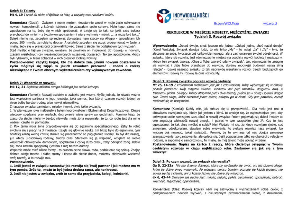 Dzień 6: Talenty Mt 4, 19 I rzekł do nich: «Pójdźcie za Mną, a uczynię was rybakami ludzi». Komentarz (Gosia): Związek z moim mężem nieustannie wnosi w moje życie odkrywanie nowych kompetencji, z których istnienia nie zdawałam sobie sprawy. Mało tego, sama nie wpadłabym na to, żeby się w nich spróbować. A dzieje się to tak: co jakiś czas Łukasz przychodzi do mnie i - z życzliwym spojrzeniem i wiarą we mnie - mówi: ,,…a może byś tak…” Dzięki niemu np. zaczęłam sprzedawać zbywające nam rzeczy na Allegro - sprzedałam ich ponad 300 i myślę, że robię to dobrze. A ostatnio zaczęłam się uczyć programować w Javie, z myślą, żeby się w przyszłości przekwalifikować. Sama z siebie nie podjęłabym tych wyzwań. Stąd myśląc o fajnym związku, uważam, że powinien on inspirować do rozwoju w nowych, czasem nieistotnych czy nieuświadomionych wcześniej, obszarach. Tak jak apostołowie, którzy byli rybakami, a Jezus zobaczył w nich głosicieli Dobrej Nowiny. Postanowienie: Zapytaj kogoś, kto Cię dobrze zna, jakimi nowymi obszarami w życiu mógłbyś się zająć, w jakich zawodach pracować - chodzi o rzeczy niezwiązane z Twoim obecnym wykształceniem czy wykonywanym zawodem. Dzień 7: Wsparcie w rozwoju Mk 12, 31 Będziesz miłował swego bliźniego jak siebie samego. Komentarz (Tomek): Rozwój osobisty w związku jest ważny. Myślę jednak, że równie ważne jest wspieranie partnera w jego rozwoju, taka pomoc, bez której czasem rozwój jednej ze stron byłby bardzo trudny, albo nawet niemożliwy. Z naszego związku pamiętam, między innymi, dwie takie sytuacje. 1. W pierwszym roku małżeństwa byłem koordynatorem Ekstremalnej Drogi Krzyżowej. Długie wieczory spędzane przy mailach, dogrywanie wielu spraw po godzinach. Pomimo tego, że czasu dla siebie mieliśmy bardzo niewiele, moja żona rozumiała, że to, co robię jest dla mnie ważne i często mi pomagała. 2. Rok temu moja żona przygotowywała się do egzaminu specjalizacyjnego. Żeby to robić zwolniła się z pracy na 3 miesiące i zajęła się głównie nauką. Im bliżej było do egzaminu, tym bardziej każdą wolną chwilę starała się przeznaczać na pogłębianie wiedzy. To był dla naszej, już wtedy 3-osobowej rodziny, trudny czas. Starałem się ją wspierać, wziąłem na siebie większość obowiązków domowych, spędzałem z córką dużo czasu, żeby odciążyć żonę. Udało się, żona została specjalistą i jestem z niej bardzo dumny. Wsparcie może mieć różne formy - to czasem celne słowa, rada, podzielenie się opinią. Znając dobrze swoje mocne i słabe strony i chcąc dla siebie dobra, możemy efektywnie wspierać swój rozwój, a to rozwija nas. Postanowienie. 1. Jeśli jesteś w związku zastanów jak rozwija się Twój partner i jak możesz mu w tym pomóc. Zrób to, może to być jedna drobna rzecz, ale konkretna. 2. Jeśli nie jesteś w związku, zrób to samo dla przyjaciela, kolegi, koleżanki. fb.com/WIO.Msza wio.org.pl REKOLEKCJE W MIEŚCIE: KOBIETY, MĘŻCZYŹNI, ZWIĄZKI Tydzień 3. Rozwój związku Wprowadzenie: „Dotąd dwoje, choć jeszcze nie jedno. ,,Odtąd jedno, choć nadal dwoje” (Karol Wojtyła). Związek dwojga ludzi, to nie tylko „My” - to wciąż „Ja” i „Ty” - tyle, że złączone ze sobą, tworzące coś całkowicie nowego, ale z zachowaniem swojej odrębności. W związku, który się rozwija, jest równocześnie miejsce na osobisty rozwój kobiety i mężczyzny, którzy ten związek tworzą. „Chcę z Tobą tworzyć udany związek”, tzn. równocześnie „pragnę się rozwijać i daję Tobie przestrzeń do rozwoju, abyśmy mocniejsi budowali naszą silną relację” - rozwój naszego związku to tak naprawdę nieustanny rozwój trzech budujących go elementów: rozwój Ty, rozwój Ja oraz rozwój My. Dzień 1: Rozwój związku poprzez rozwój osobisty Mt 25, 14-19 Z królestwem niebieskim jest jak z człowiekiem, który wybierając się w daleką podróż przekazał swój majątek służbie. Jednemu dał pięć talentów, drugiemu dwa, a trzeciemu jeden. Służący, którzy otrzymali pięć i dwa talenty, puścili je w obieg i zyskali drugie tyle. Trzeci sługa, który otrzymał jeden talent, zakopał go w ziemi. Gdy pan powrócił, zaczął rozliczać się ze wszystkimi. Komentarz (Kamila): Każdy wie, jak kończy się ta przypowieść… Dla mnie jest ona o obowiązku rozwijania się. Kiedy już jestem z kimś, to wydaje się, że najważniejsze jest, aby poświęcać sobie nawzajem czas, dbać o rozwój związku. Potem pojawiają się dzieci i wtedy to one angażują większość naszej uwagi… i gdzieś w tym wszystkim ginę JA. Czy to jest egoistyczne, że tak chcę myśleć o sobie? Nie! Wydaje mi się, że kiedy rozwijam siebie, coś zmieniam, udoskonalam, stawiam sobie wyzwania, to zyskuje również nasz związek, bo wnoszę coś nowego, jakąś świeżość.. Pewnie, że to wymaga od nas obojga pewnego zaangażowania, zorganizowania, ale opłaca się. Jeśli poprzestanę tylko na dbałości o relacje w rodzinie, a zapomnę o samorozwoju, to myślę, że mój talent może utknąć w ziemi. Postanowienie: Napisz na kartce 2 rzeczy, które chciałbyś osiągnąć w Twoim osobistym rozwoju w ciągu najbliższego roku. Zastanów się jak się z tym zmierzyć. Dzień 2: Po czym poznać, że związek się rozwija? Ga 5, 22-23a Nie ma drzewa dobrego, które by wydawało zły owoc, ani też drzewa złego, które by dobry owoc wydawało. Po własnym owocu bowiem poznaje się każde drzewo; nie zrywa się fig z ciernia, ani z krzaka jeżyny nie zbiera się winogron. Łk 6, 43-44 Owocem zaś ducha jest: miłość, radość, pokój, cierpliwość, uprzejmość, dobroć, wierność, łagodność, opanowanie. Komentarz (Ola): Rozwój kojarzy nam się zazwyczaj z wyznaczaniem sobie celów, z podejmowaniem nowych wyzwań, z nieustannym przekraczaniem siebie, z działaniem. Czasami jednak warto usiąś