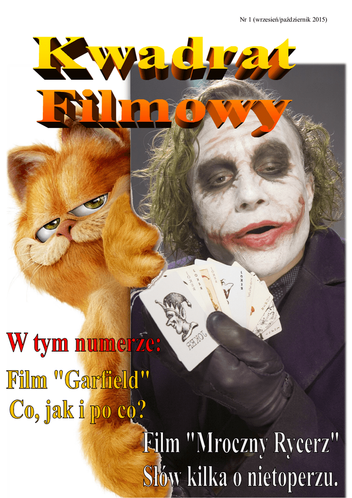 Nr 1 (wrzesień/październik 2015) Kwadrat filmowy (koło) Nasze koło (kwadrat) zostało założone w marcu 2015 roku. Co robimy: oglądamy filmy i omawiamy je, odgrywamy scenki i tworzymy film, który będzie reklamówką naszej szkoły. Co miesiąc będziemy wydawali gazetę, z której dowiecie się, co aktualnie „mamy na tapecie”. We wrześniu widzieliśmy dwa filmy: „Garfield” & „Batman – Mroczny Rycerz”. Pierwszy z nich to komedia, a drugi to akcja S-F. Czym jest komedia? Film przedstawiający sytuacje i postacie wywołujące u widzów efekt komiczny. Komedia istnieje od zarania dziejów sztuki filmowej – za pierwszy film komediowy uchodzi „Polewacz polany” (1895) autorstwa braci Lumière. Komedii nie cechuje określona konwencja fabularna, ale efekt, jaki wywołują one w widzu Garfield Garfield – popularny komiks stworzony przez Jima Davisa, którego bohaterem jest wylegujący się przed telewizorem, pożerający lasagnę tłusty, leniwy, rudy kocur, nazywany Garfieldem. Jego współtowarzyszami są: niezbyt rozgarnięty pies Odie oraz ich ułomny pod względem towarzyskim właściciel Jon Arbuckle. Kocur odziedziczył imię po dziadku Jima Davisa, który z kolei był tak nazwany dla upamiętnienia prezydenta Stanów Zjednoczonych Jamesa Garfielda. W 1978 roku komiks był drukowany w 41 gazetach, obecnie jest ich już ok. 2000 na całym świecie – w Polsce w „Gazecie Wyborczej”. W latach 90. wielką oglądalnością cieszyła się kreskówka „Garfield i przyjaciele”. W 2004 roku na ekrany wszedł pierwszy pełnometrażowy film o Garfieldzie, w którym zastosowano najnowsze wówczas techniki animacji komputerowej, wtapiające wirtualną postać Garfielda w grono rzeczywistych bohaterów. W 2008 roku zadebiutował nowy serial Garfield. Pierwszy długometrażowy film o tym nieznośnym kocie powstał w 2004 roku. Reżyserem filmu jest Peter Hewitt, a głosu głównemu bohaterowi użyczył Bill Murray. Film akcji (ang. action movie) − film sensacyjny, którego głównym zadaniem jest dostarczanie rozrywki widzom poprzez pokazywanie pościgów samochodowych, strzelanin, bijatyk i innych scen kaskaderskich o dużym ładunku napięcia i emocji. Najsłynniejszymi producentami filmów akcji są Amerykanie. Film akcji jest często łączony z innymi gatunkami takimi jak: fantastyka naukowa (Terminator), horror (Blade: Wieczny łowca) czy komedia (Zabójcza broń). Jako gatunek, film akcji, rozwinął się z filmu sensacyjnego i jest z nim często utożsamiany. Rozkwit kina akcji przypada na lata 80. XX wieku. Fantastyka naukowa (ang. science fiction) – gatunek literacki lub filmowy, a także gier komputerowych o fabule osnutej na przewidywanych osiągnięciach nauki i techniki oraz ukazującej ich wpływ na życie jednostki lub społeczeństwa. Razem z fantasy i horrorem, fantastyka naukowa zaliczana jest do fantastyki. Fantastyka naukowa najczęściej opisuje wydarzenia umiejscowione w przyszłości wobec czasów autora (lecz niekoniecznie) i opiera się na hipotetycznym rozwoju nauki i techniki. Utwór fantastycznonaukowy zawiera zwykle takie cechy jak: specyficzny typ czasoprzestrzeni, neologizmy związane z rozwojem techniki, kontakt z obcą cywilizacją, podróż w czasie, cudowne lub tragiczne skutki wynalazków technicznych i odkryć naukowych. Najważniejsza jest hipotetyczna zgodność wydarzeń ze współczesnym stanem wiedzy o nauce i technice. Najbardziej charakterystyczne motywy utworów fikcji naukowej to umiejscowienie akcji na innych planetach, zamknięcie jej na pokładzie statku kosmicznego, wędrówka w czasie, kontakt z obcą cywilizacją. Akcja utworów fikcji naukowej może się jednak również odbywać w całości na Ziemi w nieznacznie tylko zmodyfikowanych przewidywaniach realiów bliskiej nam przyszłości, czy też w czasie równoległym do naszej rzeczywistości. Bywa także, że spora część akcji toczy się w przeszłości. Fantastyką naukową zajmuje się nie tylko historia literatury i krytyka literacka, ale także socjologia, psychologia i futurologia. Wizje przyszłych światów są też interesujące z punktu widzenia politologii. BATMAN MROCZNY RYCERZ Batman (jego alter ego – Bruce Wayne) – fikcyjna postać (superbohater), znany z licznych serii komiksowych , wydawanych przez DC Comics, oraz z wszelkich adaptacji związanych z tą postacią. Po raz pierwszy postać Batmana pojawiła się w Detective Comics vol. 1 #27 w maju 1939 roku. Według wielu źródeł postać Batmana została stworzona wspólnie przez Boba Kane’a i Billa Fingera, lecz tylko Kane jest oficjalnie podawany jako autor. W zamyśle twórcy, Batman miał być pogromcą przestępczości, powstałym z kombinacji cech różnych bohaterów. Bob Kane wzorował się przede wszystkim na Zorro, którego znał z oglądanej w młodości ekranizacji jego przygód, zatytułowanej „Znak Zorro” z 1920 roku (stamtąd zaczerpnął ideę zamaskowane go, przystojnego mężczyzny jakim był Bruce Wayne). Innymi inspiracjami były dla niego Shadow i Drakula z filmowej adaptacji z 1931 (idea mrocznej postaci), postać złoczyńcy z filmu „The Bat Whispers” z 1930 roku (idea kostiumu nietoperza, idea batsygnału), Sherlock Holmes (idea błyskotliwego detektywa i stratega), jak również szkice skrzydłowca autorstwa Leonarda da Vinci. Imię alter ego Batmana – Bruce zostało zainspirowane postacią króla Szkocji Roberta I Bruce’a, zaś nazwisko rodowe – Wayne pochodzi od bohatera rewolucji amerykańskiej – Anthony’ego Wayne’a. Oryginalnie był nazywany "The Bat-man" lub "The Batman", w Polsce znany również jako "człowieknietoperz", posiada także przydomki: The Caped Crusader (Krzyżowiec w pelerynie), The Dark Knight (Mroczny Rycerz), oraz The World's Greatest Detective (Największy Detektyw Świata). Serię filmów o Batmanie zapoczątkował reżyser Tim Burton. Stworzył on dwa filmy : "Batman" i "Powrót Batmana". Kolejne dwie części w