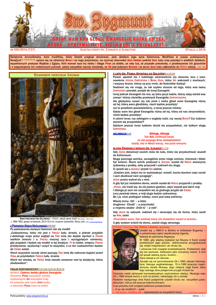 GDYBY WAM KTO GŁOSIŁ EWANGELIĘ RÓŻNĄ OD TEJ, KTÓRĄ OTRZYMALIŚCIE, NIECH BĘDZIE PRZEKLĘTY!…« » […] NR XXII/2016 (737) GAZETKA PARAFII ŚW. ZYGMUNTA W SŁOMCZYNIE 29 MAJA AD 2016 Świątynia Jerozolimska, dom modlitwy, który Dawid pragnął zbudować, [jest] dziełem jego syna Salomona. Modlitwa w czasie poświęcenia Świątynipor. 1 Krl 8, 10, 61 opiera się na obietnicy BOGA i na Jego przymierzu, na czynnej obecności JEGO IMIENIA pośród JEGO ludu oraz pamięci o wielkich dziełach, wypełnionych podczas Wyjścia z Egiptu. Król wznosi ręce ku niebu i błaga PANA za siebie, za cały lud, za przyszłe pokolenia, o przebaczenie ich grzechów i o zaspokojenie ich codziennych potrzeb, ażeby wszystkie narody wiedziały, że ON jest jedynym BOGIEM i że serce JEGO ludu całkowicie do NIEGO należy. [KKK, 2580] DZIEWIĄTA NIEDZIELA ZWYKŁA Z LISTU ŚW. PAWŁA APOSTOŁA DO GALATÓWGa 1, 1-2. 6-10 Paweł, apostoł nie z ludzkiego ustanowienia czy zlecenia, lecz z ustanowienia JEZUSA CHRYSTUSA i BOGA OJCA, który GO wskrzesił z martwych, i wszyscy bracia, którzy są przy mnie, do Kościołów Galacji: Nadziwić się nie mogę, że tak szybko chcecie od tego, który was łaską CHRYSTUSA powołał, przejść do innej Ewangelii. Innej jednak Ewangelii nie ma; są tylko jacyś ludzie, którzy sieją wśród was zamęt i którzy chcieliby przekręcić Ewangelię CHRYSTUSOWĄ. Ale gdybyśmy nawet my lub anioł z nieba głosił wam Ewangelię różną od tej, którą wam głosiliśmy, niech będzie przeklęty! Już to przedtem powiedzieliśmy, a teraz jeszcze mówię: Gdyby wam kto głosił Ewangelię różną od tej, którą od nas otrzymaliście, niech będzie przeklęty! A zatem teraz: czy zabiegam o względy ludzi, czy raczej BOGA? Czy ludziom staram się przypodobać? Gdybym jeszcze teraz ludziom chciał się przypodobać, nie byłbym sługą CHRYSTUSA. AKLAMACJAJ 3, 16 Alleluja, Alleluja Tak BÓG umiłował świat, że dał swojego SYNA JEDNORODNEGO; każdy, kto w NIEGO wierzy, ma życie wieczne. SŁOWA EWANGELII WEDŁUG ŚW. ŁUKASZAŁk 7, 1-10 Gdy JEZUS dokończył swoich mów do ludu, który się przysłuchiwał, wszedł do Kafarnaum. Sługa pewnego setnika, szczególnie przez niego ceniony, chorował i bliski był śmierci. Skoro setnik posłyszał o JEZUSIE, wysłał do NIEGO starszyznę żydowską z prośbą, żeby przyszedł i uzdrowił mu sługę. Ci zjawili się u JEZUSA i prosili GO usilnie: „Godzien jest, żebyś mu to wyświadczył, mówili, kocha bowiem nasz naród i sam zbudował nam synagogę”. JEZUS przeto wybrał się z nimi. A gdy był już niedaleko domu, setnik wysłał do NIEGO przyjaciół z prośbą: „PANIE, nie trudź się, bo nie jestem godzien, abyś wszedł pod dach mój. I dlatego ja sam nie uważałem się za godnego przyjść do CIEBIE. Lecz powiedz słowo, a mój sługa będzie uzdrowiony. Bo i ja, choć podlegam władzy, mam pod sobą żołnierzy. ok. SWIĄTYNNA MODLITWA SALOMONA —TISSOT, Jakub Jacek Józef (1836, Nantes – 1902, Doubs) 1896-1902, gwasz na kartonie, 26.2×19.2 cm, museum żydowskie, Nowy Jork; źródło: commons.wikimedia.org Z PIERWSZEJ KSIĘGI KRÓLEWSKIEJ1 Krl 8, 41-43 Po poświęceniu świątyni Salomon tak się modlił: „Cudzoziemca, który nie jest z TWEGO ludu, Izraela, a jednak przyjdzie z dalekiego kraju przez wzgląd na TWE imię (bo będzie słychać o TWOIM wielkim imieniu i o TWOJEJ mocnej ręce i wyciągniętym ramieniu), gdy przyjdzie i będzie się modlić w tej świątyni, TY w niebie, miejscu TWEGO przebywania, wysłuchaj i uczyń to wszystko, o co ten cudzoziemiec będzie do CIEBIE wołać. Niech wszystkie narody ziemi poznają TWE imię dla nabrania bojaźni przed TOBĄ za przykładem TWEGO ludu, Izraela. Niech też wiedzą, że TWOJE imię zostało wezwane nad tą świątynią, którą zbudowałem”. PSALM RESPONSORYJNYPs 117 (116), 1-2 (R.: por. Mk 16, 15) REFREN: Całemu światu głoście Ewangelię Chwalcie PANA wszystkie narody, wysławiajcie GO wszystkie ludy, bo potężna nad nami JEGO łaska, a wierność PANA trwa na wieki. Portal parafialny: www.swzygmunt.knc.pl Mówię temu: ‘Idź’ – a idzie; drugiemu: ‘Chodź’ – a przychodzi; a mojemu słudze: ‘Zrób to’ – a robi”. Gdy JEZUS to usłyszał, zadziwił się i zwracając się do tłumu, który szedł za NIM, rzekł: »Powiadam wam: Tak wielkiej wiary nie znalazłem nawet w Izraelu«. A gdy wysłani wrócili do domu, zastali sługę zdrowego. PATRON TYGODNIA: ŚW. KAROL LWANGA, MĘCZENNIK. Urodził się ok. 1860-5 w Bulimu w królestwie Bugandy – w południowej części współczesnej Ugandy. Należał do plemienia Nagweya. W 1885, gdy władcą (kabaka) był Mwana II Karol został przełożonym jego paziów. Jednocześnie przygotowywał się, dzięki misjonarzom, do chrztu św. I wówczas król rozpętał prześladowania. Problemem stali się owi paziowie, traktowani jako monarszy harem. A król był wszak władcą życia i śmierci… Karol stanął w ich obronie… Zaczęło się od zamordowania 29.X.1885 Jakuba Hanningtona, biskupa anglikańskiego. 15.XI.1885 stracono majordomusa Józefa Mukasę Jego miejsce zajął Karol, który tego samego dnia potajemnie przyjął chrzest św. Paziowie nadal odmawiali homoseksualnym zachciankom władcy. Mwanga więc 25.V.1886 skazał dwóch z nich na śmierć, oskarżając ich o zdradę. Rankiem następnego dnia Karol potajemnie udzielił chrztu św. wszystkim podopiecznym, którzy byli jeszcze katechumenami. A po południu król urządził publiczne przesłuchanie. – A wy się modlicie? – pytał. – Tak panie, modlimy się – odpowiedział za wszystkich Karol. dokończenie na odwrocie strona — 1 — N N R X X NR RX XX XIIIIII///222000111666(((777333777))) INFORMACJE PARAFIALNE 30–31.V: Ostatnie w tym roku NABOŻEŃSTWA MAJOWE ku czci NAJŚWIĘTSZEJ MARYI PANNY o 1730: Po nabożeństwach – Msza św. Zachęcamy! również do utrzymania tradycji śpiewania Litanii L