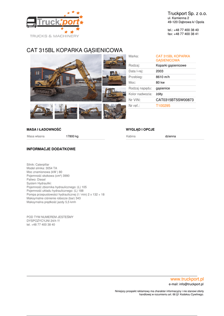 Truckport Sp. z o.o. ul. Kamienna 2 49-120 Dąbrowa k/ Opola tel.: +48 77 400 38 40 fax: +48 77 400 38 41 CAT 315BL KOPARKA GĄSIENICOWA MASA I ŁADOWNOŚĆ Masa własna Marka: CAT 315BL KOPARKA GĄSIENICOWA Rodzaj: Koparki gąsienicowe Data I-rej: 2003 Przebieg: 8610 m/h Moc: 80 kw Rodzaj napędu: gąsienice Kolor nadwozia: żółty Nr VIN: CAT0315BT5SW00873 Nr ref.: T100295 WYGLĄD I OPCJE 17800 kg Kabina dzienna INFORMACJE DODATKOWE Silnik: Caterpillar Model silnika: 3054 TA Moc znamionowa (kW ) 80 Pojemność skokowa (cm³) 3990 Paliwo: Diesel System Hydrauliki: Pojemność zbiornika hydraulicznego: (L) 105 Pojemność układu hydraulicznego: (L) 188 Pompa przepustowości hydraulicznej (l / min) 2 x 132 + 18 Maksymalne ciśnienie robocze (bar) 343 Maksymalna prędkość jazdy 5,5 kmh POD TYM NUMEREM JESTEŚMY DYSPOZYCYJNI 24/h !!! tel. +48 77 400 38 40 www.truckport.pl e-mail: [email protected] Niniejszy prospekt reklamowy ma charakter informacyjny i nie stanowi oferty handlowej w rozumieniu art. 66 §1 Kodeksu Cywilnego. Powered by TCPDF (www.tcpdf.org)