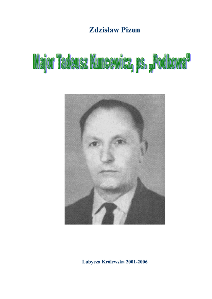 Zdzisław Pizun Lubycza Królewska 2001-2006 PRZEDMOWA Niniejszy tekst został napisany przez autora jedynie w celu przygotowania uczniów Zespołu Szkół w Lubyczy Królewskiej do Konkursu Wiedzy o Armii Krajowej i majorze Tadeuszu Kuncewiczu. Na opracowanie czeka biografia majora Tadeusza Kuncewicza z dokładnym opisem bohaterskich czynów dokonanych przez niego i jego Ŝołnierzy podczas lat okupacji. W Konkursie wzięło udział 36 uczniów klas szóstych Szkoły Podstawowej im. gen. Nikodema Sulika i pierwszych Publicznego Gimnazjum. Finał Konkursu odbył się 7 maja 2001 r. Zwycięzcami zostali: 1 miejsce – Zenon Kozak (I „c” Gimnazjum), 2 miejsce – Rafał Wielgosz (VI „a” Szkoła Podstawowa), 3 miejsce – Aneta Zatorska (I „a” Gimnazjum). Patronem zbiorowym Szkoły Podstawowej im. gen. Nikodema Sulika w Lubyczy Królewskiej jest StraŜ Graniczna. Przez cały czas istnieje ścisła współpraca pomiędzy Zespołem Szkół a NadbuŜańskim Oddziałem StraŜy Granicznej im. 27 Wołyńskiej Dywizji Armii Krajowej w Chełmie. Zespół Szkół, w skład którego wchodzi Szkoła Podstawowa, od samego początku popierał pomysł nadania imienia majora Tadeusza Kuncewicza ps. „Podkowa” StraŜnicy StraŜy Granicznej w Lubyczy Królewskiej. W uzasadnieniu napisano: „W związku z tym, Ŝe patronem naszej szkoły jest StraŜ Graniczna, chcielibyśmy kultywować wśród uczniów, a szczególnie harcerzy, tradycje związane z obroną naszych granic. ZaleŜy nam równieŜ na ukazaniu bohaterskich postaw Ŝołnierzy walczących na naszym terenie. Pomogłoby to nam w realizacji stawianych przez szkołę celów wychowawczych”1. Autor składa serdeczne podziękowanie dyrektorowi Zespołu Szkół w Lubyczy Królewskiej – Panu mgr Jerzemu Głąbowi, Naczelnikowi Wydziału Prezydialnego NadbuŜańskiego Oddziału StraŜy Granicznej – Panu mjr Stanisławowi Dubajowi oraz komendantowi StraŜnicy StraŜy Granicznej w Lubyczy Królewskiej – Panu kpt. Mariuszowi Ziembińskiemu. Uroczyste nadanie imienia majora Tadeusza Kuncewicza StraŜnicy StraŜy Granicznej w Lubyczy Królewskiej miało miejsce 25 maja 2001 r. Niewielkie poprawki naniósł autor w roku 2006. Autor 1 Pismo z 10 listopada 2000 r. do majora Marka Dominiaka, Komendanta NadbuŜańskiego Oddziału StraŜy Granicznej w Chełmie, wystosowane w imieniu mgr Zenona Garbarza, Dyrektora GOS w Lubyczy Królewskiej, mgr Jerzego Głąba, Dyrektora Zespołu Szkół oraz mgr Zdzisława Pizuna, nauczyciela historii w Zespole Szkół. „PODKOWA” – WZÓR MŁODZIEśY Tadeusz Kuncewicz, ps. „Wierny”, „Kmicic”, „Podkowa”, „Feliks” był niezwykłą postacią w zamojskim ruchu oporu. Na Zamojszczyźnie cieszył się ogromną wprost popularnością, a wokół jego osoby wytworzyła się legenda, którą zdobył dzięki temu, Ŝe był znakomitym Ŝołnierzem – dowódcą i gorliwym patriotą. Dał temu wyraz dr Zygmunt Klukowski w swoim „Dzienniku z lat okupacji”: „KrąŜą opowieści o róŜnych wyczynach oddziałów leśnych, powstają legendy. DuŜo mówi się o niektórych dowódcach, o „Podkowie”, o „Gromie”, o ich nieustraszonej odwadze, zimnej krwi podczas akcji itp. śycie na wolności, w lesie, w oczach młodzieŜy nabiera uroku...”2. Młody, ambitny oficer wykazywał się duŜymi umiejętnościami dowódczymi. Cechowała go odwaga, brawura bojowa oraz znakomita taktyka prowadzenia walki partyzanckiej, która była przykładem dla wszystkich oddziałów leśnych. Potrafił umiejętnie dowodzić wieloma jednostkami partyzanckimi biorącymi udział w jednej akcji dywersyjnej. Akcje pod jego dowództwem kończyły się przy niewielkich stratach własnych. Jego otwarta postawa oraz poczucie humoru zyskiwały mu sympatię Ŝołnierzy. Szczególnie pozytywną ocenę zyskuje z powodu prześladowań przez komunistyczny reŜim. Bohatersko walcząc o „Wolną Polskę”, po wojnie prawie 10 lat spędził w więzieniu. Uwolniony w 1955 r. „Podkowa” w środowiskach byłych Ŝołnierzy AK na Zamojszczyźnie spotkał się z przyjęciem godnym bohatera narodowego3. Dzięki jego bohaterstwu i ofiarności moŜe stać się on dzisiaj wzorem postępowania dla poszukującej autorytetów młodzieŜy, zwłaszcza harcerzy. Właśnie szczególnie ta wybitna postać ruchu oporu powinna trafić do młodego pokolenia. Widoczne to jest w charakterystyce „Podkowy” napisanej przez Bronisława Waludę: „MłodzieŜ chętnie garnęła się do oddziału Tadeusza Kuncewicza ps. „Podkowa” dowódcy mądrego, odwaŜnego, z „charyzmą”, uwielbianego przez podwładnych. Brawurowe akcje przyniosły sławę dowódcy i Ŝołnierzom jego oddziału. Był to oddział z duŜą ilością uczniów...”4. Kpt. Stanisław Prus („Adam”), dowódca OP-9, napisał następującą charakterystykę „Podkowy”: „Brunet, przystojny, wzrost jak Norbert. Chód elastyczny. Z urody i zachowania – typ buńczuczny. Umysł jasny, ale mało ścisły. Ryzykant i szczęściarz. Ma bardzo duŜą ambicję. Jest ona motorem wielu czynów [...]. Obliczać nie lubi, ale na kaŜdą robotę ryzykowną jedzie bez zastrzeŜeń i z humorem. Jest bardzo lubiany przez Ŝołnierzy. Wytworzyła się koło niego legenda, która towarzyszy mu od pewnego czasu. W OP-9 ma swoje miejsce, sławę i miłość. Młody oficer – jak juŜ swego czasu o nim napisano – jest lubiany przez wszystkich; karny i przywiązany do przełoŜonych. Jednostka bardzo ideowa i pełna poświęceń. Fizycznie wytrzymały”5. Podobną charakterystyką „Podkowy” spisała w swym pamiętniku przybyła do oddziału partyzanckiego na wiosnę 1943 r. dr Helena Poradowska, ps. „Helena”: „...pewnego razu przybył goniec z Kawęczyna z wiadomością, Ŝe Niemcy są we wsi i kaŜą się prowadzić do lasu. W obozie zarządzono alarm. „Podkowa” wydał rozkazy. W krótkim baranim koŜuchu, z maszynowym pistoletem na ramieniu wyglądał jakby szykowała się dla 