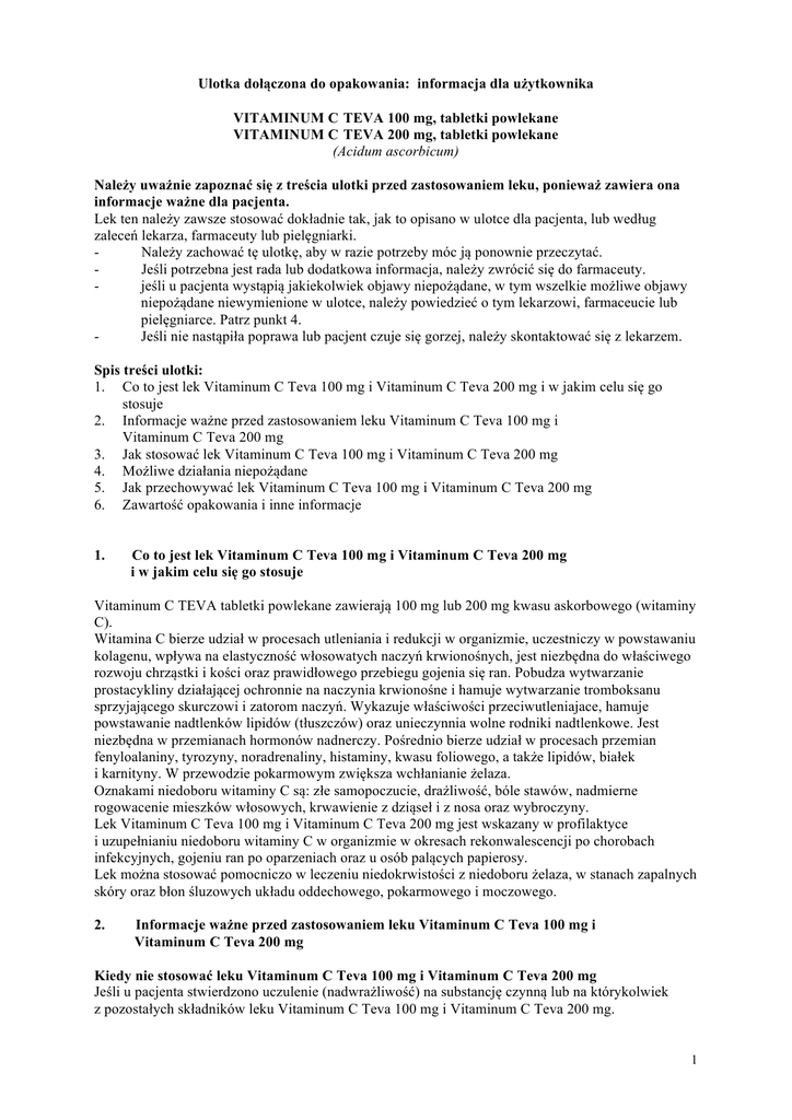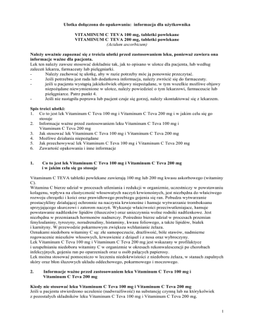 Ulotka dołączona do opakowania: informacja dla użytkownika VITAMINUM C TEVA 100 mg, tabletki powlekane VITAMINUM C TEVA 200 mg, tabletki powlekane (Acidum ascorbicum) Należy uważnie zapoznać się z treścia ulotki przed zastosowaniem leku, ponieważ zawiera ona informacje ważne dla pacjenta. Lek ten należy zawsze stosować dokładnie tak, jak to opisano w ulotce dla pacjenta, lub według zaleceń lekarza, farmaceuty lub pielęgniarki. Należy zachować tę ulotkę, aby w razie potrzeby móc ją ponownie przeczytać. Jeśli potrzebna jest rada lub dodatkowa informacja, należy zwrócić się do farmaceuty. jeśli u pacjenta wystąpią jakiekolwiek objawy niepożądane, w tym wszelkie możliwe objawy niepożądane niewymienione w ulotce, należy powiedzieć o tym lekarzowi, farmaceucie lub pielęgniarce. Patrz punkt 4. Jeśli nie nastąpiła poprawa lub pacjent czuje się gorzej, należy skontaktować się z lekarzem. Spis treści ulotki: 1. Co to jest lek Vitaminum C Teva 100 mg i Vitaminum C Teva 200 mg i w jakim celu się go stosuje 2. Informacje ważne przed zastosowaniem leku Vitaminum C Teva 100 mg i Vitaminum C Teva 200 mg 3. Jak stosować lek Vitaminum C Teva 100 mg i Vitaminum C Teva 200 mg 4. Możliwe działania niepożądane 5. Jak przechowywać lek Vitaminum C Teva 100 mg i Vitaminum C Teva 200 mg 6. Zawartość opakowania i inne informacje 1. Co to jest lek Vitaminum C Teva 100 mg i Vitaminum C Teva 200 mg i w jakim celu się go stosuje Vitaminum C TEVA tabletki powlekane zawierają 100 mg lub 200 mg kwasu askorbowego (witaminy C). Witamina C bierze udział w procesach utleniania i redukcji w organizmie, uczestniczy w powstawaniu kolagenu, wpływa na elastyczność włosowatych naczyń krwionośnych, jest niezbędna do właściwego rozwoju chrząstki i kości oraz prawidłowego przebiegu gojenia się ran. Pobudza wytwarzanie prostacykliny działającej ochronnie na naczynia krwionośne i hamuje wytwarzanie tromboksanu sprzyjającego skurczowi i zatorom naczyń. Wykazuje właściwości przeciwutleniajace, hamuje powstawanie nadtlenków lipidów (tłuszczów) oraz unieczynnia wolne rodniki nadtlenkowe. Jest niezbędna w przemianach hormonów nadnerczy. Pośrednio bierze udział w procesach przemian fenyloalaniny, tyrozyny, noradrenaliny, histaminy, kwasu foliowego, a także lipidów, białek i karnityny. W przewodzie pokarmowym zwiększa wchłanianie żelaza. Oznakami niedoboru witaminy C są: złe samopoczucie, drażliwość, bóle stawów, nadmierne rogowacenie mieszków włosowych, krwawienie z dziąseł i z nosa oraz wybroczyny. Lek Vitaminum C Teva 100 mg i Vitaminum C Teva 200 mg jest wskazany w profilaktyce i uzupełnianiu niedoboru witaminy C w organizmie w okresach rekonwalescencji po chorobach infekcyjnych, gojeniu ran po oparzeniach oraz u osób palących papierosy. Lek można stosować pomocniczo w leczeniu niedokrwistości z niedoboru żelaza, w stanach zapalnych skóry oraz błon śluzowych układu oddechowego, pokarmowego i moczowego. 2. Informacje ważne przed zastosowaniem leku Vitaminum C Teva 100 mg i Vitaminum C Teva 200 mg Kiedy nie stosować leku Vitaminum C Teva 100 mg i Vitaminum C Teva 200 mg Jeśli u pacjenta stwierdzono uczulenie (nadwrażliwość) na substancję czynną lub na którykolwiek z pozostałych składników leku Vitaminum C Teva 100 mg i Vitaminum C Teva 200 mg. 1 Nie należy podawać dużych dawek (powyżej 1 g na dobę) chorym z kamicą dróg moczowych lub z nadmiernym wydalaniem szczawianów przez nerki. Ostrzeżenia i środki ostrożności Jeśli u pacjenta stwierdzono hemochromatozę, niedokrwistość syderoblastyczną oraz talasemię (choroby, którym towarzyszą zaburzenia gospodarki żelazem) należy zachować ostrożność ze względu na to, że kwas askorbowy nasila wchłanianie żelaza. U osób z niedoborem krwinkowej dehydrogenazy glukozo-6-fosforanowej (genetycznie uwarunkowany brak tego enzymu w krwinkach czerwonych), długotrwałe podawanie może być przyczyną niedokrwistości hemolitycznej. Długotrwałe podawanie dużych dawek kwasu askorbowego u osób z kamicą dróg moczowych powoduje tworzenie i odkładanie się złogów w nerkach. Kwas askorbowy uczestniczy w reakcjach oksydacyjno-redukcyjnych, duże dawki leku mogą wpływać na wyniki chemicznych reakcji utleniania i redukcji. Dlatego przed wykonaniem analiz krwi i moczu należy zalecić, by pacjent nie przyjmował leków zawierających kwas askorbowy przez przynajmniej 1 dobę. Pozwoli to uniknąć możliwych błędów w rozpoznaniu (np. maskowanie obecności krwi utajonej w stolcu, wzrost stężenia bilirubiny w surowicy krwi, obecność cukru w moczu, zmniejszenie aktywności w surowicy krwi enzymów takich jak: AlAT, AspAT, LDH; obniżenie pH moczu). Wyniki oznaczeń stężenia cukru w moczu u chorych na cukrzycę mogą być zafałszowane w przypadku przyjmowania dużych dawek witaminy C. Przed zastosowaniem leku należy poradzić się lekarza u pacjentów z niewydolnością nerek. Długotrwałe podawanie dużych dawek kwasu askorbowego może wywołać objawy zatrucia. Rozpoznanie następuje na podstawie badań laboratoryjnych i objawów klinicznych takich jak utrudnione i bolesne oddawanie moczu oraz krwiomocz. Lek Vitaminum C Teva 100 mg i Vitaminum C Teva 200 mg a inne leki Należy powiedzieć lekarzowi o wszystkich przyjmowanych ostatnio lekach, również tych, które wydawane są bez recepty. Kwas askorbowy nasila wchłanianie przyjmowanych jednocześnie związków żelaza. Przy równoczesnym podawaniu leków kwasu acetylosalicylowego i kwasu askorbowego obserwuje się wzrost wydalania kwasu askorbowego, a zmniejszenie wydalania kwasu acetylosalicylowego. Kwas askorbowy zwiększa szybkość usuwania z organizmu trójpierścieniowych leków przeciwdepresyjnych i amfetaminy, zmniejsza skuteczność pochodnych fenotiazyny (leki przeciwuczuleniowe i stosowane w psychiatrii), antybiotyków aminoglikozydowych (np. gentamicyna, amikacyna), zwiększa stęż