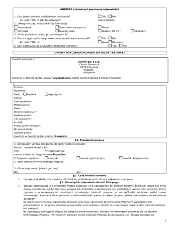 ANKIETA (zaznaczyć poprawną odpowiedź) 1. Czy jesteś obecnie właścicielem motocykla? Tak 1a. Jeśli TAK, to jaki to motocykl? Nie Rok produkcji 2. Jakiego rodzaju motocykle Cię interesują: Supersport Sportowo-turystyczne Street Off-road Skutery maxi Skutery 50 cm³ Choppery 3. Ile lat posiadasz prawo jazdy kategorii A? 4. Czy w ciągu najbliższego roku masz zamiar kupić motocykl? 4a. Jeśli TAK, to: Tak Nie Nowy Używany 5. Czy interesują Cię oryginalne akcesoria Yamaha? Tak Nie UMOWA UŻYCZENIA POJAZDU DO JAZDY TESTOWEJ zawarta pomiędzy: DDPro Sp. z o.o. Carrer Everest,4 03724 Teulada Alicante Hiszpania zwanym w dalszej części umowy Użyczającym. Osoba reprezentująca Tomasz Trautman a Imiona: Nazwisko: Płeć: kobieta mężczyzna Adres: Kod pocztowy: Miejscowość: Pesel: Dowód osobisty nr: wydany przez: Tel. prywatny: E-mail: Prawo jazdy kategorii: Nr prawa jazdy: wydane przez: zwanym w dalszej części umowy Biorącym §1. Przedmiot umowy 1. Użyczający użycza Biorącemu do jazdy testowej pojazd: Marka: Yamaha Model / Typ: VIN: Nr rejestracyjny: zwany w dalszym ciągu umowy Pojazdem Z Pojazdem wydano: kluczyki dowód rejestracyjny dowód ubezpieczenia 2. Stan techniczny wydawanego Pojazdu: 3. Okres użyczenia: (data i godzina) Od: do: §2. Czas trwania umowy 1. Umowa jest skutecznie zawarta od chwili jej podpisania przez Strony wskazane w umowie. §3. Obowiązki i odpowiedzialność Biorącego 1. Biorący zobowiązuje się prowadzić Pojazd osobiście i nie udostępniać go osobom trzecim. Biorącym może być tylko osoba pełnoletnia, osoba fizyczna, prawna lub jednostka organizacyjna nie posiadająca osobowości prawnej, której zgodnie z obowiązującymi przepisami przysługuje zdolność prawna, w szczególności osobowe spółki prawa handlowego. Kierowca musi posiadać i udokumentować ważne w całym okresie testów uprawnienia do kierowania pojazdem: a) celem potwierdzenia tożsamości kierowcy oraz jego uprawnień do kierowania Pojazdem wymagane jest przestawienie w oryginale ważnego prawa jazdy oraz jednego z dwóch ze wskazanych dokumentów (dowód osobisty lub paszport). b) Użyczający udostępnia Pojazd do oględzin przed wydaniem. Biorący ma obowiązek zapoznać się ze stanem technicznym Pojazdu i we własnym zakresie ocenić zdolność Pojazdu do poruszania się. Biorący porusza się 1 Pojazdem wyłącznie na swoją odpowiedzialność. Przy wydaniu Pojazdu sporządzony zostanie protokół który określa stan Pojazdu w chwili przekazania go Biorącemu. W przypadku odmowy lub niemożności podpisana protokołu przez Biorącego uważa się że stan techniczny Pojazdu jest zgodny z opisem podanym przez Użyczającego. c) Biorący zobowiązany jest do korzystania z Pojazdu zgodnie z przeznaczeniem w sposób określony w instrukcji obsługi z zachowaniem należytej staranności w zakresie eksploatacji Pojazdu. A w szczególności do: - zabezpieczania Pojazdu przed kradzieżą - pozostawiania Pojazdu wyłącznie na parkingach strzeżonych lub miejscach monitorowanych - wykonywania kontroli sprawności oświetlenia - kontroli ciśnienia w ogumieniu i stanu ogumienia - przestrzegania obowiązujących przepisów ruchu drogowego 2. Pojazd nie może być podnajmowany, użyczany jak i oddany w posiadanie jakimkolwiek osobom trzecim. 3. W razie awarii Pojazdu Biorący zobowiązany jest bezzwłocznie powiadomić o tym fakcie Użyczającego i postępować zgodnie z jego zaleceniami. 4. Za wszelkie wykroczenia drogowe powstałe w czasie trwania umowy odpowiedzialność ponosi Biorący. 5. Biorący wyraża zgodę na udostępnienie jego danych organom bezpieczeństwa, tj. policji oraz innym służbom mającym uprawnienia do legitymowania lub kontroli pojazdu. 6. Użyczający nie ponosi odpowiedzialności za rzeczy przewożone lub pozostawione w pojeździe a także za straty spowodowane wadą mechaniczną Pojazdu czy też jego wyposażenia. 7. Użyczający nie ponosi odpowiedzialności za jakiekolwiek straty spowodowane awarią Pojazdu wynikającą z nieprawidłowej obsługi Pojazdu, nieprawidłową techniką jazdy Pojazdem lub nie zachowania zasad bezpieczeństwa w ruchu drogowym. 8. Biorący potwierdza, że został mu udzielony instruktaż użytkowania Pojazdów mechanicznych, w tym motocykli, skuterów Yamaha, który w pełni rozumie i do którego będzie się stosował w trakcie użytkowania Pojazdu. Biorący z pełną świadomością ryzyka wynikającego z używania pojazdów mechanicznych, w tym motocykli, skuterów Yamaha, zobowiązuje się do przestrzegania poleceń instruktora, używania Pojazdu zgodnie z jego przeznaczeniem i zachowania szczególnej ostrożności w czasie użytkowania użyczonego Pojazdu. 9. Biorący oświadcza, że nie znajduje się w stanie nietrzeźwości, pod wpływem środków odurzających ani leków mogących pogorszyć jego zdolność do kierowania pojazdami mechanicznymi. 10. Biorący osobiście odpowiada za naruszenie przepisów o ruchu drogowym. 11. W razie nieszczęśliwych wypadków zaistniałych z winy Biorącego lub na skutek nieprzestrzegania wskazówek instruktorów Biorący zrzeka się wszelkich roszczeń o charakterze majątkowym i niemajątkowym wobec Użyczającego, przyjmując całą odpowiedzialność za ewentualne zaistniałe zdarzenia tylko i wyłącznie na siebie. 12. Biorący jest odpowiedzialny za wszelkie szkody powstałe z winy umyślnej, niedbalstwa lub lekkomyślności oraz za przypadkową utratę lub uszkodzenie Pojazdu, jeżeli go używa w sposób sprzeczny z umową, z jego właściwościami lub przeznaczeniem, albo gdy nie będąc do tego upoważniony przez umowę ani zmuszony przez okoliczności powierza Pojazd innej osobie. 13. Biorący zobowiązuje się do zapoznania się i do przestrzegania ogólnych i szczególnych warunków ubezpieczenia Pojazdu oraz ponosi wszelkie konsekwencje wynikające z ich nieprzestrzegania przez Biorącego. 14. Biorący ponosi pełną odpowiedzialność za uszkodzenie, utr