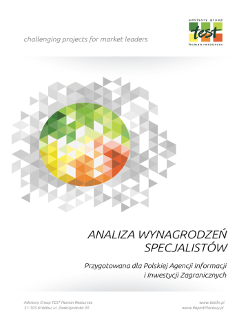 ANALIZA WYNAGRODZEŃ SPECJALISTÓW Przygotowana dla Polskiej Agencji Informacji i Inwestycji Zagranicznych Spis treści Ocena koniunktury oraz rynku pracy na początku 2015 roku ................. 4 Podwyżki i wynagrodzenia w ujęciu regionalnym ...................................... 5 Wynagrodzenia w ujęciu branżowym .......................................................... 7 Wynagrodzenia w firmach o różnej strukturze pochodzenia kapitału .... 8 Wynagrodzenia w firmach o różnej wielkości zatrudnienia ..................... 9 Dodatki pozapłacowe................................................................................... 10 Advisory Group TEST Human Resources .................................................... 12 Inicjatywy TESTu ........................................................................................... 13 Raport Płacowy ............................................................................................. 14 Kontakt w sprawie współpracy................................................................... 15 2 / 15 Misja Advisory Group TEST Human Resources Wspieramy Klientów wiedzą ekspercką i doświadczeniem poprzez wdrażanie innowacyjnych, profesjonalnych rozwiązań z zakresu zarządzania zasobami ludzkimi. Kluczem do sukcesu są wyjątkowi Pracownicy, którzy z pasją i zaangażowaniem wykorzystują swoje umiejętności realizując projekty na najwyższym poziomie. 3 / 15 Ocena koniunktury oraz rynku pracy na początku 2015 roku Początek 2015 roku przyniósł kolejne wzrosty na rynku pracy w porównaniu do tego samego okresu w 2014 roku oraz pozytywne zmiany w postrzeganiu całej gospodarki. Koniunktura jest oceniana przez przedsiębiorców pozytywnie, na co wskazują dane pochodzące z GUS z maja. Przedstawiciele prawie każdego sektora utrzymali optymistyczne opinie. Wyjątkiem są podmioty prowadzące działalność w budownictwie, mimo, że oceniają koniunkturę pesymistycznie to od stycznia br. zdecydowanie zmniejszają negatywne postrzeganie gospodarki. Analizując sytuację na rynku pracy nie można zapomnieć o poziomie bezrobocia. Średnia stopa bezrobocia w pierwszych czterech miesiącach 2015 roku w Polsce kształtowała się na poziomie 7,98%. Jest to zdecydowanie poniżej średniej stopy bezrobocia w tym okresie na terytorium całej Unii Europejskiej, w której wskaźnik ten wynosi 9,75%. Bezrobocie w Polsce utrzymuje się na poziomie niższym lub równym bezrobociu w Unii Europejskiej już od maja 2010 roku (źródło: Eurostat). Sytuacja specjalistów na rynku pracy również uległa poprawie, w porównaniu z tym samym okresem w roku poprzednim. Wzrósł zarówno procent pracodawców szukających pracowników, jak i procent specjalistów deklarujących chęć zmiany pracy. Stosunek firm, które planują lub przeprowadzają rekrutacje, do firm, które redukują etaty wynosi 5,38, co wskazuje na dobrą kondycję polskiego rynku pracy. Zauważalna jest również zmiana wartości czynników, które mają wpływ na bezpośrednią motywację pracownika (zarówno do zmiany, jak i pozostania w obecnej firmie). Aspekty finansowe tracą na rzecz możliwości poszerzania kompetencji oraz uczestniczenia w nowych projektach. Największą dynamiką zatrudnienia może pochwalić się sektor SSC/BPO, który nadal niezwykle intensywnie rozwija się w Polsce. Świadczą o tym nowe inwestycje zagraniczne, które lokowane są głównie w dużych miastach – Krakowie, Warszawie, Wrocławiu, Poznaniu. Powstaje coraz więcej inicjatyw zrzeszających społeczność outsourcingową, między innymi Ogólnopolskie Forum Managerów i Kluczowych Specjalistów HR w Centrach Usług Biznesowych i IT. 4 / 15 Podwyżki i wynagrodzenia w ujęciu regionalnym Dane, na których została przeprowadzona poniższa analiza zostały zebrane na dzień 31 stycznia 2015 roku podczas badania Raport Płacowy, przeprowadzonego przez Advisory Group TEST Human Resources. Poniższa grafika przedstawia rozkład podwyżek, jakie zostały lub zostaną zrealizowane w 2015 roku. Zdecydowanie rzuca się w oczy wartość 5,07%, jaką możemy zaobserwować na Podlasiu oraz procent podwyżek w województwie łódzkim, który jest najniższy w porównaniu do reszty województw (1,94%). Różnica pomiędzy najniższymi a najwyższymi podwyżkami to 3,13 p.p. Mnożąc tę wartość przez średnie wynagrodzenie specjalistów w Polsce otrzymamy kwotę 155 zł, która wskazuje nam, ile średnio różnią się podwyżki w województwie przyznającym ich największą wartość, w porównaniu do województwa udzielającego najniższe. Rysunek 1. Średnia wartość podwyżek dla specjalistów w poszczególnych województwach. Źródło: Analiza Podwyżek Advisory Group TEST Human Resources, edycja Wiosna 2015. 5 / 15 Poniższy wykres przedstawia mediany wynagrodzeń dla czterech szczebli specjalistów. W zależności od wymaganego poziomu doświadczenia, wiedzy i samodzielności wyróżniliśmy: młodszych, typowych, starszych oraz wiodących specjalistów. Żadne z województw nie może pochwalić się najwyższymi wynagrodzeniami jednocześnie na wszystkich poziomach zaszeregowania specjalistów. Na lidera wyrasta województwo wielkopolskie ze średnią płacą dla specjalistów wynoszącą 5550 zł, choć zaraz za nim plasują się województwa mazowieckie oraz małopolskie, ze średnimi wynagrodzeniami dla specjalistów rzędu 5384 zł oraz 5369 zł. Jak widać wartości te są niezwykle do siebie zbliżone. Porównując same mediany, młodsi specjaliści mogą liczyć na najwyższe zarobki właśnie w Wielkopolsce, zaś specjaliści o większym stażu pracy, na Śląsku. Starsi oraz wiodący specjaliści najwięcej zarobią w województwach mazowieckim oraz wielkopolskim. Najniższe wynagrodzenia zauważamy na Podkarpaciu oraz Podlasiu. Średnie wynagrodzenia dla specjalistów w tych dwóch województwach wynoszą odpowiednio 4459 zł (podkarpackie) oraz 3899 zł (podlaskie). Różnica