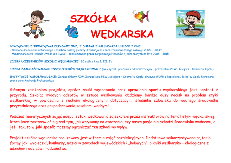 SZKÓŁKA WĘDKARSKA POWIĄZANIE Z TRWAJĄCYMI DEKADAMI ONZ, Z DNIAMI Z KALENDARZA UNESCO I ONZ: - Ochrona środowiska naturalnego i zasobów naszej planety „Edukacja na rzecz zrównoważonego rozwoju 2005 – 2014”; - Międzynarodowa Dekada „Woda dla Życia” – proklamowana przez Organizację Narodów Zjednoczonych na lata 2005 – 2015; LICZBA UCZESTNIKÓW SZKÓŁKI WĘDKARSKIEJ: 20 osób z klas I, III, IV LICZBA ZAANGAŻOWANYCH INSTRUKTORÓW WĘDKARSTWA: 2 (nauczyciel i pracownik administracyjny – prezes Koła PZW „Kolejarz – Ofama” w Opolu) INSTYTUCJE WSPÓŁPRACUJĄCE: Zarząd Główny PZW, Zarząd Koła PZW „Kolejarz – Ofama” w Opolu, drużyna WOPR z kąpieliska „Bolko” w Opolu kierowana przez pana Andrzeja Prokopowicza Głównym założeniem projektu, oprócz nauki wędkowania oraz uprawiania sportu wędkarskiego jest kontakt z przyrodą. Szkoląc młodych adeptów w sztuce wędkowania kładziemy bardzo duży nacisk na problem etyki wędkarskiej w powiązaniu z ruchami ekologicznymi dotyczącymi stosunku człowieka do wodnego środowiska przyrodniczego oraz gospodarowania zasobami wodnymi. Podczas teoretycznych zajęć adepci sztuki wędkowania są szkoleni przez instruktorów na temat etyki wędkarskiej, która każe zastanawiać się nad tym, jak wpływamy na otoczenie, czy nasza pasja nie szkodzi środowisku wodnemu, a jeśli tak, to w jaki sposób możemy ograniczać ten szkodliwy wpływ. Projekt szkółka wędkarska realizowany jest w formie zajęć pozalekcyjnych. Dodatkowo wykorzystywane są takie formy jak: wycieczki, konkursy, udział w zawodach wojewódzkich i „kołowych”, pikniki wędkarsko – ekologiczne z udziałem rodziców i rodzeństwa. W roku szkolnym 2013/14 Zarząd Główny PZW na wniosek Zarządu Koła PZW „Kolejarz – Ofama” nadał trójce uczniów – członkom szkółki wędkarskiej odznakę „Wzorowy Młody Wędkarz”. Odznaka ta jest nadawana m.in. za godny i aktywny udział w działaniach na rzecz ekologii i ochrony wodnego środowiska naturalnego. Udział w Tygodniu Czystości Wód – akcja sprzątania terenów łowiska nad Kanałem Ulgi w Opolu Odznakę „Wzorowy Młody Wędkarz” Zarząd Główny Polskiego Związku Wędkarskiego nadał trójce uczniów naszej szkoły m.in. za szczególną działalność ekologiczną dotyczącą ochrony wód. Otrzrymali ją na uroczystym apelu: Anastazja Frydel z klasy IV (odznakę odebrała Dominika – siostra, również adeptka wędkowania), Łukasz Wyrambik z klasy IV i Jakub Komko z klasy Vb. Zgodnie z regulaminem odznakę wręczył prezes Koła PZW „Kolejarz – Ofama” pan Jerzy Malinowski. Realizując podczas zajęć teoretycznych tematykę ochrony wody opieramy się na „Karcie Rzeczników Wody”, która została opracowana podczas Międzynarodowego Spotkania Rzeczników Wody zorganizowanego przez Franciski Komitet UNESCO. Główny nacisk kładziemy na Art. 3: „Wodę należy dzielić pomiędzy wszystkie istoty żywe (ludzi, zwierzęta, rośliny…), ponieważ nie jest ona jedynie własnością człowieka” – tak rozumiemy „Wodę dla Życia”.