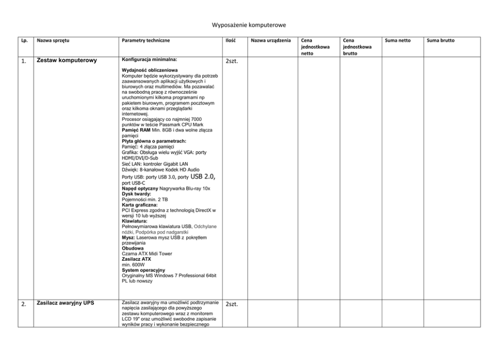 Wyposażenie komputerowe Lp. Nazwa sprzętu Parametry techniczne Ilość 1. Zestaw komputerowy Konfiguracja minimalna: 2szt. Wydajność obliczeniowa Komputer będzie wykorzystywany dla potrzeb zaawansowanych aplikacji użytkowych i biurowych oraz multimediów. Ma pozawalać na swobodną pracę z równocześnie uruchomionymi kilkoma programami np pakietem biurowym, programem pocztowym oraz kilkoma oknami przeglądarki internetowej. Procesor osiągający co najmniej 7000 punktów w teście Passmark CPU Mark Pamięć RAM Min. 8GB i dwa wolne złącza pamięci Płyta główna o parametrach: Pamięć: 4 złącza pamięci Grafika: Obsługa wielu wyjść VGA: porty HDMI/DVI/D-Sub Sieć LAN: kontroler Gigabit LAN Dźwięk: 8-kanałowe Kodek HD Audio Porty USB: porty USB 3.0, porty USB 2.0, port USB-C Napęd optyczny Nagrywarka Blu-ray 10x Dysk twardy: Pojemności min. 2 TB Karta graficzna: PCI Express zgodna z technologią DirectX w wersji 10 lub wyższej Klawiatura: Pełnowymiarowa klawiatura USB, Odchylane nóżki, Podpórka pod nadgarstki Mysz: Laserowa mysz USB z pokrętłem przewijania Obudowa Czarna ATX Midi Tower Zasilacz ATX min. 600W System operacyjny Oryginalny MS Windows 7 Professional 64bit PL lub nowszy 2. Zasilacz awaryjny UPS Zasilacz awaryjny ma umożliwić podtrzymanie napięcia zasilającego dla powyższego zestawu komputerowego wraz z monitorem LCD 19" oraz umożliwić swobodne zapisanie wyników pracy i wykonanie bezpiecznego 2szt. Nazwa urządzenia Cena jednostkowa netto Cena jednostkowa brutto Suma netto Suma brutto Wyposażenie komputerowe zatrzymania systemu w przypadku zaniku napięcia zasilania sieciowego. Powinien posiadać możliwość monitorowania np stanu baterii, parametrów pracy i sieci zasilającej przez interfejs komunikacyjny USB Gwarancja: min. 24 miesiące Listwa zasilająca Listwa przeciwprzepięciowa długości 1.5m. posiadająca 7 gniazd, w tym 5 z bolcem i 2 płaskie. 3. Monitor LED 19 cali, biurowy(kwadratowy) przekątna 19 cali rodzaj matrycy IPS rodzaj podświetlenia LED jasność min. 250 cd/m² czas reakcji plamki max. 8 ms (szary do szarego) rozdzielczość nominalna 1280 x 1024 piksele obrotowy ekran pivot Wbudowane porty USB Złącza: DVI, D-SUB, DisplayPort możliwość montażu na ścianie VESA 100 x 100 mm 2szt. 4. Urządzenie wielofunkcyjne laserowe, kolorowe Parametry ogólne rodzaj urządzenia wielofunkcyjne - druk/skan/kopia przeznaczenie do druku mono/kolor tekst i grafika technologia druku laserowa kolor standardowa pamięć min. 256 MB automatyczny druk dwustronny tak możliwość wysyłania/odbierania faksów tak 1szt. Specyfikacja Drukarki szybkość drukowania mono od 30 stron A4/min szybkość drukowania w kolorze od 30 stron A4/min czas wydruku pierwszej strony do 10,5 sekund Marginesy wydruku do: Górny: 5 mm; Dolny: 5 mm; Lewy: 5 mm; Prawy: 5 mm; Specyfikacja Kopiarki rozdzielczość kopiowania od 300x300 dpi automatyczne kopiowanie dwustronne (DADF) tak zakres skalowania min 25 % max 400 % Wyposażenie komputerowe Specyfikacja Skanera skanowanie w kolorze skanowanie dwustronne optyczna rozdzielczość skanowania 1200x1200 dpi kodowanie koloru Specyfikacja Faksu pamięć faksu od 200 stron A4 automatyczne powtarzanie numeru przekazywanie faksu wysyłanie faksów z opóźnieniem 5. Oprogramowanie użytkowe tak tak od 24 bit tak tak tak Pakiet biurowy: Microsoft Office 2016 Professional - licencja dożywotnia 2szt.