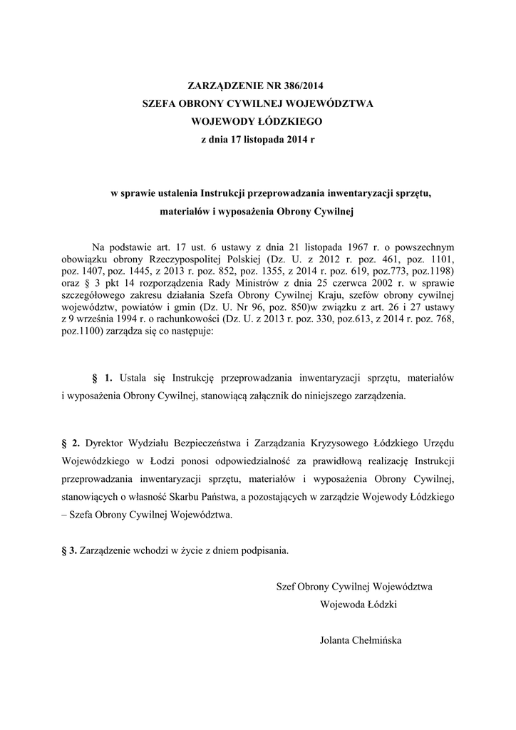 Zarządzenie nr 386/2014 Szefa Obrony Cywilnej Województwa