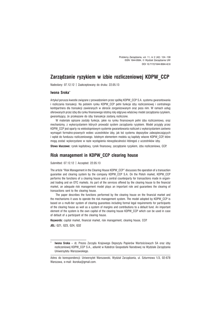 Problemy ZarzÈdzania, vol. 11, nr 2 (42): 124 – 139 ISSN 1644-9584, © Wydziaï ZarzÈdzania UW DOI 10.7172/1644-9584.42.8 ZarzÈdzanie ryzykiem w izbie rozliczeniowej KDPW_CCP Nadesïany: 07.12.12 | Zaakceptowany do druku: 22.05.13 Iwona Sroka* Artykuï porusza kwestie zwiÈzane z prowadzeniem przez spóïkÚ KDPW_CCP S.A. systemu gwarantowania i rozliczania transakcji. Na polskim rynku KDPW_CCP peïni funkcje izby rozliczeniowej i centralnego kontrpartnera dla transakcji zawieranych w obrocie zorganizowanym oraz poza nim. W ramach usïug oferowanych przez izbÚ dla rynku finansowego istotnÈ rolÚ odgrywa wïaĂciwy model zarzÈdzania ryzykiem, gwarantujÈcy, ĝe przekazane do izby transakcje zostanÈ rozliczone. W materiale opisane zostaïy funkcje, jakie na rynku finansowym peïni izba rozliczeniowa, oraz mechanizmy, z wykorzystaniem których prowadzi system zarzÈdzania ryzykiem. Model przyjÚty przez KDPW_CCP jest oparty na wielostopniowym systemie gwarantowania rozliczeñ z wykorzystaniem zarówno wymagañ formalno-prawnych wobec uczestników izby, jak teĝ systemu depozytów zabezpieczajÈcych ib wpïat do funduszu rozliczeniowego. Istotnym elementem modelu sÈ kapitaïy wïasne KDPW_CCP, które mogÈ zostaÊ wykorzystane w razie wystÈpienia niewypïacalnoĂci któregoĂ z uczestników izby. Sïowa kluczowe: rynek kapitaïowy, rynek finansowy, zarzÈdzanie ryzykiem, izba rozliczeniowa, CCP. Risk management in KDPW_CCP clearing house Submitted: 07.12.12 | Accepted: 22.05.13 The article “Risk Management in the Clearing House KDPW_CCP” discusses the operation of a transaction guarantee and clearing system by the company KDPW_CCP S.A. On the Polish market, KDPW_CCP performs the functions of a clearing house and a central counterparty for transactions made in organized trading and on OTC markets. As part of the services offered by the clearing house to the financial market, an adequate risk management model plays an important role and guarantees the clearing of transactions sent to the clearing house. The paper describes the functions performed by the clearing house on the financial market and the mechanisms it uses to operate the risk management system. The model adopted by KDPW_CCP is based on a multi-tier system of clearing guarantees including formal legal requirements for participants of the clearing house as well as a system of margins and contributions to a default fund. An important element of the system is the own capital of the clearing house KDPW_CCP which can be used in case of default of a participant of the clearing house. Keywords: capital market, financial market, risk management, clearing house, CCP. JEL: G21, G23, G24, G32 * Iwona Sroka – dr, Prezes ZarzÈdu Krajowego Depozytu Papierów WartoĂciowych SA oraz izby rozliczeniowej KDPW_CCP S.A., adiunkt w Katedrze Gospodarki Narodowej na Wydziale ZarzÈdzania Uniwersytetu Warszawskiego. Adres do korespondencji: Uniwersytet Warszawski, Wydziaï ZarzÈdzania, ul. Szturmowa 1/3, 02-678 Warszawa, e-mail: [email protected]. ZarzÈdzanie ryzykiem w izbie rozliczeniowej KDPW_CCP 1. WstÚp Jednym z czynników ĂwiadczÈcych o jakoĂci i dojrzaïoĂci danego rynku finansowego jest funkcjonowanie na nim izby rozliczeniowej, peïniÈcej rolÚ tzw. centralnego kontrpartnera (central counterparty – CCP). Izba taka, dysponujÈc odpowiednim modelem zarzÈdzania ryzykiem, gwarantuje bezpieczeñstwo dokonywanych w niej rozliczeñ (Zickwolff, 2010). W dobie globalnych rynków finansowych i miÚdzynarodowych inwestorów lokujÈcych kapitaï na wielu rynkach równoczeĂnie istotne jest, aby stosowany przez danÈ izbÚ model byï powszechnie znany i rozpoznawalny. DziÚki temu obniĝajÈ siÚ bariery wejĂcia oraz zmniejszajÈ siÚ koszty zwiÈzane z obecnoĂciÈ na danym rynku. Polska od lat aspiruje do miana rynku miÚdzynarodowego, otwartego na globalnych graczy. JednÈ z istotniejszych cech rynku, jakÈ biorÈ pod uwagÚ zagraniczni – i nie tylko – inwestorzy, jest jakoĂÊ infrastruktury rozliczeniowej i rozrachunkowej oraz gwarancje bezpieczeñstwa, jakie dziÚki niej otrzymuje. Krajowy Depozyt Papierów WartoĂciowych oraz izba rozliczeniowa KDPW_CCP dbajÈ o to, aby infrastruktura dotyczÈca rozliczeñ ibrozrachunku transakcji zawieranych na naszym rynku byïa dostosowana do najwyĝszych Ăwiatowych standardów i gwarantowaïa wszystkim uczestnikom bezpieczeñstwo, wydajnoĂÊ i sprawnoĂÊ. Do tej pory dziaïalnoĂÊ KDPW i izby KDPW_CCP skupiaïa siÚ gïównie w obszarze rynku kapitaïowego. Wraz ze zmieniajÈcym siÚ po ostatnim kryzysie krajobrazem rynku finansowego i nowymi regulacjami dotyczÈcymi rynku miÚdzybankowego (OTC), które nakïadajÈ obowiÈzek rozliczania okreĂlonych transakcji w derywatach OTC przez izby rozliczeniowe typu centralny kontrpartner, izba KDPW_CCP podjÚïa siÚ równieĝ oferowania usïug w tym zakresie. Celem niniejszego artykuïu jest opisanie mechanizmu dziaïania izby rozliczeniowej typu CCP i znaczenia takiego podmiotu dla bezpieczeñstwa rynku finansowego poprzez stosowanie odpowiednich metod zarzÈdzania ryzkiem rozliczeniowym. 2. Rola izb rozliczeniowych typu CCP na rynkach finansowych Gïównym zadaniem izb rozliczeniowych jest prowadzenie rozliczeñ transakcji z zastosowaniem odpowiednich mechanizmów, które pozwalajÈ na systemowe obniĝenie ryzyka niewywiÈzania siÚ stron ze zobowiÈzañ wynikajÈcych z zawartych transakcji (Pirrong, 2008–2009). Ryzyko generowane przez uczestników rynku wynika z istoty funkcjonowania rynku kapitaïowego: anonimowoĂci, wystÚpowania poĂredników, centralizacji obrotu oraz rozliczeñ transakcji. W przypadku polskiego rynku kapitaïowego bezpoĂredni dostÚp zarówno do platform obrotu, jak i infrastruktury depozytowej i rozliczeniowej majÈ tylko okreĂlonego rodzaju Problemy ZarzÈdzania vol. 11, nr 2 (42), 2013 125 Iwona Sroka wyspecjalizowane podmioty, speïniajÈce okreĂlone warunki. Te z kolei majÈ swoich klientów, którzy