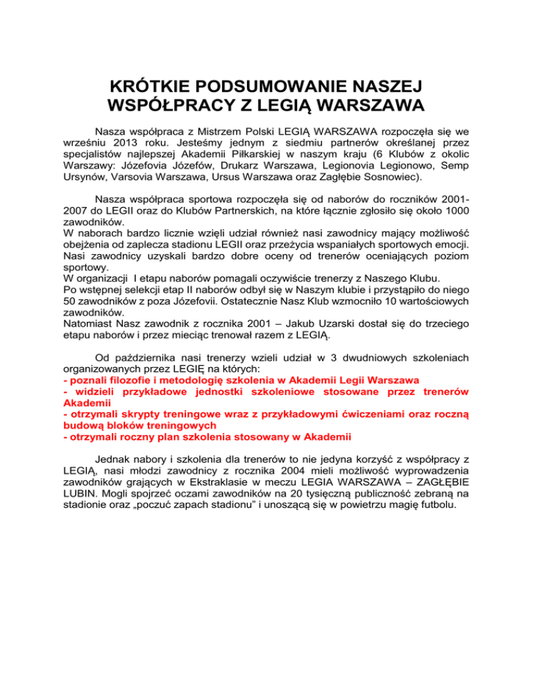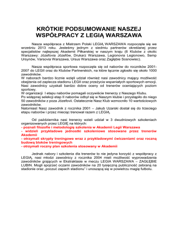 KRÓTKIE PODSUMOWANIE NASZEJ WSPÓŁPRACY Z LEGIĄ WARSZAWA Nasza współpraca z Mistrzem Polski LEGIĄ WARSZAWA rozpoczęła się we wrześniu 2013 roku. Jesteśmy jednym z siedmiu partnerów określanej przez specjalistów najlepszej Akademii Piłkarskiej w naszym kraju (6 Klubów z okolic Warszawy: Józefovia Józefów, Drukarz Warszawa, Legionovia Legionowo, Semp Ursynów, Varsovia Warszawa, Ursus Warszawa oraz Zagłębie Sosnowiec). Nasza współpraca sportowa rozpoczęła się od naborów do roczników 20012007 do LEGII oraz do Klubów Partnerskich, na które łącznie zgłosiło się około 1000 zawodników. W naborach bardzo licznie wzięli udział również nasi zawodnicy mający możliwość obejżenia od zaplecza stadionu LEGII oraz przeżycia wspaniałych sportowych emocji. Nasi zawodnicy uzyskali bardzo dobre oceny od trenerów oceniających poziom sportowy. W organizacji I etapu naborów pomagali oczywiście trenerzy z Naszego Klubu. Po wstępnej selekcji etap II naborów odbył się w Naszym klubie i przystąpiło do niego 50 zawodników z poza Józefovii. Ostatecznie Nasz Klub wzmocniło 10 wartościowych zawodników. Natomiast Nasz zawodnik z rocznika 2001 – Jakub Uzarski dostał się do trzeciego etapu naborów i przez mieciąc trenował razem z LEGIĄ. Od października nasi trenerzy wzieli udział w 3 dwudniowych szkoleniach organizowanych przez LEGIĘ na których: - poznali filozofie i metodologię szkolenia w Akademii Legii Warszawa - widzieli przykładowe jednostki szkoleniowe stosowane przez trenerów Akademii - otrzymali skrypty treningowe wraz z przykładowymi ćwiczeniami oraz roczną budową bloków treningowych - otrzymali roczny plan szkolenia stosowany w Akademii Jednak nabory i szkolenia dla trenerów to nie jedyna korzyść z współpracy z LEGIĄ, nasi młodzi zawodnicy z rocznika 2004 mieli możliwość wyprowadzenia zawodników grających w Ekstraklasie w meczu LEGIA WARSZAWA – ZAGŁĘBIE LUBIN. Mogli spojrzeć oczami zawodników na 20 tysięczną publiczność zebraną na stadionie oraz „poczuć zapach stadionu” i unoszącą się w powietrzu magię futbolu. Kolejną korzyścią jaka płynie z Naszej Współpracy z Mistrzem Polski jest możliwość grania z najlepszymi. Pod koniec roku 2013 oraz na początku roku 2014 odbyło się kilka sparingów rozegranych pomiędzy Klubami Partnerskimi w Hali Piłkarskiej na Bemowie, których organizację i koszty pokryła Legia Warszawa. Podczas tych sparingów Nasi zawodnicy oraz zawodnicy z pozostałych Klubów Partnerskich byli bacznie obserwowani przez trenerów Legii. Celem sparingów była obserwacja wszystkich zawodników i ewentualne zaproszenie na tening drużyny LEGII danego rocznika bądź wstępną selekcję do Reprezentacji Klubów Partnerskich (RKP). Gry w 2013 roku: Rocznik 2003: sparingi pod Balonem Poniedziałek, 16 grudnia br.: godz. 17:30-19:00 – Varsovia W. – Legionovia L. Wtorek, 17 grudnia br.: godz. 18:00-19:30 – Ursus W. – Drukarz W. Środa, 18 grudnia br.: godz. 17:30-19:00 – SEMP U. - Józefovia Rocznik 2005: mini turniej na Hali Piłkarskiej Środa, 18 grudnia br.: godz. 16:30-18:00 Turniej na 3 sektorach, 6 drużyn. Rocznik 2006: mini turniej na Hali Piłkarskiej Piątek, 20 grudnia br.,: godz. 17:30-19:00 Turniej na 3 sektorach, 6 drużyn. Gry w 2014 roku: Rocznik 2001: trójmecz na Hali Piłkarskiej - Legionovia Legionowo. - Ursus Warszawa. - Józefovia Józefów. Środa, 8 stycznia 2014r..: godz. 16:30-18:00 Rocznik 2002: sparingi pod Balonem Wtorek, 7 stycznia 2014r.: godz. 18:00-19:30 – Ursus W. – Józefovia Środa, 8 stycznia 2014r..: godz. 17:30-19:00 – Drukarz W.-Legionovia L. Piątek, 10 stycznia 2014r.: godz. 17:30-19:00 – Varsovia W. – SEMP U. Rocznik 2007: mini turniej na Hali Piłkarskiej Piątek, 10 stycznia 2014r.: godz. 17:30-19:00 Po sparingach zostały powołane Reprezentacje Klubów Partnerskich złożone z wyróżniających się chłopców z wszystkich Klubów. Ustalono terminy treningów oraz terminy meczy kontrolnych z drużynami Legii Warszawa. Powstało 5 reprezentacji: 2002, 2003, 2004, 2005, 2006 Treningi Reprezentacji (miejsce Hala piłkarska na Bemowie): Terminy: I - 17.01.2014r. /piątek/ II - 24.01.2014r. /piątek/ III - 07.02.2014r. /piątek/ IV - 07.03.2014r. /piątek/ Terminy sparingów Reprezentacji (miejsce ul. Łazienkowska 3): Legia 2002 – RKP 2002 25.01.2014r. /sobota/ godz. 13.00 Legia 2004 – RKP 2004 25.01.2014r. /sobota/ godz. 14.30 Legia 2005 – RKP 2005 25.01.2014r. /sobota/ godz. 16.00 Legia 2006 – RKP 2006 25.01.2014r. /sobota/ godz. 16.00 Legia 2003 – RKP 2003 01.02.2014r. /sobota/ godz. 10.00 Skład osobowy Reprezentacji Klubów Partnerskich oraz trenerów wyznaczonych do prowadzenia danego rocznika. Reprezentanci Józefovii Józefów w RKP: RKP 2002 – Miłosz Włodarczyk, Mateusz Szczęsny, Maciej Baca RKP 2003 – Marcin Ćwiek, Franek Wójcik RKP 2004 – Bartosz Szejka RKP 2005 – Przemysław Pudełek RKP 2006 – Eryk Żywiec, Sebastian Brzuzy, Filip Góral (trener) Podczas meczów RKP – LEGIA panowała bardzo miła i rodzinna atmosfera. Dzieci rywalizowały w duchu fair play a uśmiech i dobra zabawa panowały od pierwszego do ostatniego gwizdka. W najbliższym czasie planowane są jeszcze dwie inicjatywy: kolejne nabory oraz organizacja Wewnętrznej Ligii Klubów Partnerskich i Legii. Nabory: Najbliższe nabory do Legii Warszawa oraz Klubów Partnerskich odbędą się na obiektach Legii 9 lutego 2014r. Wszyskich szczegółów można się dowiedzieć ze stron oraz profilu www.facebook.com/AkademiaLegii http://akademia.legia.com/podstrona,387-nabory.html. Wewnętrzna Liga Klubów Partnerskich dla roczników 2005-2007: Rozgrywki dla roczników 2005-2007. Start rozgrywek: 30 marca 2014r. Rozgrywki mają wyłącznie charakter szkoleniowy, a tym samym nie będzie prowadzona klasyfikacja, zebrane informacje o wynikach poszczególnych spotkań będą miały jedynie charakter ciekawostek. Po każdym dn