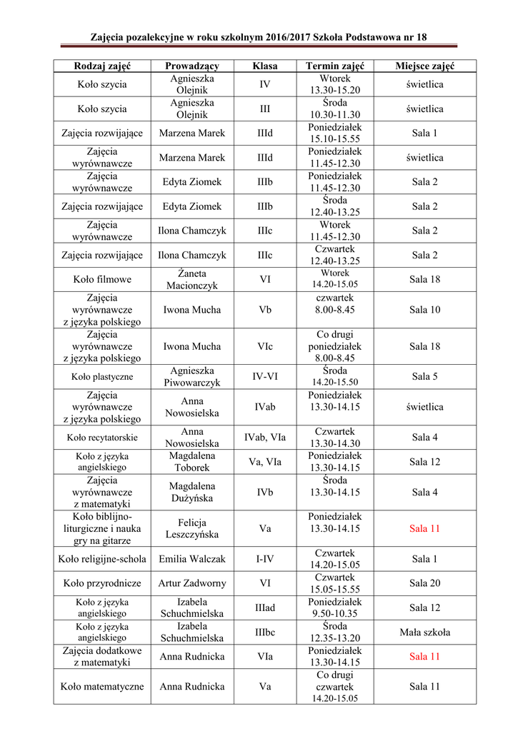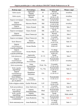 Zajęcia pozalekcyjne w roku szkolnym 2016/2017 Szkoła