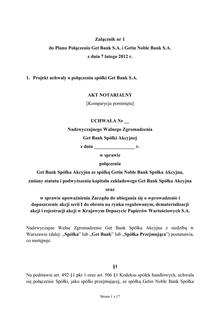 Załącznik nr 1 do Planu Połączenia Get Bank S.A. i Getin Noble Bank S.A. z dnia 7 lutego 2012 r. 1. Projekt uchwały o połączeniu spółki Get Bank S.A. AKT NOTARIALNY [Komparycja pominięta] UCHWAŁA Nr __ Nadzwyczajnego Walnego Zgromadzenia Get Bank Spółki Akcyjnej z dnia _________________ r. w sprawie połączenia Get Bank Spółka Akcyjna ze spółką Getin Noble Bank Spółka Akcyjna, zmiany statutu i podwyŜszenia kapitału zakładowego Get Bank Spółka Akcyjna oraz w sprawie upowaŜnienia Zarządu do ubiegania się o wprowadzenie i dopuszczenie akcji serii I do obrotu na rynku regulowanym, dematerializacji akcji i rejestracji akcji w Krajowym Depozycie Papierów Wartościowych S.A. Nadzwyczajne Walne Zgromadzenie Get Bank Spółka Akcyjna z siedzibą w Warszawie (dalej: „Spółka” lub „Get Bank” lub „Spółka Przejmująca”) postanawia, co następuje: §1 Na podstawie art. 492 §1 pkt 1 oraz art. 506 §1 Kodeksu spółek handlowych, uchwala się połączenie Spółki, jako spółki przejmującej, ze spółką Getin Noble Bank Spółka Strona 1 z 17 Akcyjna z siedzibą w Warszawie, ul. Domaniewska 39B, 02-675 Warszawa, zarejestrowaną w rejestrze przedsiębiorców prowadzonym w Krajowym Rejestrze Sądowym pod numerem KRS 0000018507 (dalej: „Getin Noble Bank” lub „Spółka Przejmowana”) jako spółką przejmowaną, poprzez przeniesienie na Spółkę całego majątku Getin Noble Bank w zamian za akcje, które Spółka wyda akcjonariuszom Getin Noble Bank. §2 1. Na podstawie art. 506 § 4 Kodeksu spółek handlowych wyraŜa się zgodę na Plan połączenia uzgodniony pomiędzy Spółką a Getin Noble Bank w dniu 7 lutego 2012 roku, załączony do protokołu Walnego Zgromadzenia jako Załącznik nr 1 oraz na zmiany statutu Spółki wskazane w § 4 poniŜej. 2. W wyniku połączenia, akcjonariusze Getin Noble Bank, za wyjątkiem Get Bank (dalej „Uprawnieni Akcjonariusze”), staną się akcjonariuszami Get Bank z dniem połączenia, tj. z dniem wpisania połączenia do rejestru właściwego według siedziby Spółki (dalej: „Dzień Połączenia”). §3 1. W związku z połączeniem Spółki z Getin Noble Bankiem poprzez przeniesienie całego majątku Getin Noble Bank na Spółkę w zamian za akcje, które Spółka przyzna Uprawnionym Akcjonariuszom, niniejszym podwyŜsza się kapitał zakładowy Spółki z kwoty 2.245.525.631,00 (dwa miliardy dwieście czterdzieści pięć milionów pięćset dwadzieścia pięć tysięcy sześćset trzydzieści jeden) złotych do kwoty 2.390.143.319,00 (dwa miliardy trzysta dziewięćdziesiąt milionów sto czterdzieści trzy tysiące trzysta dziewiętnaście) złotych, to jest o kwotę 144.617.688,00 (sto czterdzieści cztery miliony sześćset siedemnaście tysięcy sześćset osiemdziesiąt osiem) złotych poprzez utworzenie 144.617.688 (stu czterdziestu czterech milionów sześciuset siedemnastu tysięcy sześciuset osiemdziesięciu ośmiu) nowych akcji zwykłych na okaziciela serii I o numerach od 1 (jeden) do 144.617.688 (sto czterdzieści cztery miliony sześćset siedemnaście tysięcy sześćset osiemdziesiąt osiem) o wartości nominalnej 1,00 (jeden) złoty kaŜda akcja z przeznaczeniem dla akcjonariuszy Getin Noble Banku innych niŜ Spółka (dalej „Akcje Emisji Połączeniowej”). Cena emisyjna Akcji Emisji Połączeniowej wynosi 1,8697623656 (jeden i 8697623656/10000000000) złotych za jedną akcję. Zgodnie z art. 514 §1 k.s.h., Spółka Przejmująca nie będzie obejmować akcji własnych za akcje, które posiada w Spółce Przejmowanej. Strona 2 z 17 2. Akcje Emisji Połączeniowej Spółki uczestniczą w dywidendzie od dnia 1 stycznia 2012 roku. 3. Akcje Emisji Połączeniowej o wartości nominalnej 1,00 (jeden) złoty kaŜda, tj. o łącznej wartości nominalnej 144.617.688,00 (sto czterdzieści cztery miliony sześćset siedemnaście tysięcy sześćset osiemdziesiąt osiem) złotych, serii I o numerach od 1 (jeden) do 144.617.688 (sto czterdzieści cztery miliony sześćset siedemnaście tysięcy sześćset osiemdziesiąt osiem) zostają przyznane Uprawnionym Akcjonariuszom w następującym stosunku: − za 1 (jedną) akcję Getin Noble Bank o wartości nominalnej 1,00 (jeden) złoty przyznane zostanie 2,4112460520 (dwa i 4112460520/10000000000) akcji Spółki o wartości nominalnej 1 (jeden) złoty kaŜda (dalej „Parytet Wymiany Akcji”). 4. Liczba akcji Spółki przyznawanych danemu akcjonariuszowi Getin Noble Bank zostanie obliczona jako iloczyn liczby akcji Getin Noble Bank naleŜących do danego akcjonariusza Getin Noble Bank według stanu posiadania w dniu, który zgodnie z obowiązującymi regulacjami zostanie wyznaczony jako dzień referencyjny (dalej „Dzień Referencyjny”) i wyŜej określonego Parytetu Wymiany Akcji. Uprawnionymi do Akcji Emisji Połączeniowej będą osoby, na których rachunkach papierów wartościowych zapisane będą akcje Getin Noble Bank w Dniu Referencyjnym. W przypadku, gdy iloczyn taki nie będzie stanowił liczby całkowitej, dokonane zostanie zaokrąglenie w dół do najbliŜszej liczby całkowitej. 5. Akcjonariusze Getin Noble Bank, którzy w wyniku konieczności dokonania zaokrąglenia liczby przyznawanych akcji Spółki, o którym mowa w § 3 pkt 4 powyŜej, nie otrzymają ułamkowej części akcji Spółki, będą uprawnieni do otrzymania od Spółki dopłat w gotówce. Dopłaty zostaną wypłacone w terminie 45 (czterdziestu pięciu) dni od Dnia Połączenia. 6. Wysokość dopłaty naleŜnej danemu Uprawnionemu Akcjonariuszowi zostanie obliczona jako iloczyn (i) ułamkowej części niewydanej akcji Spółki oraz (ii) średniej ceny wg kursu zamknięcia akcji Spółki na rynku regulowanym prowadzonym przez Giełdę Papierów Wartościowych w Warszawie S.A. (dalej „GPW”) w okresie 1 miesiąca przed Dniem Połączenia albo ceny emisyjnej 1 Akcji Emisji Połączeniowej, tj. 1,8697623656 (jeden i 8697623656/10000000000) złotych, w zaleŜności od 