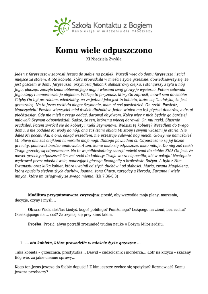 Komu wiele odpuszczono XI Niedziela Zwykła Jeden z faryzeuszów zaprosił Jezusa do siebie na posiłek. Wszedł więc do domu faryzeusza i zajął miejsce za stołem. A oto kobieta, która prowadziła w mieście życie grzeszne, dowiedziawszy się, że jest gościem w domu faryzeusza, przyniosła flakonik alabastrowy olejku, i stanąwszy z tyłu u nóg Jego, płacząc, zaczęła łzami oblewać Jego nogi i włosami swej głowy je wycierać. Potem całowała Jego stopy i namaszczała je olejkiem. Widząc to faryzeusz, który Go zaprosił, mówił sam do siebie: Gdyby On był prorokiem, wiedziałby, co za jedna i jaka jest ta kobieta, która się Go dotyka, że jest grzesznicą. Na to Jezus rzekł do niego: Szymonie, mam ci coś powiedzieć. On rzekł: Powiedz, Nauczycielu! Pewien wierzyciel miał dwóch dłużników. Jeden winien mu był pięćset denarów, a drugi pięćdziesiąt. Gdy nie mieli z czego oddać, darował obydwom. Który więc z nich będzie go bardziej miłował? Szymon odpowiedział: Sądzę, że ten, któremu więcej darował. On mu rzekł: Słusznie osądziłeś. Potem zwrócił się do kobiety i rzekł Szymonowi: Widzisz tę kobietę? Wszedłem do twego domu, a nie podałeś Mi wody do nóg; ona zaś łzami oblała Mi stopy i swymi włosami je otarła. Nie dałeś Mi pocałunku; a ona, odkąd wszedłem, nie przestaje całować nóg moich. Głowy nie namaściłeś Mi oliwą; ona zaś olejkiem namaściła moje nogi. Dlatego powiadam ci: Odpuszczone są jej liczne grzechy, ponieważ bardzo umiłowała. A ten, komu mało się odpuszcza, mało miłuje. Do niej zaś rzekł: Twoje grzechy są odpuszczone. Na to współbiesiadnicy zaczęli mówić sami do siebie: Któż On jest, że nawet grzechy odpuszcza? On zaś rzekł do kobiety: Twoja wiara cię ocaliła, idź w pokoju! Następnie wędrował przez miasta i wsie, nauczając i głosząc Ewangelię o królestwie Bożym. A było z Nim Dwunastu oraz kilka kobiet, które uwolnił od złych duchów i od słabości: Maria, zwana Magdaleną, którą opuściło siedem złych duchów; Joanna, żona Chuzy, zarządcy u Heroda; Zuzanna i wiele innych, które im usługiwały ze swego mienia. (Łk 7,36-8,3) Modlitwa przygotowawcza zwyczajna: prosić, aby wszystkie moja plany, marzenia, decyzje, czyny i myśli… Obraz: Widziałeś/łaś kiedyś, kogoś pobitego? Poniżonego? Leżącego na ziemi, bez ruchu? Oczekującego na … coś? Zatrzymaj się przy kimś takim. Prośba: Prosić, abym potrafił zrozumieć trudną naukę o Bożym Miłosierdziu. 1. … oto kobieta, która prowadziła w mieście życie grzeszne … Taka kobieta – grzesznica, prostytutka… Dawid – cudzołożnik i morderca… Łotr na krzyżu – skazany Bóg wie, za jakie ciemne sprawy… Kogo ten Jezus jeszcze do Siebie dopuści? Z kim jeszcze zechce się spotykać? Rozmawiać? Komu jeszcze przebaczy? Czyż nie szkoda dla takich ludzi czasu? Czyż nie lepiej spotkać się z prawdziwymi wiernymi, którzy dbają o swoją czystość, o moralność, o poprawność? Z takimi, którzy codziennie się modlą, którzy są w kościele w każdą niedzielę? Którzy dają na tacę? Jak się czuję mając świadomość, że Jezus wszystkim wszystko wybaczy – jeśli tylko przyjmą jego przebaczenie? Jak mi z tą świadomością? I jak ona wpływa na moje samopoczucie, decyzje? Bo, jak wszystkim, to wszystkim – mnie też wszystko wybaczy. 2. Pewien wierzyciel miał dwóch dłużnikó Kiedy ci nie mieli z czego oddać, darował obu, bo … nie mieli z czego oddać. Jak traktuje osoby zależne ode mnie? Tych, nad którymi, z różnych powodów, mam władzę/przewagę? Jakie jest moje podejście do wrogów? Do tych, którzy mi przeszkadzają? Wykańczam ich, jeśli mam taką sposobność? Już starożytni chińscy generałowie wiedzieli, że lepiej jest zostawić wrogowi szansę honorowej ucieczki, niż dać mu tylko możliwość walki na śmierć i życie – wtedy pozostaje tylko i wyłącznie konfrontacja (Sztuka wojny Sun Zi). Jak traktuje osoby, z którymi mam problem? Staram się im pomóc, podać im rękę, czy ważniejsze się moje interesy – strata/zarobek? 3. Twoja wiara cię ocaliła, idź w pokoju Czy takie jest moje doświadczenie spotkania z Chrystusem – pokój i ocalenie? Jak się czuję w kościele, na osobistej modlitwie? Co mi towarzyszy – jakie uczucia, emocje – kiedy mam zamiar się pomodlić, gdy pomyślę o pójściu na Mszę? A po? Jak się czuję? Wysłuchany? Zrozumiany? Przyjęty? Czy raczej, mam spokój, bo wypełniłem obowiązek codziennej modlitwy? A może nie muszę się bać, bo tym razem udało się dotrzeć na niedzielną Mszę? Pokój i ocalenie – mam to już, czy jeszcze jest mi to obce? Rozmowa końcowa: Podziękować Ojcu za wszystko to, co działo się w trakcie tego spotkania. Na zakończenie odmów: Ojcze nasz…