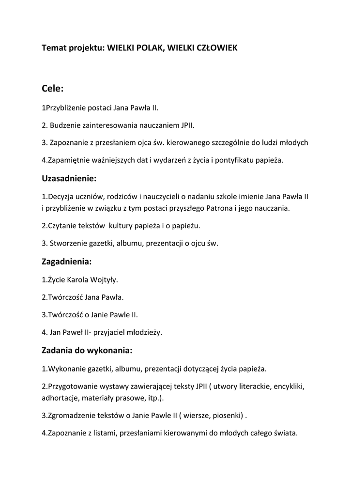 Temat projektu: WIELKI POLAK, WIELKI CZŁOWIEK Cele: 1Przybliżenie postaci Jana Pawła II. 2. Budzenie zainteresowania nauczaniem JPII. 3. Zapoznanie z przesłaniem ojca św. kierowanego szczególnie do ludzi młodych 4.Zapamiętnie ważniejszych dat i wydarzeń z życia i pontyfikatu papieża. Uzasadnienie: 1.Decyzja uczniów, rodziców i nauczycieli o nadaniu szkole imienie Jana Pawła II i przybliżenie w związku z tym postaci przyszłego Patrona i jego nauczania. 2.Czytanie tekstów kultury papieża i o papieżu. 3. Stworzenie gazetki, albumu, prezentacji o ojcu św. Zagadnienia: 1.Życie Karola Wojtyły. 2.Twórczość Jana Pawła. 3.Twórczość o Janie Pawle II. 4. Jan Paweł II- przyjaciel młodzieży. Zadania do wykonania: 1.Wykonanie gazetki, albumu, prezentacji dotyczącej życia papieża. 2.Przygotowanie wystawy zawierającej teksty JPII ( utwory literackie, encykliki, adhortacje, materiały prasowe, itp.). 3.Zgromadzenie tekstów o Janie Pawle II ( wiersze, piosenki) . 4.Zapoznanie z listami, przesłaniami kierowanymi do młodych całego świata. Kryteria oceny: 1. Stopień zaangażowania w realizację projektu. 2. Systematyczność pracy. 3. Wywiązywanie się z podjętych zadań. 4. Efekty końcowe pracy- estetyka wykonanych albumów, gaetek, plakatów. Sposób prezentacji: 1. Przygotowanie wystawy prac związanych z JP II . 2.Wykonanie gazetki, plakatów, mapy myśli o ojcu św. 3.Uroczysty apel poświęcony postaci Jana Pawła II .