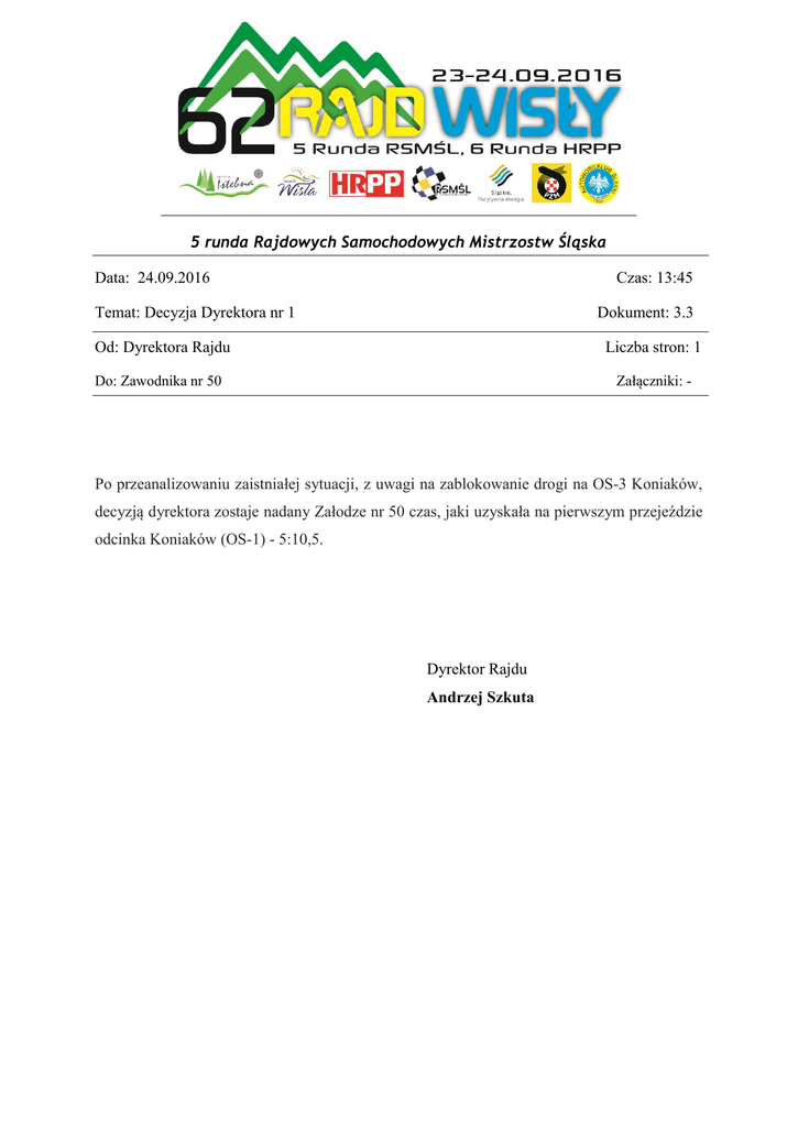 5 runda Rajdowych Samochodowych Mistrzostw Śląska Data: 24.09.2016 Czas: 13:45 Temat: Decyzja Dyrektora nr 1 Dokument: 3.3 Od: Dyrektora Rajdu Liczba stron: 1 Załączniki: - Do: Zawodnika nr 50 Po przeanalizowaniu zaistniałej sytuacji, z uwagi na zablokowanie drogi na OS-3 Koniaków, decyzją dyrektora zostaje nadany Załodze nr 50 czas, jaki uzyskała na pierwszym przejeździe odcinka Koniaków (OS-1) - 5:10,5. Dyrektor Rajdu Andrzej Szkuta
