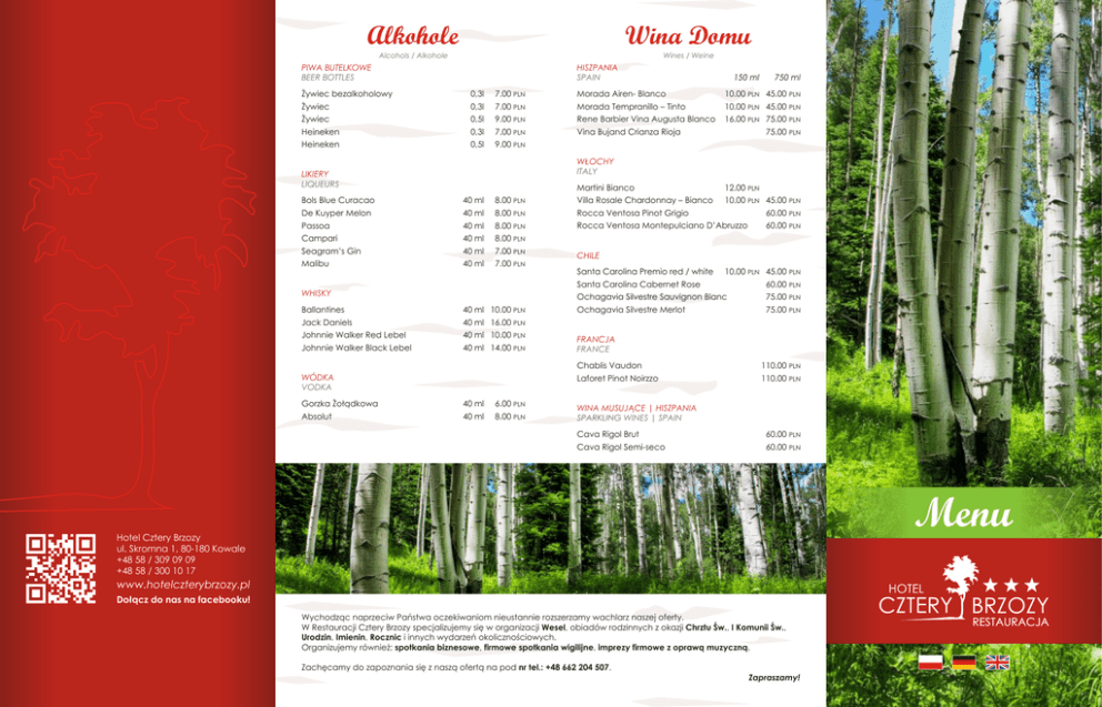 Alkohole Wina Domu Alcohols / Alkohole Wines / Weine PIWA BUTELKOWE BEER BOTTLES HISZPANIA SPAIN 150 ml 750 ml Żywiec bezalkoholowy 0,3l 7.00 PLN Morada Airen- Blanco 10.00 PLN 45.00 PLN Żywiec 0,3l 7.00 PLN Morada Tempranillo – Tinto 10.00 PLN 45.00 PLN Żywiec 0,5l 9.00 PLN Rene Barbier Vina Augusta Blanco 16.00 PLN 75.00 PLN Heineken 0,3l 7.00 PLN Vina Bujand Crianza Rioja Heineken 0,5l 9.00 PLN 75.00 PLN WŁOCHY ITALY LIKIERY LIQUEURS Martini Bianco 12.00 PLN 10.00 PLN 45.00 PLN Bols Blue Curacao 40 ml 8.00 PLN Villa Rosale Chardonnay – Bianco De Kuyper Melon 40 ml 8.00 PLN Rocca Ventosa Pinot Grigio 60.00 PLN Passoa 40 ml 8.00 PLN Rocca Ventosa Montepulciano D’Abruzzo 60.00 PLN Campari 40 ml 8.00 PLN Seagram’s Gin 40 ml 7.00 PLN Malibu 40 ml 7.00 PLN CHILE Santa Carolina Premio red / white WHISKY Ballantines 40 ml 10.00 PLN Jack Daniels 40 ml 16.00 PLN Johnnie Walker Red Lebel 40 ml 10.00 PLN Johnnie Walker Black Lebel 40 ml 14.00 PLN WÓDKA VODKA Gorzka Żołądkowa 40 ml 6.00 PLN Absolut 40 ml 8.00 PLN 10.00 PLN 45.00 PLN Santa Carolina Cabernet Rose 60.00 PLN Ochagavia Silvestre Sauvignon Blanc 75.00 PLN Ochagavia Silvestre Merlot 75.00 PLN FRANCJA FRANCE Chablis Vaudon 110.00 PLN Laforet Pinot Noirzzo 110.00 PLN WINA MUSUJĄCE | HISZPANIA SPARKLING WINES | SPAIN Cava Rigol Brut 60.00 PLN Cava Rigol Semi-seco 60.00 PLN Menu Hotel Cztery Brzozy ul. Skromna 1, 80-180 Kowale +48 58 / 309 09 09 +48 58 / 300 10 17 www.hotelczterybrzozy.pl Dołącz do nas na facebooku! Wychodząc naprzeciw Państwa oczekiwaniom nieustannie rozszerzamy wachlarz naszej oferty. W Restauracji Cztery Brzozy specjalizujemy się w organizacji Wesel, obiadów rodzinnych z okazji Chrztu Św., I Komunii Św., Urodzin, Imienin, Rocznic i innych wydarzeń okolicznościowych. Organizujemy również: spotkania biznesowe, firmowe spotkania wigilijne, imprezy firmowe z oprawą muzyczną. Zachęcamy do zapoznania się z naszą ofertą na pod nr tel.: +48 662 204 507. Zapraszamy! Przystawki Dania glówne Zestaw dla dzieci Napoje Appetizers / Vorspeisen Main Courses / Hauptgerichte Set for children / Kindermenü Drinks / Getränke Krewetki w sosie winno-maślanym z papryczką Jalapeno 32.00 PLN 6 szt. Garnelen in Wein-Buttesosse mit Jalapeno-Paprika Traditional style pickled herring and onion in sour cream sauce Śledź marynowany w ziołach z sałatką z cebuli i z ogórka kiszonego 180 g 100g 18.00 PLN 100g 22.00 PLN Orientalne kawałki kurczaka z warzywami, sosem chilli i ryżem 29.00 PLN 150 g Orientale Hähnchenstücke mit Gemüse, Chilli- Soße und Reis Asian style chicken nuggets with vegetables, chilli sauce and rice Konfit z kaczki z konfiturą z żurawiny, ziemniakami gratin dauphinois w towarzystwie mini sałatki 44.00 PLN 200 g 28.00 PLN 140 g Zawijaniec wieprzowy podany z kaszą pęczak oraz sałatką z ogórka kiszonego Soups / Suppen 10.00 PLN 250 ml 12.00 PLN 250 ml Porree-Cremesuppe mit Brie-Käse Creamy leek soup with Brie Risotto z grzybami i sosem truflowym 16.00 PLN Cappuccino (150 ml) 12.00 PLN Latte Macchiato (250 ml) 12.00 PLN Gorąca czekolada (140 ml) 12.00 PLN Kawa mrożona (250 ml) Polędwica wołowa podana na warzywach grillowanych z ziemniakami gratin dauphinois 56.00 PLN 170 g 24.00 PLN 200 g HERBATA TEA Richmont (300 ml) Mexican Dream, Rooibos Sunrise Black Chili Chocolate, Green Mint 26.00 PLN 200 g Gebratener Dorsch mit gerosteten Kartoffeln und einem Salatmix Fried cod with roast potatoes and a salad mix 26.00 PLN WODA MINERALNA MINERAL WATER Filet z łososia 39.00 PLN 170 g podany z sosem teriyaki, fasolką szparagową z sezamem w towarzystwie ryżu 24.00 PLN Kalmary z pikantnym sosem pomidorowym, warzywami oraz bagietką 36.00 PLN 200 g Kalmaren mit scharfer Tomatensoße, Gemüse und Baguette Squids stewed in spicy tomato sauce with vegetables and French bread 5.00 PLN Kropla Beskidu 5.00 PLN Gazowana Desserts / Desserts Lody waniliowe podane z gorącym sosem malinowo-imbirowym 15.00 PLN 3 gałki Vanilleeis mit heißer Himbeer- und Ingwersoße 3 Koogeln Vanilla ice cream served with hot raspberry and ginger sauce Ciastko czekoladowe z sosem waniliowym Szarlotka z bitą śmietaną Apfelkuchen mit Schlagsahne Apple pie with whipped cream Lachsfilet mit Teriyaki-Soße in Begleitung von Spargelbohnen mit Sesam und Reis Salmon fillet served with teriyaki sauce, accompanied with rice and green beans with sesame seeds Bauernsalat mit Hähnchen, Speck und Knoblauchsoße Country style salad with chicken, bacon and garlic sauce Desery 32.00 PLN 170 g 9.00 PLN Earl Grey Blue, Forest Fruits, Peach Lemon Star 15.00 PLN NAPOJE CHŁODZĄCE SOFT DRINKS Coca-Cola, Coca-Cola Light, (200 ml) Sprite, Fanta, Tonic 5.00 PLN Soki Cappy (200 ml) 5.00 PLN Juice Cappy Naturalny sok z pomarańczy Schokoladenkuchen mit Vanillesoße Chocolate cake with vanilla sauce Smażony dorsz podany z opiekanymi ziemniakami oraz mixem sałat 14.00 PLN Iced Coffee Niegazowana Schweinefleischroulade mit Grütze und Sauergurkensalat Pork roulade served with barley goats and pickled cucumber salad 250 ml Salads / Salate Gemischter Salat mit Mozzarella, Nüssen, Balsamico-Creme und Parmesankäse Mixed green salads with mozzarella, walnuts, balsamic cream sauce and Parmesan 10.00 PLN Espresso Doppio (80 ml) Penne mit Speck, Kapern, Tomaten und Parmesankäse Penne with bacon, capers, tomatoes and Parmesan 180 g 14.00 PLN Salatki Mix sałat z mozarellą, orzechami, kremem balsamicznym oraz parmezanem 200 g 30.00 PLN Rinderlende mit gegrilltem Gemüse und Gratin Dauphinois Kartoffeln Roasted sirloin served on grilled vegetables, with gratin dauphinois potatoes Sauerteigsuppe mit weißer Wurst und Ei White borsch with white sausage and a hard-boiled egg Sałatka wiejska z kurczakiem, bekonem oraz sosem czosnkowym 23.00 PLN Risotto mit Pilzen und Trüffelsoße Risotto with mushrooms and truffle sauce Hähnerboullion mit Nudelln Chicken soup with noodles Żurek z białą kiełbaską oraz jajkiem Espresso (40 ml) /Americano (14