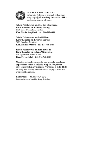 POLSKA RADA SZKOLNA informuje, że lekcje w szkołach polonijnych rozpoczynają się w sobotę 6 września 2014 r. pod następującymi adresami: Szkoła Podstawowa im. Gen. Wł. Sikorskiego Kursy Licealne im. Królowej Jadwigi 6100 Boul. Champlain, Verdun Kier. Maria Karpiński tel.: 514-363-3986 Szkoła Podstawowa im. Emilii Plater Kursy Licealne im. Królowej Jadwigi 5625 Decelles, Montréal Kier. Mariola Wróbel tel.: 514-486-0998 Szkoła Podstawowa im. Jana Pawła II Kursy Licealne im. Adama Mickiewicza 311 Inglewood, Pointe-Claire Kier. Teresa Sobol tel.: 514-762-2922 Msza św. z okazji rozpoczęcia nowego roku szkolnego odprawiona będzie w kościele Misji św. Wojciecha i św. Maksymiliana w niedzielę 7 września o godz. 11:45 Po mszy zapraszamy wszystkie dzieci na pączka i soczek w sali pod kościołem. Lidia Pacak tel.: 514-426-2343 Przewodnicząca Polskiej Rady Szkolnej