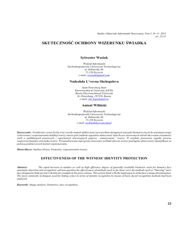Studia i Materiały Informatyki Stosowanej, Tom 5, Nr 11, 2013 str. 23-31 SKUTECZNOŚĆ OCHRONY WIZERUNKU ŚWIADKA Sylwester Wosiak Wydział Informatyki Zachodniopomorski Uniwersytet Technologiczny ul. Żołnierska 49, 71-210 Szczecin e-mail: [email protected] Nadezhda L’vovna Shchegoleva Saint Petersburg State Electrotechnical University (LETI), Russia Electrotechnical University St.-Petersburg, 197376, Russia e-mail: [email protected] Antoni Wiliński Wydział Informatyki Zachodniopomorski Uniwersytet Technologiczny ul. Żołnierska 49, 71-210 Szczecin e-mail: [email protected] Streszczenie: Gwałtowny wzrost liczby oraz wysoki stopień efektywności powszechnie dostępnych narzędzi biometrycznych do automatycznego wykrywania i rozpoznawania ludzkiej twarzy stawia pod znakiem zapytania skuteczność dotychczas stosowanych metod ukrywania tożsamości osób w publikacjach prasowych i reportażach telewizyjnych poprzez „zamazywanie” twarzy. W artykule poruszono aspekty prawne rozpowszechniania wizerunku twarzy. Przeanalizowano najczęściej stosowane techniki ukrycia twarzy pod kątem skuteczności identyfikacji za pomocą podstawowych metod rozpoznawania. Słowa klucze: Analiza obrazu, biometria, rozpoznawanie twarzy. EFFECTIVENESS OF THE WITNESS' IDENTITY PROTECTION Abstract: The rapid increase in number as well as high efficiency degree of generally available biometric tools for human's face automatic detection and recognition call into question the effectiveness of methods used so far these were the methods such as "blurring" one's face designed to hide person's identity for example in the press release. This article deals with the legal aspects of the face's image dissemination. The most commonly techniques used for hiding a face in terms of identity recognition by means of basic facial recognition methods had been analyzed. Keywords: Image analysis, biometrics, face recognition. 23 Wosiak, L’vovna Shchegoleva, Wiliński SKUTECZNOŚĆ OCHRONY WIZERUNKU ŚWIADKA 1. WPROWADZENIE W PROBLEM OCHRONY WIZERUNKU ŚWIADKA Bardzo często w doniesieniach prasowych o ujawnionych aferach korupcyjnych, domniemanych przestępstwach czy też podczas relacjonowanych przez media czynności procesowych, takich jak: zatrzymania i przeszukania możemy spotkać się z upublicznianiem filmów lub zdjęć osób z zasłoniętymi lub zniekształconymi twarzami. Na rys. 1 pokazano trzy warianty najczęściej spotykanych sposobów ukrywania tożsamości osoby. Ze skarg wpływających do Rzecznika Praw Obywatelskich oraz Generalnego Inspektora Ochrony Danych Osobowych wynika jednak, że pomimo tego rodzaju zabiegów osoby, których twarze po zastosowaniu technik ukrywania tożsamości, są bez trudu rozpoznawane przez rodzinę, znajomych, sąsiadów lub współpracowników i ponoszą z tego powodu rozmaite negatywne konsekwencje. Rysunek. 1 Przykładowe zdjęcia zawierające wizerunki osób, zamieszczone w artykułach publikowanych w Internecie123, źródło: opracowanie własne Jakość, a może nieudolność zabiegów mających na celu uniemożliwienie identyfikacji pozostawia bardzo wiele do życzenia i wielokrotnie już spotkała się z krytyką instytucji chroniących prawa człowieka. Postępowanie takie lekceważy podstawowe standardy dziennikarskiej rzetelności i przekracza granice prawa do informacji, naruszając jednocześnie dobra osobiste prezentowanych osób i ich rodzin456. Lekceważenie zasady dyskrecji przez dziennikarzy i zbyt pochopne niestarannie przygotowane 1 http://www.tokfm.pl/Tokfm/1,102433,12395402,Skandal_ w_armii__wojskowy_prokurator_molestowal_kobiety.html ?str=3_11751865. 2 http://polskiemedium.files.wordpress.com/2012/08/mplichta-amber-gold.jpg. 3 Okładka, Wprost, nr 34/2012 (1540). 4 Pismo Rzecznika Praw Obywatelskich L.Dz. DOLiS-035748/08/ z dnia 11.06.2008r. do nadinsp. Andrzeja Matejuka Komendanta Głównego Policji. 24 publikacje powodują wiele szkód i wyrządzają moralną krzywdę nie tylko osobie, której wizerunek został rozpoznany w mediach, ale również jej najbliższym. W myśl art. 5 kodeksu postępowania karnego oskarżonego uważa się za niewinnego, dopóki wina jego nie zostanie udowodniona i stwierdzona prawomocnym wyrokiem. Umieszczenie wizerunku takiej osoby w mediach uderza bezpośrednio w w/w zasadę domniemania niewinności. Rozpoznanie przez najbliższe środowisko osoby, której tożsamość została na wizerunku umieszczonym w mediach nieudolnie ukryta niesie wiele negatywnych konsekwencji. Osoba taka jak i jej najbliżsi są narażone na szykany ze strony sąsiadów, czy też współpracowników. Sytuacja taka może się okazać najbardziej dotkliwa w skutkach także dla dzieci takich osób, ponieważ z racji swojego wieku mogą one mieć problem z przyswojeniem takiej informacji jak i zrozumieniem braku tolerancji otoczenia. Wytoczenie procesów sądowych przez pokrzywdzone w ten sposób osoby, mimo gratyfikacji pieniężnej nie przywróci im często zszarganego imienia i zdrowia psychicznego. Dziennikarz decydujący się na publikację wizerunku powinien mieć świadomość, że roszczenia w przypadku niezawinionego bezprawnego rozpowszechnienia wizerunku należą do roszczeń niemajątkowych, natomiast w przypadku zawinionego bezprawnego rozpowszechnienia wizerunku należą do roszczeń majątkowych. Zarówno odszkodowanie jak i zadośćuczynienie stanowi rekompensatę finansową (ich realizacja polega, bowiem na obowiązku zapłaty określonej kwoty pieniężnej). Ich egzekwowanie następuje na wniosek osoby sfotografowanej lub jej krewnych w linii prostej w przypadku jej zgonu. Krewni mogą występować z pozwem do sądu w okresie 20 lat od śmierci osoby fotografowanej. Czy możliwa jest identyfikacja tożsamości tak ukrytej osoby? W niniejszym artykule przeanalizowano najczęściej stosowane techniki ukrycia bądź też zasłonięcia twarzy (lub 5 Pismo Rzecznika Praw Obywatelskich L.Dz. RPO-682684II/ll/PS z dnia 20.09.2011r. do gen