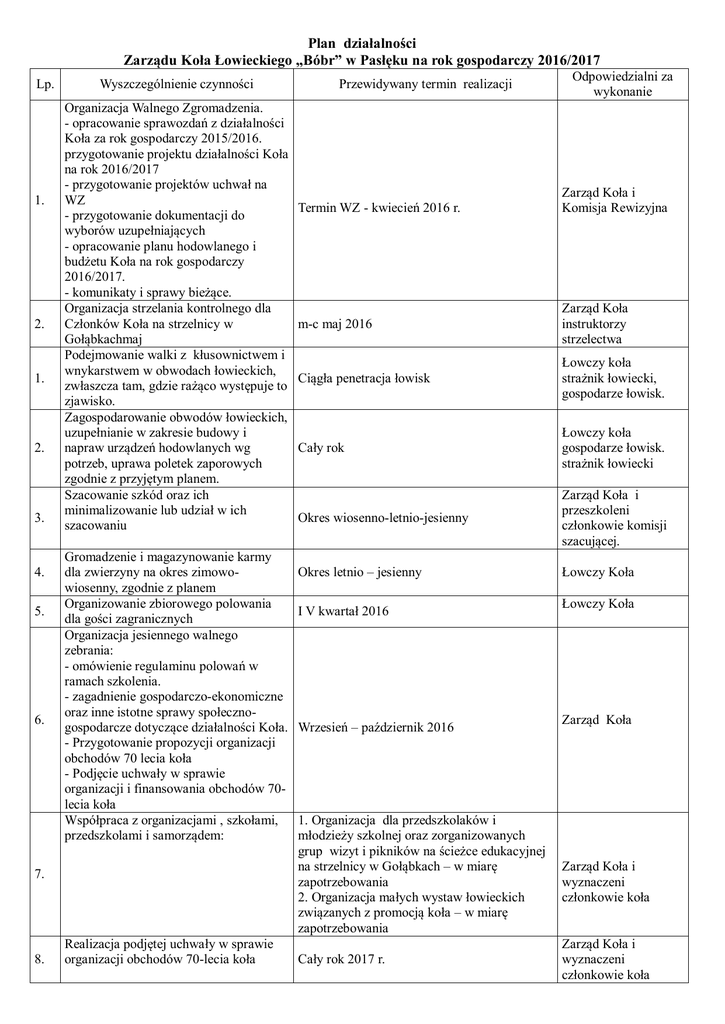 Plan działalności Zarządu Koła Łowieckiego „Bóbr” w Pasłęku na
