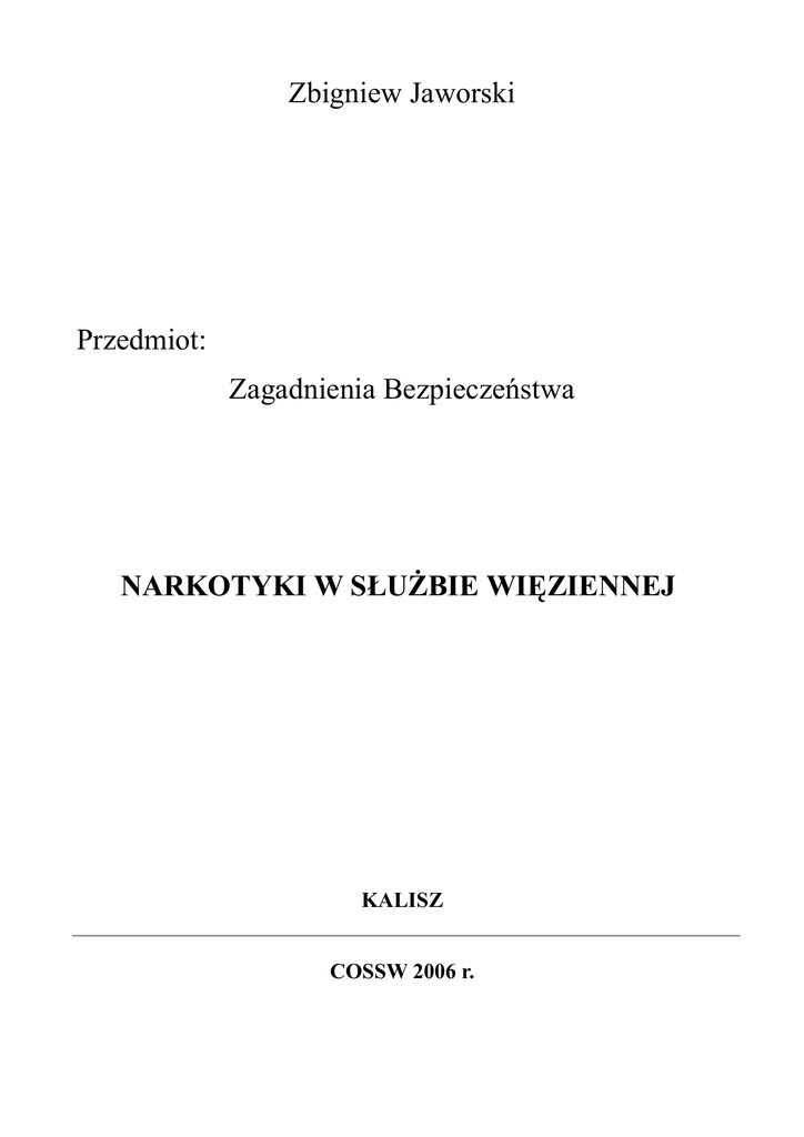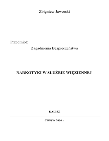 Zbigniew Jaworski Przedmiot: Zagadnienia Bezpieczeństwa NARKOTYKI W SŁUŻBIE WIĘZIENNEJ KALISZ COSSW 2006 r. WSTĘP Narkomania pojawiła się w Polsce wraz z falą kontrkultury młodzieżowej pod koniec lat sześćdziesiątych. Problem narkotyków i narkomanii miał w tym czasie na tyle ograniczone rozmiary, że nie był powszechnie widoczny, zaś media nie nadawały mu rozgłosu. Na początku lat osiemdziesiątych odnotowano gwałtowny wzrost rozmiarów zjawiska. Narkomania lat osiemdziesiątych miała specyficzny, polski charakter. Używane były praktycznie tylko pochodne maku lekarskiego /opiaty/ domowego wyrobu, leki uspokajające i nasenne, środki wziewne. Nowy etap rozwoju zjawiska rozpoczął się wraz z wejściem Polski na drogę przemian ustrojowych. W tym czasie mamy do czynienia w naszym kraju ze znacznym wzrostem rozmiarów problemu narkotyków /1/. Narkomania staje się coraz bardziej niepokojącym problemem społecznym w Polsce. Wraz ze zmianami ilościowymi zachodzą również – o wiele groźniejsze – przeobrażenia jakościowe. Obniża się wiek narkomanów i wzrasta liczba osób zażywających silne środki odurzające i psychotropowe. Polski rynek narkotyczny, czyli rodzaj i dostępność środków uzależniających, nie różni się obecnie od rynku zachodnioeuropejskiego. Oferta handlowa jest równie bogata i urozmaicona. Marihuana, haszysz, amfetamina, LSD czy kokaina wyparły powszechnie dotąd używaną “polską heroinę”. Dobra znajomość podstawowych narkotyków jest jednym z niezbędnych warunków, by funkcjonariusze różnych służb mogli skuteczniej zwalczać przejawy narkomanii i handlu narkotykami. Aby ułatwić przyswojenie tej wiedzy opracowano niniejszy poradnik przeznaczony do szkolenia funkcjonariuszy służby więziennej. PODSTAWOWE AKTY PRAWNE 1. Ustawa o przeciwdziałaniu narkomanii z dnia 29 lipca 2005 r. / Dz. U. Nr 179 poz.1485/. 2. Rozporządzenie Ministra Zdrowia z dnia 26 stycznia 2005 r. / Dz. U. Nr 21 poz. 176/ w sprawie postępowania w celach szkoleniowych ze środkami odurzającymi, substancjami psychotropowymi lub ich preparatami oraz prekursorami grupy I-R, a także warunków ich przechowywania i sposobu niszczenia przez jednostki organizacyjne administracji rządowej wykonujące czynności operacyjnorozpoznawcze. 3. Rozporządzenie Ministra Zdrowia z dnia 22 września 2004 r. / Dz. U. Nr 219 poz.2231/ określające podmioty uprawnione do przechowywania oraz niszczenia środków odurzających, substancji psychotropowych lub ich preparatów oraz prekursorów grupy I-R, a także szczegółowe zasady i warunki ich przechowywania oraz niszczenia. 4. Rozporządzenie Ministra Sprawiedliwości z dnia 07 sierpnia 2000 r. / Dz. U. Nr 77 poz.880/ określające szczegółowe warunki i tryb postępowania leczniczego, rehabilitacyjnego i readaptacyjnego w stosunku do osób uzależnionych umieszczonych w zakładach karnych i aresztach śledczych. 2 PODSTAWOWE POJĘCIA Narkotyk - substancja pochodzenia naturalnego lub syntetycznego, która przyjęta przez żywą istotę, degeneruje jedną lub kilka czynności jej organizmu. Środki psychotropowe - zmieniają percepcję i świadomość. Należą do nich leki przeciwbólowe i depresyjne oraz środki pobudzające i halucynogenne. Środki przeciwbólowe - przynoszą ulgę w bólu, nie powodując utraty świadomości przez osobę zażywającą lek. Są wśród nich zarówno narkotyki, jak i środki nienarkotyczne. Leki depresyjne - oddziaływują na centralny system nerwowy i obniżają jego aktywność, osłabiając jego funkcje życiowe, łącznie z reakcjami. W medycynie są stosowane głównie jako środki uspokajające wywołujące senność. Środki pobudzające - pobudzają i zwiększają aktywność centralnego systemu nerwowego. Niektóre środki pobudzające są legalnie stosowane w terapii np. jako leki zmniejszające apetyt, odchudzające czy antydepresyjne. Środki halucynogenne - działają na centralny system nerwowy wywołując zmiany nastroju i percepcji – od złudzeń czuciowych do halucynacji. Tolerancja - stan, który pojawia się w momencie, gdy organizm traci wrażliwość na narkotyk, co powoduje słabszą reakcję na taką samą dawkę w wypadku powtórnego zażycia. Aby uzyskać taki sam efekt, należy zwiększyć dawkę tego samego narkotyku. Uzależnienie - stan przystosowania się organizmu występujący zazwyczaj po rozwinięciu tolerancji. W jego rezultacie w momencie wstrzymania podawania narkotyku pojawia się wiele symptomów abstynenckich. KLASYFIKACJA NARKOTYKÓW I ICH OPIS Termin “narkotyk” ma zastosowanie zarówno prawne, jak i farmakologiczne. Z prawnego punktu widzenia narkotykiem jest każdy środek /lek/ charakteryzujący się dużymi możliwościami nadużywania i znaczną tendencją do uzależnienia. Termin ten wywodzi się z krajowych i międzynarodowych /2/ przepisów o kontroli nad lekami. W farmakologii, z uwagi na strukturę i działanie, substancje które można nazwać narkotykami, dzielą się na: 1. narkotyki naturalne 2. narkotyki półsyntetyczne 3. narkotyki syntetyczne. 3 AD.1 Narkotyki naturalne OPIUM Jest produktem naturalnym uzyskiwanym poprzez nacinanie niedojrzałych makówek – stężony sok z maku lekarskiego. Gdy sok wycieka z nacięć i krzepnie na powierzchni główki zmienia swój kolor na brązowo-czarny. Jest to surowe opium, które następnie w rafineriach przerabiane jest na morfinę. Opium, jako narkotyk wywołuje uczucie zadowolenia. Jako samoistny narkotyk przyjmowany jest doustnie w postaci naparu, ale najczęściej palony w specjalnych fajkach opiumowych. Kuleczka opium zwana popularnie “dross” używana może być wielokrotnie. MORFINA Jest to narkotyczny środek przeciwbólowy otrzymywany z opium. Przez ponad sto lat uważana była za najlepszy dostępny środek uśmierzający ból. Morfina występuje pod postacią białego proszku, w pigułkach, a także w stanie płynnym w pigułkach. W zależności od ro