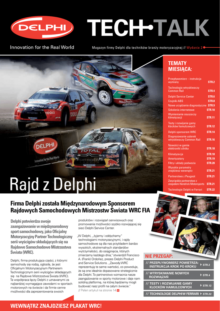 Magazyn firmy Delphi dla techników branży motoryzacyjnej // Wydanie 2 TEMATY MIESIĄCA: Przepływomierz – instrukcja wymiany STR.2 Technologia wtryskiwaczy Common Rail STR.4 STR.6 Delphi Service Center STR.8 Czujniki ABS Nowe urządzenie diagnostyczne STR.9 STR.10 Szkolenia internetowe Wymienianie osuszaczy STR.11 klimatyzacji Testy i rozwijanie gamy klocków hamulcowych STR.12 Delphi sponsorem WRC Diagnozowanie usterek wtryskiwaczy Common Rail Nowości w gamie elektroniki silnika STR.16 STR.18 Klimatyzacja Amortyzatory Filtry i układy podwozia Wysokie parametry znajdziesz wewnątrz Rajd z Delphi STR.14 STR.18 STR.19 STR.20 STR.21 STR.21 Partnerstwo z Peugeot Zwycięskie partnerstwo z zespołem Hendrick Motorsports STR.21 Technologie Delphi w Ferrari STR.22 Firma Delphi została Międzynarodowym Sponsorem Rajdowych Samochodowych Mistrzostw Świata WRC FIA Delphi potwierdza swoje zaangażowanie w międzynarodowy sport samochodowy, jako Oficjalny Motoryzacyjny Partner Technologiczny serii wyścigów składających się na Rajdowe Samochodowe Mistrzostwa Świata (WRC). Delphi, firma produkująca części, z którymi samochody się rodzą, ogłosiła, że jest Oficjalnym Motoryzacyjnym Partnerem Technologicznym serii wyścigów składających się na Rajdowe Mistrzostwa Świata (WRC). Ta współpraca łączy Delphi z uznawanymi za najbardziej wymagające zawodami w sportach motorowych na świecie i da firmie cenne możliwości dla zaprezentowania swoich produktów i rozwiązań serwisowych oraz promowania możliwości szybko rozwijającej się sieci Delphi Service Center. „W Delphi, „żyjemy i oddychamy” technologiami motoryzacyjnymi, i rajdy samochodowe są dla nas przykładem bardzo wysokich, ekstremalnych standardów wytrzymałości, do osiągnięcia, których zmierzamy każdego dnia," stwierdził Francisco A. (Frank) Ordoñez, prezes Delphi Product and Service Solutions. „Zawody WRC reprezentują te same wartości, co powoduje, że są one idealnie dopasowane strategicznie dla Delphi. To partnerstwo wzmacnia nasze zaangażowanie w sporty motorowe i daje nam solidną platformę, na której będziemy mogli budować nasz profil na całym świecie." // Pełen artykuł na stronie 14 TT WEWNĄTRZ ZNAJDZIESZ PLAKAT WRC! NIE PRZEGAP: // P rzepływomierz powietrza: instrukcja krok po kroku // Wtryskiwanie Nowych Rozwiązań // T esty i rozwijanie gamy klocków hamulcowych Str.2 Str.4 Str.12 // T echnologie Delphi w Ferrari Str.22 Przepływomierze powietrza Delphi 1. Za pomocą klucza dynamometrycznego z odpowiednią nasadką odkręć śruby mocujące wlot powietrza. Delikatnie odkręć opaskę i odłącz gumową rurę podłączoną do wlotu zespołu filtra powietrza zawierającego przepływomierz. 5 . Wyjmij wadliwy czujnik z zespołu trzymając rurę przepływową jedną ręką a złącze czujnika drugą ręką. Delikatnie wyciągaj czujnik z rury przepływowej, aż czujnik zostanie w pełni wyjęty. 5 1 2 . Ostrożnie wymontuj zespoł filtra powietrza i umieść go na czystej powierzchni roboczej. 6 . Otwórz opakowanie z nowym czujnikiem. Przenoś czujnik trzymając tylko za złącze (NIE WOLNO dotykać części elektronicznej, gdyż mogłoby to doprowadzić do uszkodzenia czujnika). Wsuń nowy czujnik w rurę przepływową. 2 6 Chciałbyś dowiedzieć się więcej? Szczegółowe informacje o produkcie można znaleźć na www.delphi.com/am 3 . Za pomocą klucza dynamometrycznego z odpowiednią nasadką wymontuj zespół przepływomierza z zespołu filtra powietrza. Dlaczego warto wybrać przepływomierze powietrza firmy Delphi? • J eden nr katalogowy Delphi pasuje do 12 milionów europejskich samochodów osobowych. Przepływomierz powietrza Delphi jest zamiennikiem 23 nr katalogowych OES – znacznie obniżając wielkość zapasów magazynowych. • J akość produktu OE. Przepływomierz powietrza Delphi nie jest regenerowany i posiada specyfikacje nowych części. • Z mniejszony koszt dzięki wyeliminowaniu konieczności wymiany obudowy. • N aprawa jest przyjazna środowisku poprzez wyeliminowanie wymiany obudowy z tworzywa sztucznego. STR.2 Magazyn firmy Delphi dla techników bran ży motoryzacyjnej // Wydanie 2 W celu naprawy i wymiany przepływomierza powietrza postępuj zgodnie ze szczegółową instrukcją... o stwierdzeniu konieczności wymiany P przepływomierza powietrza, należy wykonać następujące kroki w celu demontazu zespołu wadliwego przepływomierza. Sprawdź stan obudowy przepływomierza pod kątem pęknięć materiału z tworzywa. W razie stwierdzenia pęknięć należy wymienić cały element a nie tylko sam czujnik. 3 7. Trzymając rurę przepływową dwoma rękoma, za pomocą kciuków wciśnij czujnik w rurę. 7 4 . Umieść zespół przepływomierza na czystej powierzchni roboczej ze złączem czujnika skierowanym do góry. Następnie, używając odpowiedniej końcówki Torx z otworem odkręć wszystkie śruby. 4 Jeżeli obudowa nie ma pęknięć - postępuj zgodnie ze szczegółową instrukcją wymiany przepływomierza powietrza. Po wymianie czujnika zamontuj kompletny zespół przepływomierza w samochodzie. Delphi.com/am STR.3 Wtryskiwanie Nowych Rozwiązań Philippe Bercher, zastępca dyrektora działu technicznego/ projektowego, Delphi Diesel Systems, rozmawia z Ianem Adcockiem o udoskonaleniach w technice wtrysku Od początku naszym celem było spełnienie przepisów określających emisje oraz redukcja emisji CO2, która jest kolejnym motorem naszych działań. Naszymi priorytetami było zwiększenie ciśnień wtrysku oraz liczby wtrysków. STR.4 2500 bar, a możliwe jest 2700 lub nawet 3000 bar. Na ostatnim kongresie firmy SIA International w Rouen Dla samochodów osobowych i może dla lekkich firma Delphi zaprezentowała raport dotyczący nowych silników wysokoprężnych, możemy nawet zwiększyć rozwiązań w urządzeniach wtrysku paliwa i systemów ciśnienie wtrysku ponad 2400 bar. Ale nie jestem sterowania silnikiem jako sposobów zna