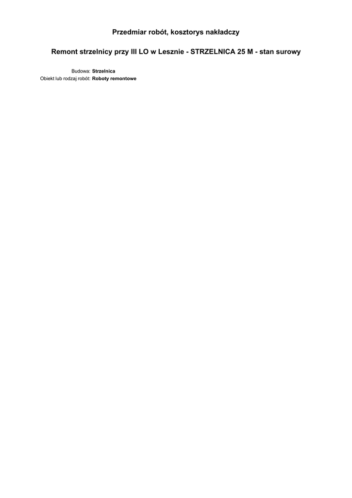 Przedmiar robót, kosztorys nakładczy Remont strzelnicy przy III LO w Lesznie - STRZELNICA 25 M - stan surowy Budowa: Strzelnica Obiekt lub rodzaj robót: Roboty remontowe Przedmiar robót, kosztorys nakładczy <-NR-> <-PODST-> Nr 1 1.1 1.2 1.3 1.4 1.5 1.6 1.7 1.8 Podstawa Kosztorys Element KNR 401/354/7 <-OPIS-> <-JEDN-> Opis robót <-NORMA-> Jm <-ILOSC-> Norma <-CENA-> Ilość <-WARTOSC-> Cena jedn. Wartość Remont strzelnicy przy III LO w Lesznie - STRZELNICA 25 M - stan surowy Roboty rozbiórkowe Wykucie z muru, ościeżnic stalowych lub krat okiennych, powierzchnia szt do 2˙m2 Robocizna razem r-g m2 KNR 401/818/5 Zerwanie posadzki z tworzyw sztucznych Wyliczenie ilości robót: strzelnica 41,28 szatnia męska 10,52 pokój trenerów 7,12 szatnia żeńska 7,80 magazynek 4,20 magazynek zew. 5,70 Robocizna razem KNR 401/348/2 Rozebranie ścianek, z cegieł, zaprawa cem-wap, grubość ścianki 1/4 cegły Wyliczenie ilości robót: ścianki dzielące 2,66*2,55*4 r-g 1,58 RAZEM: 0,18 m2 7 11,060 76,620 41,280000 10,520000 7,120000 7,800000 4,200000 5,700000 76,620 13,792 27,132 RAZEM: 0,55 27,132000 27,132 14,923 Robocizna razem Roboty rozbiórkowe, elementy betonowe niezbrojone, grubości do 15˙cm Wyliczenie ilości robót: posadzki strzelnica 41,28*0,15 szatnia męska 10,52*0,15 pokój trenerów 7,12*0,15 szatnia żeńska 7,80*0,15 magazynek 4,20*0,15 mag. zew. 5,70*0,15 r-g m3 11,493 Robocizna razem KNR 401/348/3 Rozebranie ścianek, z cegieł, zaprawa cem-wap, grubość ścianki 1/2 cegły Wyliczenie ilości robót: ścianka zew. 5,78*0,90 ścianka oporowa w pom. strzelnicy 11,53*0,30 r-g 6,192000 1,578000 1,068000 1,170000 0,630000 0,855000 11,493 158,718 m2 8,661 Robocizna razem KNR 401/349/2 Rozebranie ścian, filarów, kolumn z cegieł, na zaprawie cementowo-wapiennej Wyliczenie ilości robót: rozkucie (poszerzenie) istniejących 0,10*0,25*2,05*6 otworów części poziome w związku z obniżeniem 0,30*0,25*0,80*6 otworów drzwiowych otwór na naświetle wew. 1,88*1,50*0,25 r-g 5,202000 3,459000 8,661 8,228 Robocizna razem KNR 401/106/4 Wykopy nieumocnione o ścianach pionowych wykonane wewnątrz budynku, usuniecie gruzu i ziemi z parteru budynku Wyliczenie ilości robót: strzelnica 41,28*0,30*50% szatnia męska 10,52*0,30 pokój trenerów 7,12*0,30 szatnia żeńska 7,80*0,30 magazynek 4,20*0,30 magazynek zew. 5,70*0,30 r-g m3 16,794 Robocizna razem KNR 401/108/2 Wywóz ziemi samochodami skrzyniowymi, do 1˙km, grunt kategorii III Wyliczenie ilości robót: obm. z poz. 1,8 16,794 r-g m3 6,192000 3,156000 2,136000 2,340000 1,260000 1,710000 16,794 76,245 16,794 KNR 401/212/1 RAZEM: 13,81 RAZEM: 0,95 m3 1,373 0,307500 RAZEM: 7,27 RAZEM: 4,54 RAZEM: 0,360000 0,705000 1,373 9,981 16,794000 16,794 strona nr: 2 <-NR-> <-PODST-> Nr <-OPIS-> Podstawa <-JEDN-> Opis robót Robocizna razem Sprzęt Samochód skrzyniowy do 5 t (1) 1.9 KNR 401/108/4 Wywóz ziemi samochodami skrzyniowymi, ziemia, dodatek za każdy następny 1˙km Krotność=9 Sprzęt Samochód skrzyniowy do 5 t (1) 1.10 KNZ 4/1501/6 Utylizacja ziemi z wykopów (m3 ziemi suchej to 1.4t/m3 x 16,794m3)) Materiały Utylizacja gleby i ziemi 1.11 KNR 401/108/11 Wywóz gruzu spryzmowanego samochodami samowyładowczymi do 1˙km Wyliczenie ilości robót: z poz. 1,2 76,62*0,003 z poz. 1,3 27,132*0,08 z poz. 1,4 11,493 z poz. 1,5 8,661*0,12 z poz. 1,6 0,668 Robocizna razem Sprzęt Samochód samowyładowczy do 5 t (1) 1.12 KNR 401/108/12 Wywóz gruzu spryzmowanego samochodami samowyładowczymi na każdy następny 1˙km Sprzęt Samochód samowyładowczy do 5 t (1) 1.13 KNZ 4/1501/5 Utylizacja gruzu - zmieszane odpady z budowy, remontów i demontażu Wyliczenie ilości robót: z poz. 1,2 76,62*0,003*1,7 z poz. 1,3 27,132*0,08*1,7 z poz. 1,4 11,493*1,7 z poz. 1,5 8,661*0,12*1,7 z poz. 1,6 0,668*1,7 Jm r-g m-g 2.2 Element Roboty remontowo-budowlane KNR 401/304/1 Uzupełnienie ścian lub zamurowanie otworów, zaprawa (1) cementowo-wapienna, cegłami Wyliczenie ilości robót: zamurowanie otworów drzwiowych 0,90*2,05*2 Robocizna razem Materiały Cegła budowlana pełna 25x12x6.5˙cm Cement portlandzki zwykły "35" bez dodatków Piasek do zapraw Wapno suchogaszone (hydratyzowane) Woda Nakłady pomocnicze Materiały inne (Materiały) Sprzęt Betoniarka wolnospadowa elektryczna Wyciąg jednomasztowy z napędem elektrycznym 0.5 t KNR 202/126/5 Otwory w ścianach murowanych, ułożenie nadproży prefabrykowanych Wyliczenie ilości robót: nad otworami drzw. 1,20*2*4 1,50*2 naświetle 2,30*2 Robocizna razem Materiały Nadproża prefabrykowane Nakłady pomocnicze Materiały inne (Materiały) Sprzęt Wyciąg <-ILOSC-> Norma 1,63 0,85 m3 m-g Mg Mg <-CENA-> 14,275 16,794 0,03 4,534 23,51 1 23,510 15,601 r-g RAZEM: 0,86 0,229860 2,170560 11,493000 1,039320 0,668000 15,601 13,417 0,5 7,801 m-g m3 m-g Mg 15,601 0,02 0,312 26,521 RAZEM: 0,390762 3,689952 19,538100 1,766844 1,135600 26,521 1 26,521 m3 3,690 r-g RAZEM: 15,37 3,690000 3,690 56,716 szt kg m3 kg m3 372 61,8 0,322 34,5 0,152 1 372,680 228,042 1,188 127,305 0,561 % m-g m-g m 1,5 0,45 2,11 1,661 7,786 17,200 RAZEM: 0,2 9,600000 3,000000 4,600000 17,200 3,440 m 1,02 17,544 % 1,5 r-g m-g <-WARTOSC-> Ilość Cena jedn. Wartość 27,374 m3 Materiały Utylizacja gruzu - zmieszane odpady z budowy, remontów i demontażu (cena wg cennika MZO Leszno - I/2015) Mg 2 2.1 <-NORMA-> 0,02 0,344 strona nr: 3 <-NR-> Nr 2.3 2.4 2.5 2.6 <-PODST-> <-OPIS-> Podstawa Opis robót KNR 401/306/1 Przymurowanie ścianek z cegieł do ościeży lub powierzchni ścian, (1) zaprawa cementowo-wapienna, grubość 1/4 cegły Wyliczenie ilości robót: wyrównanie rozkutych otworów 0,25*2,05*5 drzwiowych przy otworze - naświetle 1,50*2*0,25 <-JEDN-> <-NORMA-> Jm <-ILOSC-> Norma <-CENA-> Ilość m2 3,313 Robocizna razem Materiały Cegła budowlana pełna 25x12x6.5˙cm Cement portlandzki zwykły "35" bez dodatków Piasek do zapraw Wapno suchogaszone (hydratyzowane) Woda Nakłady pomocnicze Materiały inne (Materiały) Sprzęt Be