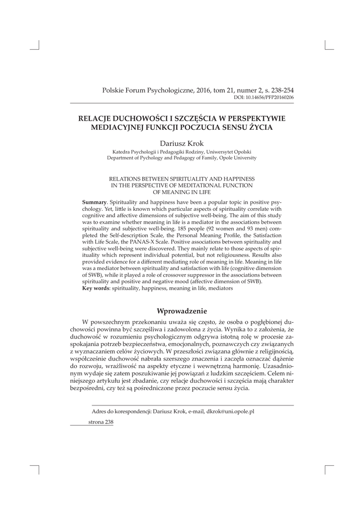 Polskie Forum Psychologiczne, 2016, tom 21, numer 2, s. 238-254 DZȱŗŖǯŗŚŜśŜȦŘŖŗŜŖŘŖŜ ȱ gȱȱ9gȱȱȱ ȱȱȱȱ Dariusz Krok Katedra Psychologii i Pedagogiki Rodziny, Uniwersytet Opolski Department of Pychology and Pedagogy of Family, Opole University RELATIONS BETWEEN SPIRITUALITY AND HAPPINESS IN THE PERSPECTIVE OF MEDITATIONAL FUNCTION OF MEANING IN LIFE Summaryǯȱ¢ȱȱȱȱȱȱȱȱȱȱ¢¢ǯȱǰȱĴȱȱ ȱ ȱȱȱȱ¢ȱȱ ȱ ȱȱěȱȱȱȱ Ȭǯȱȱȱȱȱ¢ȱ ȱȱ¡ȱ ȱȱȱȱȱȱȱȱȱȱ ȱ ¢ȱ ȱ ȱ Ȭǯȱ ŗŞśȱ ȱ ǻşŘȱ ȱ ȱ şřȱ Ǽȱ ȱ ȱ Ȭȱ ǰȱ ȱ ȱ ȱ ęǰȱ ȱ ȱ ȱȱǰȱȱȬȱǯȱȱȱ ȱ¢ȱȱ ȱ Ȭȱ ȱǯȱ¢ȱ¢ȱȱȱȱȱȱ¢ȱ ȱ ȱ ȱ ǰȱ ȱ ȱ ǯȱ ȱ ȱ ȱȱȱȱěȱȱȱȱȱȱǯȱȱȱȱ ȱȱȱ ȱ¢ȱȱȱ ȱȱǻȱȱ ȱǼǰȱ ȱȱ¢ȱȱȱȱȱȱȱȱȱ ȱ ¢ȱȱȱȱȱȱǻěȱȱȱǼǯȱ Key wordsDZȱ¢ǰȱǰȱȱȱǰȱ Wprowadzenie ȱ £¢ȱ £ȱ Čȱ ¿ȱ £¿ǰȱ Čȱ ȱ ȱ Ù¿ȱ ïȱ ȱ¢°ȱ££¿ï ȱȱ£ ȱ£ȱČ¢ǯȱ¢ȱȱ£ȱ£ÙČǰȱČȱ ï°ȱ ȱ £ȱ ¢£¢ȱ ¢ ȱ ȱ ¿ȱ ȱ ȱ £ȱ£ȱ££Ú ǰȱ¢ǰȱ£ £¢ȱ£¢ȱ£ £¢ȱ £ȱ ¢££ȱà ȱČ¢ ¢ǯȱȱ££Ùïȱ£ £ȱÙà ȱ£ȱïǰȱ àÙ£ïȱ ï°ȱÙȱ££ȱ££ȱȱ££¿Ùȱ££°ȱČȱ ȱ £ ǰȱ Č ï°ȱ ȱ ¢ȱ ¢£ȱ ȱ ¿£ȱ ¿ǯȱ £¢ȱ ¢ȱ¿ȱ£ȱ£ ȱȱ £Úȱ£ȱ£ȱ££¿ïǯȱȱ£ȱ¢Ùȱȱ£ǰȱ£¢ȱȱ ïȱȱ££¿ïȱȱȱ £ïǰȱ£¢ȱČȱȱï£ȱ££ȱ£ȱȱČ¢ǯ ȱȱDZȱ£ȱǰȱȬǰ ȓǯǯȱ strona 238 £ȱ £ȱ ïȱȱ££¿ï ȱ ȱ ȱ ȱ ¿ȱ £Čǰȱ Čȱ ȱ ¢£¢ȱ ȱ ȱ °ȱ Čȱ ĊàÙȱ £à ȱ ¢£¢ȱ Č ¢ȱ £ àȱ ïǰȱ ¢ȱ ȱ ¢£ȱ ȱ £ȱ ȱ ȱ¢ȱ¢ȱǻǰȱŘŖŗŖDzȱǰȱŘŖŗřDzȱan Cappellen i in., 2015Ǽǯȱ¢ȱ ȱ£ȱȱ £ȱ ¢ȱ ȱ£ȱȱ¢ ¢ǰȱàȱ¢ ȱ £ ȱ ¿ȱ ȱ £ȱ à ȱ ȱ à ȱ Č¢ ¢ǯȱ ȱ ¢ȱ ȱ ï°ȱ Čȱ£°ȱ£ȱ¢ȱ£Ù ǰȱà¢ȱȱÙȱČ ¢ȱ ȱ¢ ïȱ ȱïȱ££ȱČ¢ǯ ȱ ȱ ¿°ȱ ïǰȱ àȱ ȱ ¿ȱ ȱ àČ¢ȱ ȱ ȱ ǯȱ ȱ ¢¢£¢ȱ ȱ £¿ïȱ ¢¢ȱȱ ïȱDZȱȱ ¢ ï°ȱȱ£ £ȱ£ȱ ¢ȱ¢ǯȱ £Ȭȱ ȱ ££¢Úȱ ǻŘŖŖŚǼȱ ȱ ï°ȱ ȱ ¢£¢¿ȱ Čȱ £Ù ȱ ȱ ȱ £ȱ £ȱ ¿ǰȱ àȱ Čȱ ¢£°ȱ ȱ £ȱ ¢ǰȱ ȱ DZȱ ȱ ǰȱ Č ï°ȱ ¢£ȱ ȱ ǯȱ ȱ ¢ȱ ǻŘŖŖřǼǰȱ ȱ ȱ ïȱ Č¢ȱĊ°ȱȱ ¢¢ǰȱDZȱ£ȱȱȱ££¢ ïǰȱ £àČȱ ¿£¢ȱ ££¢ ïȱ ȱ ȱ ǰȱ Čȱ ȱ ȱ ¢Č£¢ȱ£à ȱï ïǰȱ£ȱȱÙïȱČ¢ǰȱȱ £ȱ¢ȱȱȱ ¿£ȱǯȱȱǻŘŖŖŜǼȱ£ ČǰȱČȱ ¢£ȱ £ȱ ïȱ ȱ ¿ȱ ¢¢DZȱ Ù¿ȱ £ȱ£¢Čïȱȱ£ïǰȱ£ȱȱ ï°ȱȱÚ£ï°ǰȱ £ȱ ¢Č£¢ȱ ȱ £ȱ £ï°ȱ ï £ȱ £ȱ ȱ transcendencji. ȱ¢¢£ȱȱ ïȱȱȱȱ ¢ȱǯȱ¢Ċȱ °ȱȱ ȱïȱȱȱȱǻŘŖŖśǼǰȱ࣢ȱ ȱ ï°ȱ ȱ ȱ ȱ ȱ £ ȱ ï ¿ïȱ ǻǼȱ££ȱ ȱ£ȱïȱ ¢ǯȱȱ£ ȱČȱ £°ȱ ȱ¢ȱȱ¢ȱïȱȱ ¢Čȱ¢ ï°ȱ ȱȱï £ȱ££¢ ïȱȱ ¢ ¢ȱȱ £¢ȱȱȱ¢ȱȱȱȱǻ £Ȭǰȱ££¢ÚǰȱŘŖŖŚǼǯȱg ¿ï°ȱ£ȱȱ¿ǰȱDZȱàǰȱ£ȱ££¢ ï°ǰȱȱ £ȱȱ¢ȱČ¢ȱ Čȱȱ£Ù ǯ ££¿ïȱ ȱ£ȱ¢£¢ȱȱ¿ȱ£¿ïȱȱȱ¢Ùȱ ǰȱ àȱ ȱ Ùȱ Č¢ȱ ȱ ȱ ¢ȱ ȱ £ ȱ ǻ£ÚǰȱŘŖŖŞǼǯȱȱ£ȱȱȱȱ àÙ à ȱǻǰȱǰȱǰȱŘŖŖŞǰȱǯȱřśǼǰȱ££¿ïȱČȱȰȱ£ȱȱ¢£¢ǰȱ à¢ȱ ïȱ ¿ȱ ȱ Ǯ£ £ȱ ȱ ȱ ¿ȱ Ùȱ Č¢Ȅǯȱ ȱ ¢ȱ ȱ£ ȱ££¿ïȱȱ ¢£ȱȱ¢ȱ ÙȱČ¢ȱ£ ȱ ȱ¢ȱÙ DZȱǻŗǼȱ£ £ȱ¢ȱ¢£ȱ£ ȱȱÙǰȱàȱ£ȱ¢¿ȱ£ȱČ¢ȱ£ȱǻŘǼȱȱȱȱ££ȱ££ȱȱï £ȱ£¢¢ ȱȱ¢ ȱ¢ǰȱȱ ȱ £ǯȱ ȱ ȱ ¿ȱ ¢ ȱ Ùǰȱ Čȱ £°ǰȱ Čȱ ££¿ïȱ strona 239 ¿£ȱ¢ȱ ¿£ǰȱȱ£ȱ¿£ȱ¢ȱ£ȱČ¢ȱ£ȱȱ ¿ȱ¿£ȱ £¢¢ǰȱȱȱ£¢¢ȱ£°ǯ ȱȱ £ǰȱČȱ ï°ȱ£ £ȱȱ£ȱ£ȱ££¿ïǯȱ ¢ȱÚȱȱǻŘŖŖŝǼȱ £ǰȱČȱ ï°ȱȱȱ ȱ£ ¿£ȱ £ȱ ££¿ïȱ ȱ £ ȱ £ȱ Č¢ǰȱ ȱ Čȱ Ùȱ ¿ȱ ȱ £ȱ ȱ ȱ ¢ȱ ¢£ȱ £Ùà¢ȱ à ¿ȱ ¢£ǯȱ ¢ȱȱ£ȱǰȱČȱ ï°ȱȮȱ¿ȱ¢£¢ȱ¢ȱȱȮȱ£ȱ¢ ¢ȱČ ȱ¢ ȱ££ȱȱ£ȱ ȱàČ¢ȱ ȱČ¢ǯȱȱȱȱȱ àÙ à ȱǻǰȱǰȱ ǰȱ ŗşşŞDzȱ ǰȱ ŗşşşǼȱ £Ùȱ ¿ǰȱ Čȱ ¢Č£¢ȱ £ȱ ČÚȱ ¢ȱ (ȱǼǰȱ¢ȱȱȱ£¢ǰȱ¢Ùȱ£ £¢ȱ£ȱ ¿£ȱàȱ¢ȱ£ȱČ¢ǰȱ£¢ȱ£ǰȱ£ȱȱ ïȱȱČ£¢ȱ£ȱĚà ȱ ¿£¢ȱȱ à ȱ¢¢ǯȱ ȱ ǻŘŖŖŘǼȱ £Ùȱ £¢¢ ȱ £ £ȱ ïȱ £ȱ £ȱ £ȱ àȱ¢ȱ£ȱČ¢ȱȱ£ȱ££¿ïǯȱ£ïǰȱ ¢ȱ£ȱȱ £Ù¢ǰȱČȱ ï°ȱȱ£¢ȱ¢ȱ¢ȱ£ȱČ¢ȱȱ££¿ïȱ ïàȱà ȱȱà ȱČȱ ¢£ à ȱȱ¢£ǯ ȱ¢ȱ£ȱȱ ǰȱǰȱȱȱȱǻŘŖŖŜǼȱ ¢£ǰȱČȱï°ȱȱ ï°ȱȱ£¢¢ ȱ£ £ȱ£ȱȱ¢£¢ǯȱà ȱ ¢à ȱ £ÙǰȱČȱ ï°ȱ ¢ïȱ ȱ ¿£¢ȱ ȱ£ï°ȱ ¢à ȱ ȱȱČȱï°ǯȱ¢ȱÙ ȱ ïDZȱ£ȱȱȱȱ£ȱ£ȱȱČ¢ȱ¢Ù¢ȱ£¢ȱ ¢ȱȱČȱȱ£¢ȱǰȱDZȱ£¿££ȱȱïÙǰȱ£Č ȱ ȱ¢ ï°ȱȱȱ£ȱǯȱ£¢¢ ȱ£Čïȱ¿£¢ȱ ïȱȱȱ¢£¢ȱ£ ȱČȱ ïàȱ àȱ¢ȱȱ£¢¿ȱȱ£ȱ¢ȱÙ ïȱǻ ǰȱ ǰȱǰȱŘŖŗŖǼȱ£ȱàȱ£¢ȱ¢ȱȱ ïȱȱïȱǻ Ȭ ǰȱĴǰȱŘŖŖşǼǯ £ȱȱČ¢ȱȱ£¢ȱ ȱ¢ ï ȱ ¢ȱ ¢£ȱ £ǰȱ Čȱ £ £ȱ ïȱ ȱ ȱ¢£ȱȱ¢°ȱï£ȱ££ȱ£¢ȱ¢Ù£ǰȱȱ DZȱ ȱ Ù£ǰȱ £ȱ ȱ Č¢ǰȱ ¢£ȱ £¢ȱ £ȱ ȱ ǻǰȱ ŘŖŖŘDzȱ ǰȱ ŘŖŖŞǼǯȱ ïàȱ ¢¢ȱ £¢à ȱ ȱ ȱ £¢ȱ£ȱȱČ¢ǰȱàȱ ȱ£ȱȱ£Ùȱ¿ȱÙ°ȱȱ¢ȱ ȱ£ȱ ïȱǻǰȱŘŖŖşDzȱǰȱŘŖŗŘǼǯ ¢ȱ£ȱ £¢ȱ¢à ǰȱ࣢ȱ£¿ȱ¿ȱ¢ȱȱČ¢ȱ ¢Ùȱǰȱà¢ȱ ÙȱȱČ¢ȱ ȱȱǮ ȱȄȱ¿ȱ£ïȱȱ£ ȱ££ȱȱȱ ȱČ¢ȱǻǰȱŗşŜřǰȱŗşŝşǼǯȱȱȱ ǰȱ £ȱ £ȱ ȱ Č¢ȱ ȱ £ȱ ȱ ȱ ï £ǰȱ ȱ ¢ȱ ȱ £ ¢ȱ ǯȱ Ùȱ ȱ ǻŗşşřǼǰȱ £ȱ ȱ Č¢ȱ ȱ ȱ ¢£Ȭ¢£¢ǰȱ £Č¢ ¢ȱ ȱ £ȱ ȱȱ¢ȱȱÙȱ£¢ǯȱȱȱȱ£¢¢ǰȱàȱ £Ù ȱï £ǰȱÙȱ¿ȱȱǯȱȱĚ¿ȱȱȱ strona 240 Č¢ȱ£ £Ùȱ ȱǻŘŖŖŖǼǰȱȱȱȱ£¿ȱ£Ù ǰȱàȱ ¢Čȱ ¿ȱ ȱ £ȱ àǰȱ ¢ȱ ȱ Č¢ȱ Č ȱ Ùȱȱ£ àȱ ïǯȱ£ȱȱČ¢ȱ£ ȱ£Ù ȱȱ ¿ȱ£Ùïȱ ȱ£ȱ£ ȱȱȱÙ£ȱǻǰȱŘŖŗŖǼǯȱ £¿ȱȱČȱȱ£ȱ£°ȱȱ£ȱ ¢£ ȱȱ¢ȱ¢ȱ ȱČ¢ǯ ȱ ¢ȱ ȱ ¢£¢ȱ ¿ȱ £ȱ ȱ Č¢ȱ £