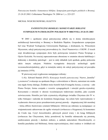 Patrystyczne homilie i komentarze biblijne. Sympozjum patrologów polskich w Brennej, 25-26 IX 2003. Collectanea Theologica 74: 2004 nr 1, s. 223-227. MICHAŁ WOJCIECHOWSKI, OLSZTYN PATRYSTYCZNE HOMILIE I KOMENTARZE BIBLIJNE SYMPOZJUM PATROLOGÓW POLSKICH W BRENNEJ, 25-26 IX 2003 W 2003 r. spotkanie sekcji patrystycznej odbyło się w domu rekolekcyjnym archidiecezji katowickiej w Brennej w Beskidzie Śląskim. Gospodarzem sympozjum był więc Wydział Teologiczny Uniwersytetu Śląskiego, z dziekanem, ks. Wincentym Myszorem; sekcji patrystycznej przewodniczy ks. Józef Naumowicz z UKSW. Z trzech sesji dwudniowego sympozjum dwie były poświęcone tematowi Pisma Świętego u Ojców Kościoła. Na trzeciej zaprezentowano obronione w ostatnim okresie habilitacje i doktoraty z dziedziny patrologii – jest to stały składnik tych spotkań, godny polecenia także innym sekcjom. Niektóre wystąpienia dotyczyły archeologii epoki wczesnochrześcijańskiej, gdyż ta tematyka należy do sekcji patrystycznej od początku jej istnienia (1978). W pierwszej sesji wygłoszono następujące referaty: 1) Ks. Edward Staniek (PAT): Koncepcja homilii patrystycznej. Nazwa „homilia” („rozmowa”) wskazuje na spotkanie Boga z człowiekiem w Słowie, natomiast nie miała ona nigdy formy dialogu. Źródłem treści homilii była Ewangelia Jezusa, a szerzej – całe Pismo Święte; forma czerpała z wzorów synagogalnych i retoryki grecko-rzymskiej. Korzystanie z retoryki w okresie wcześniejszym traktowano nieufnie, jako czynnik zeświecczenia. Homilia jest była czynnością oficjalnego świadka Chrystusa (do IV w. tylko biskupa) i należała do kontekstu liturgicznego. Jej celem było wprowadzenie w wydarzenie zbawcze przez przedstawienie pewnej prawdy – dogmatycznej lub moralnej – którą obficie ilustrowano cytatami biblijnymi. Główne jej odmiany są następujące: a) wtajemniczenie adresowane do ogółu wiernych (zwłaszcza u Orygenesa); b) komentarz do Credo (np. Cyryl Jerozolimski), głównych prawd wiary i do ksiąg biblijnych (zwłaszcza Jan Chryzostom, który postulował, by homilia odznaczała się prostotą, umiłowaniem prawdy i duchem miłości, a unikała naleciałości filozoficznych); c) homilia paschalna (od Melitona), forma najwcześniejsza, choć rzadsza w źródłach niż 1 tamte (do istoty homilii mistagogicznych należała forma ustna; ich zapisywanie zaczęto praktykować dopiero koło 380 r.). 2) Tenże autor przedstawił następnie temat Ojcowie Kościoła mistrzami przepowiadania Słowa Bożego. W jego ramach przedstawił wskazówki homiletyczne formułowane wprost przez niektórych Ojców. Ambroży zalecał np., by dobrać słowo do słuchaczy, umieć słuchać i milczeć; kaznodzieja oddziałuje osobowością. Augustyn w O nauce chrześcijańskiej radzi uczyć się z dobrych wzorów; trzeba żyć zgodnie z tym, co się głosi. Grzegorz z Nazjanzu zwraca też uwagę na wymogi co do odbiorców (nie rzucać pereł przed wieprze). Jan Chryzostom podkreśla również znaczenie pięknej formy: kazanie jest wizytówką Kościoła, potrzebuje i właściwej treści, i kultury słowa. 3) Ks. Mariusz Szram (KUL): Koncepcje komentarza biblijnego w okresie patrystycznym. Jak homilie reprezentują nurt praktyczny komentowania Biblii, tak komentarze – teoretyczny. Chodzi o dzieła systematycznie wyjaśniające księgi biblijne, werset po wersecie. Forma ta korzysta z wzorów żydowskich (peszery, midrasze), komentarzy uczonych greckich i dzieł Filona z Aleksandrii. Wzoruje się też oczywiście na stylu wyjaśniania Pisma Świętego przez Jezusa i św. Pawła. Systematyczne komentowanie Biblii zaczęło się od Orygenesa. Potem rozwinęło się ono w dwóch szkołach: aleksandryjskiej i antiocheńskiej (egzegeza zachodnia jest wtórna, zwykle zależna od aleksandryjskiej). Formy komentarzy (tomoi, commentarii) to komentarze wywodzące się z wykładów (np. Dydym) i z homilii (np. Moralia in Job); zbiory homilii zbliżają się do komentarzy (np. Jan Chryzostom o listach Pawłowych); następnie istniały też scholia (quaestiones) do wybranych tekstów oraz złożone z cytatów kateny (eklogai, catenae). Wspólne cechy gatunku są co do treści następujące: komentarz dąży do wszechstronnej interpretacji tekstu, uwzględniającej wiedzę naukową; profil jest jednak dogmatyczno-moralno-duchowy, a nie historyczny. Co do formy stosowano podział według wersetów; po prologu następował tekst podzielony na księgi według kryterium długości; występują modlitwy wstępne i doksologie oraz elementy homilii. Na to nakładają się różnice między szkołami – Aleksandrią i Antiochią. Dobrym przykładem jest zestawienie komentarzy do Za autorstwa Dydyma i Teodora z Mopswestii. Pierwszy eksponuje symboliczny poziom znaczenia i popisuje się erudycją, drugi czyta księgę jako świadectwo dziejów Izraela i redukuje odniesienia chrystologiczne. Analogicznie różnią się komentarze do NT, w szkole antiocheńskiej bardziej suche i historyczne. 2 Sesja druga dotyczyła tematów bardziej szczegółowych; oto przedstawione referaty: 1) Ks. Enrico dal Covolo SDB (Rzym): L’Omelia 50 del Crisostomo sul Vangelo di Matteo. Po charakterystyce Chryzostoma prelegent zajął się tą homilią. Jej osobliwością jest obszerny wywód wychodzący od jednego tylko wersetu, Mt 14,36; tłumaczy się to kontekstem eucharystycznym, w którym można „dotknąć się Jezusa”. 2) Ks. Waldemar Turek (Rzym): Św. Hilary z Poitiers: niektóre reguły egzegetyczne w „Komentarzu do Ewangelii św. Mateusza”. Komentarz ten powstał ok. 350-356 r., przed wygnaniem na Wschód i poznaniem myśli Orygenesa. Mimo to przejawia pewne podobieństwo do niego, co wskazuje na pośredni wpływ Orygenesa na Zachodzie przed przekładami Rufina. Alegoryzacja ma tu i tam podobny charakter. Hilary rozróżniał sens dosłowny i duchowy (typica ratio, spiritualis intelligentia), ale rozumiał niebezpieczeństwo
