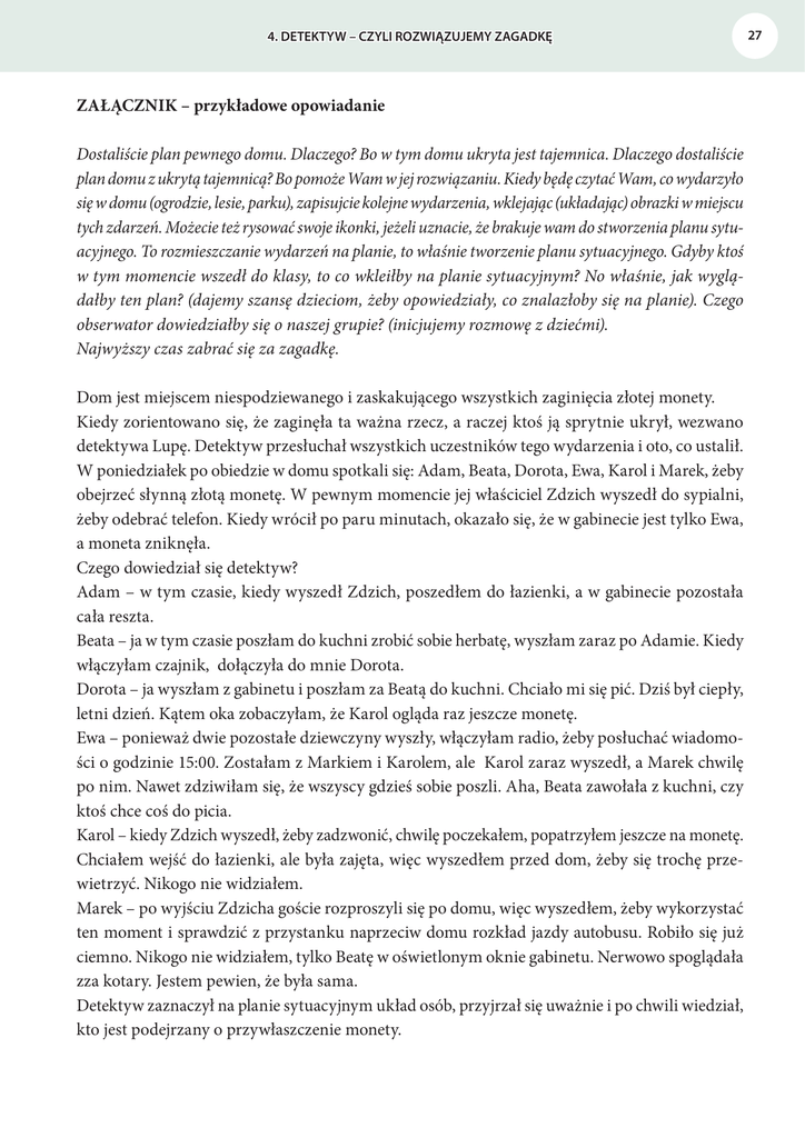 4. DETEKTYW – CZYLI ROZWIĄZUJEMY ZAGADKĘ ZAŁĄCZNIK – przykładowe opowiadanie Dostaliście plan pewnego domu. Dlaczego? Bo w tym domu ukryta jest tajemnica. Dlaczego dostaliście plan domu z ukrytą tajemnicą? Bo pomoże Wam w jej rozwiązaniu. Kiedy będę czytać Wam, co wydarzyło się w domu (ogrodzie, lesie, parku), zapisujcie kolejne wydarzenia, wklejając (układając) obrazki w miejscu tych zdarzeń. Możecie też rysować swoje ikonki, jeżeli uznacie, że brakuje wam do stworzenia planu sytuacyjnego. To rozmieszczanie wydarzeń na planie, to właśnie tworzenie planu sytuacyjnego. Gdyby ktoś w tym momencie wszedł do klasy, to co wkleiłby na planie sytuacyjnym? No właśnie, jak wyglądałby ten plan? (dajemy szansę dzieciom, żeby opowiedziały, co znalazłoby się na planie). Czego obserwator dowiedziałby się o naszej grupie? (inicjujemy rozmowę z dziećmi). Najwyższy czas zabrać się za zagadkę. Dom jest miejscem niespodziewanego i zaskakującego wszystkich zaginięcia złotej monety. Kiedy zorientowano się, że zaginęła ta ważna rzecz, a raczej ktoś ją sprytnie ukrył, wezwano detektywa Lupę. Detektyw przesłuchał wszystkich uczestników tego wydarzenia i oto, co ustalił. W poniedziałek po obiedzie w domu spotkali się: Adam, Beata, Dorota, Ewa, Karol i Marek, żeby obejrzeć słynną złotą monetę. W pewnym momencie jej właściciel Zdzich wyszedł do sypialni, żeby odebrać telefon. Kiedy wrócił po paru minutach, okazało się, że w gabinecie jest tylko Ewa, a moneta zniknęła. Czego dowiedział się detektyw? Adam – w tym czasie, kiedy wyszedł Zdzich, poszedłem do łazienki, a w gabinecie pozostała cała reszta. Beata – ja w tym czasie poszłam do kuchni zrobić sobie herbatę, wyszłam zaraz po Adamie. Kiedy włączyłam czajnik, dołączyła do mnie Dorota. Dorota – ja wyszłam z gabinetu i poszłam za Beatą do kuchni. Chciało mi się pić. Dziś był ciepły, letni dzień. Kątem oka zobaczyłam, że Karol ogląda raz jeszcze monetę. Ewa – ponieważ dwie pozostałe dziewczyny wyszły, włączyłam radio, żeby posłuchać wiadomości o godzinie 15:00. Zostałam z Markiem i Karolem, ale Karol zaraz wyszedł, a Marek chwilę po nim. Nawet zdziwiłam się, że wszyscy gdzieś sobie poszli. Aha, Beata zawołała z kuchni, czy ktoś chce coś do picia. Karol – kiedy Zdzich wyszedł, żeby zadzwonić, chwilę poczekałem, popatrzyłem jeszcze na monetę. Chciałem wejść do łazienki, ale była zajęta, więc wyszedłem przed dom, żeby się trochę przewietrzyć. Nikogo nie widziałem. Marek – po wyjściu Zdzicha goście rozproszyli się po domu, więc wyszedłem, żeby wykorzystać ten moment i sprawdzić z przystanku naprzeciw domu rozkład jazdy autobusu. Robiło się już ciemno. Nikogo nie widziałem, tylko Beatę w oświetlonym oknie gabinetu. Nerwowo spoglądała zza kotary. Jestem pewien, że była sama. Detektyw zaznaczył na planie sytuacyjnym układ osób, przyjrzał się uważnie i po chwili wiedział, kto jest podejrzany o przywłaszczenie monety. 27