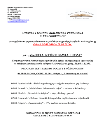 Miejska i Gminna Biblioteka Publiczna Ul. Sądowa 21 47 – 300 Krapkowice tel. 77/4460232 tel/fax. 77/4661319 NIP 756-17-45-445 Regon: 530587785 e-mail: [email protected] www.bibliotekakrapkowice.pl MIEJSKA I GMINNA BIBLIOTEKA PUBLICZNA W KRAPKOWICACH ze względu na zapotrzebowanie czytelnicze organizuje zajęcia wakacyjne w dniach 04.08.2014 – 29.08.2014r. ph.: „ZAJĘCIA, KTÓRE BAWIĄ I UCZĄ” Zorganizowana forma wypoczynku dla dzieci spędzających czas wolny w miejscu zamieszkania odbywać się będzie w godz. 10.00 – 13.00. PROGRAM JEST BARDZO BOGATY I RÓŻNORODNY 04.08-08.08.2014, GODZ. 10.00-13.00 ph.: „Z literaturą na wesoło” 04.08. /poniedziałek/ - Dzień organizacyjny – zajęcia umysłowe, gry i zabawy 05.08. /wtorek/ - „Moi ulubieni bohaterowie bajek” – zabawa w kalambury. 06.08. /środa/ - „Opowieści o książce” – skąd, dla kogo, po co? 07.08. /czwartek/ - Bohater literacki, którego lubię czyli zabawa w bajkolandii 08.08. /piątek/ - „Bookcrossing” – I Ty możesz uwalniać książkę. CODZIENNIE 20 MINUT GŁOŚNEGO CZYTANIA ORAZ ZAJĘĆ KOMPUTEROWYCH Miejska i Gminna Biblioteka Publiczna Ul. Sądowa 21 47 – 300 Krapkowice tel. 77/4460232 tel/fax. 77/4661319 NIP 756-17-45-445 Regon: 530587785 e-mail: [email protected] www.bibliotekakrapkowice.pl 11.08-14.08.2014, GODZ. 10.00-13.00 ph.: „Biblioteczny tydzień plastyczny” 11.08. /poniedziałek/ - „Lato kwiatów” - konkurs plastyczny 12.08. /wtorek/ - „Naszyjnik z piórek - prace plastyczne 13.08. /środa/ - „Tęczowe motyle” – dekoracje biblioteki 14.08. /czwartek/ - „Bohaterowie naszych lektur – bal przebierańców CODZIENNIE 20 MINUT GŁOŚNEGO CZYTANIA ORAZ ZAJĘĆ KOMPUTEROWYCH 18.08-22.08.2014, GODZ. 10.00-13.00 ph.: „Zdobywanie wiedzy też może być przygodą” 18.08./poniedziałek/ - Wierszem o wakacjach – turniej recytatorski 19.08. /wtorek/ - „Wyprawa do Afryki” – konkursy, zagadki, 20.08. /środa/ - „Wyprawa poszukiwaczy skarbów” – wybieramy się w daleką podróż na tereny zamieszkane przez Indian. 21.08. /czwartek/ - Wakacyjna lokomotywa pomysłów – przedstawiamy swoje hobby 22.08. /piątek/ - „Poznajemy swój region” – tradycje, zwyczaje obrzędy rodzinne kultywowane w naszym regionie. CODZIENNIE 20 MINUT GŁOŚNEGO CZYTANIA ORAZ ZAJĘĆ KOMPUTEROWYCH Miejska i Gminna Biblioteka Publiczna Ul. Sądowa 21 47 – 300 Krapkowice tel. 77/4460232 tel/fax. 77/4661319 NIP 756-17-45-445 Regon: 530587785 e-mail: [email protected] www.bibliotekakrapkowice.pl 25.08.-29.08.2014, GODZ. 10.00-13.00 ph.: „Robię to co lubię” 25.08. /poniedziałek/ - „Czar przyrody i krajobrazu naszego regionu: architektura, wyrażenia i zwroty typowe dla naszego regionu i gwary. 26.08. /wtorek/ - „Wierszem o wakacjach” - konkurs recytatorski 27.08. /środa/ - Czytaj z radością, słuchaj z przyjemnością – konkurs pięknego czytania 28.08. /czwartek/ - „Mój ulubiony bohater” - zajęcia plastyczne i umysłowe 29.08. /piątek/ - „Moja miejscowość” – Krapkowice na mapie Opolszczyzny – herb, flaga miasta, logo, dzieje miasta w legendzie i na podstawie historii. CODZIENNIE 20 MINUT GŁOŚNEGO CZYTANIA ORAZ ZAJĘĆ KOMPUTEROWYCH Przedstawiony program może ulec zmianie. Ponieważ tak naprawdę wszystko zależy od dzieci biorących udział w zajęciach bibliotecznych. W lipcu biblioteka zaprasza dzieci spędzające czas w miejscu zamieszkania na zajęcia biblioteczne, które organizowane są w godzinach otwarcia biblioteki. Dzieci mają zapewnioną wspaniałą zabawę, łączącą przyjemne z pożytecznym. Czekamy na Was Dzieci! MiGBP w Krapkowicach Maria Bartoszyńska