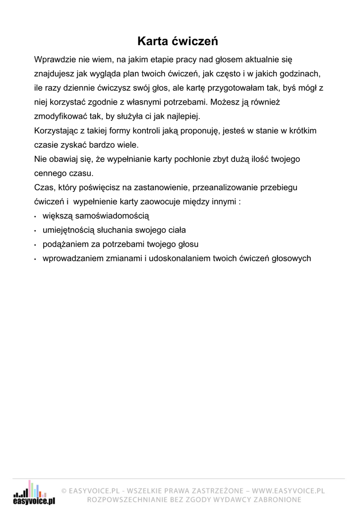 Karta ćwiczeń Wprawdzie nie wiem, na jakim etapie pracy nad głosem aktualnie się znajdujesz jak wygląda plan twoich ćwiczeń, jak często i w jakich godzinach, ile razy dziennie ćwiczysz swój głos, ale kartę przygotowałam tak, byś mógł z niej korzystać zgodnie z własnymi potrzebami. Możesz ją również zmodyfikować tak, by służyła ci jak najlepiej. Korzystając z takiej formy kontroli jaką proponuję, jesteś w stanie w krótkim czasie zyskać bardzo wiele. Nie obawiaj się, że wypełnianie karty pochłonie zbyt dużą ilość twojego cennego czasu. Czas, który poświęcisz na zastanowienie, przeanalizowanie przebiegu ćwiczeń i wypełnienie karty zaowocuje między innymi : • większą samoświadomością • umiejętnością słuchania swojego ciała • podążaniem za potrzebami twojego głosu • wprowadzaniem zmianami i udoskonalaniem twoich ćwiczeń głosowych Instrukcja Karta jest podzielona na kilka działów, w ramach których mieszczą się albo konkretne ćwiczenia lub grupy ćwiczeń (przykłady podaję poniżej): ROZGRZEWKA I PRZYGOTOWANIE – rozluźnienie ciała (relaksacja, masaż, stretching itp.) – ćwiczenia psychostymulacyjne – rozgrzewka narządu głosowego (ćwiczenia krtani, podniebienia, języka, warg, policzków, żuchwy) – rozgrzewka głosu ( ćwiczenia przygotowujące głos do mowy, ćwiczenia rozśpiewujące) ĆWICZENIA ODDECHOWE – ćwiczenia prawidłowego wdechu – ćwiczenia długiej fazy wydechowej – ćwiczenia podparcia oddechowego ĆWICZENIA FONACYJNE – ćwiczenia średnicy głosu – ćwiczenia miękkiego ataku głosowego – ćwiczenia właściwej pozycji dźwięku – ćwiczenia modulowania wysokości, siły głosu – ćwiczenia legato- staccato ĆWICZENIA REZONANSU – ćwiczenia rezonatorów dolnych – ćwiczenia rezonatorów górnych (nasady) – ćwiczenia rejestrów – ćwiczenia osadzania głosu na „masce” ĆWICZENIA DYKCYJNE – ćwiczenia samogłosek, spółgłosek, sylab, trudnych połączeń sylabowych i wyrazowych – ćwiczenia z użyciem „łamańców językowych” ĆWICZENIA WOKALNE – wszelkie ćwiczenia z użyciem głosu śpiewanego W każdym dziale wpisujesz: • ćwiczenie, które wykonujesz • przebieg- wynik • uwagi, obserwacje przykładowo: ĆWICZENIA ODDECHOWE: ĆWICZENIE Ćwiczenie wydłużające fazę wydechową: liczenie wron PRZEBIEG- WYNIK UWAGI , OBSERWACJE 1próba= 13 żadnych trudności w wykonywaniu ćwiczenia 2= 12 albo 3= 12 trudności z utrzymaniem rozszerzenia żeber, zbyt duża ilość wypuszczanego powietrza, itd. 4=12 Poza tymi działami znajduje się miejsce na chwilę refleksji przed rozpoczęciem i po zakończeniu ćwiczeń: – SAMOPOCZUCIE FIZYCZNE – SAMOPOCZUCIE PSYCHICZNE ● w tej części karty ważne jest aby określić jak się czujemy przed przystąpieniem do ćwiczeń, jakie mamy nastawienie, chęci, motywację, czy występują jakieś niekorzystne czynniki (ból, pogoda, problemy rodzinne, problemy zawodowe itp. ) Warto też w wyznaczonym miejscu zapisać datę ćwiczeń, określić dzień tygodnia i godzinę- po jakimś czasie możesz na podstawie analizy zapisów dojść do wniosku, że są pewne dni, godziny najbardziej korzystne do ćwiczeń i w związku z tym możesz wprowadzić odpowiednie zmiany. Prowadź obserwacje w miarę systematycznie, bo zmieniamy się wraz z upływem czasu i dzięki temu, czego doświadczamy każdego dnia. Co jakiś czas może się zatem pojawić konieczność wprowadzenia kolejnej zmiany, więc bądź na nią otwarty. PODSUMOWANIE, OBSERWACJE, UWAGI, ZALECENIA Obserwacje i uwagi zapisujesz przy każdym wykonywanym ćwiczeniu, dzięki czemu wiesz, nad czym musisz popracować, co robisz w czasie wykonywania ćwiczenia źle i co trzeba poprawić. Możesz też napisać, że ćwiczenie wykonujesz już prawidłowo, bez żadnych trudności, osiągasz wymagane wyniki w związku z tym wiesz, że możesz przejść do ćwiczeń trudniejszych, bardziej wymagających. W tej części zaś możesz podsumować cały czas poświęcony na ćwiczenia w kontekście tego, co pisałeś na początku- a więc czy twoje samopoczucie się poprawiło, pogorszyło, czy w związku z tym jak się czułeś pojawiły się trudności w trakcie ćwiczeń itp. Możesz napisać o tym, co osiągnąłeś dziś dzięki ćwiczeniom i przyjąć tu postawę nauczyciela, który wyznacza dalsze cele. Koniecznie napisz do siebie kilka miłych słów- pochwal się, a gdy coś nie było po twojej myśli napisz do siebie coś co chciałbyś powiedzieć sobie (ciepło tłumacząc)- zniecierpliwionemu dziecku- ale już z pozycji dojrzałego, doświadczonego człowieka. DATA: ..................................................... GODZINA: .............................................. Samopoczucie fizyczne: ......................................................................................................................... ......................................................................................................................... ......................................................................................................................... ......................................................................................................................... ......................................................................................................................... ......................................................................................................................... ......................................................................................................................... ......................................................................................................................... ......................................................................................................................... ..................................................................................