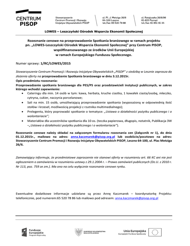 LOWES – Leszczyński Ośrodek Wsparcia Ekonomii Społecznej Rozeznanie cenowe na przeprowadzenie Spotkania branżowego w ramach projektu pn. „LOWES-Leszczyński Ośrodek Wsparcia Ekonomii Społecznej” przy Centrum PISOP, współfinansowanego ze środków Unii Europejskiej w ramach Europejskiego Funduszu Społecznego. Numer sprawy: 1/RC/LOWES/2015 Stowarzyszenie Centrum Promocji i Rozwoju Inicjatyw Obywatelskich „PISOP” z siedzibą w Lesznie zaprasza do złożenia oferty na przeprowadzenie Spotkania branżowego w dniu 3.12.2015r. Opis przedmiotu rozeznania: Przeprowadzenie spotkania branżowego dla PES/PS oraz przedstawicieli instytucji publicznych, w zakres którego wchodzi zapewnienie: Cateringu dla min. 14 osób w tym: kawa, herbata, kruche ciastka, 1 kawałek ciasta/osobę, mleczko, cytryna, cukier, naczynia porcelanowe; Sali na min. 15 osób, umożliwiającą przeprowadzenie spotkania (wyposażoną w odpowiednią ilość stołów i krzeseł, możliwością projekcji z rzutnika multimedialnego); Prelegenta, który poprowadzi spotkanie o tematyce: „Ustawa o działalności pożytku publicznego i o wolontariacie”; Materiałów dla uczestników spotkania dla 10 os. (teczka papierowa, długopis, notatnik, Publikacja 3W –„Ustawa o działalności pożytku publicznego i o wolontariacie”). Rozeznanie cenowe należy składać na załączonym formularzu rozeznania cen (Załącznik nr 1), do dnia 01.12.2015r., mailowo na adres: [email protected] lub osobiście/pocztowo na adres: Stowarzyszenie Centrum Promocji i Rozwoju Inicjatyw Obywatelskich PISOP, Leszno 64-100, ul. Plac Metziga 26/6. Zamawiający informuje, że przedmiotowe zaproszenie nie stanowi oferty w rozumieniu art. 66 KC ani nie jest ogłoszeniem o zamówieniu w rozumieniu ustawy z 29.1.2004 r. – Prawo zamówień publicznych (Dz.U. z 2010 r. Nr 113, poz. 759 ze zm.). Ma ono na celu wyłącznie rozeznanie cenowe rynku. Ewentualne dodatkowe informacje udzielane są przez Annę Kaczmarek – koordynatorkę Projektu: telefonicznie, pod numerem:65 520 78 86 lub mailowo pod adresem: [email protected] LOWES – Leszczyński Ośrodek Wsparcia Ekonomii Społecznej Załącznik nr 1 Formularz rozeznania cen nr 1/RC/LOWES/2015 na przeprowadzenie Spotkania branżowego I. Dane wykonawcy 1 Nazwa wykonawcy 2 Adres 3 Osoba do kontaktów roboczych 4 E-mail LP. 1 2 3 4 Nazwa przedmiotu rozeznania Tel./fax Specyfikacja kawa/herbata dla każdego z 14 uczestników; kruche ciasteczka; ciasto Catering dla uczestników spotkania domowe - 1kawałek ciasta/osobę; branżowego w dniu 3.12.2015r mleczko; cytryna; cukier; naczynia porcelanowe; woda mineralna niegazowana 0,5 l/osobę Jednostka miary usługa Sala da uczestników spotkania branżowego Sala zlokalizowana na trenie Miasta Leszna dla min. 15 osób z zapewnieniem niezbędnej infrastruktury do przeprowadzenia spotkania (wyposażona w stoły, krzesła w odpowiedniej ilości dla 15 osób, oraz możliwość projekcji multimedialnej - wyposażona w rzutnik oraz ekran) usługa Prelegent Osoba posiadająca wiedzę i przygotowanie trenerskie do przeprowadzenia spotkania nt: „Ustawa o działalności pożytku publicznego i o wolontariacie” godzina (45 min.) 1 zestaw: teczka papierowa, długopis, notatnik, Publikacja 3W - "Ustawa o Materiały dla uczestników spotkania działalności pożytku publicznego i o wolontariacie" - dla łącznie 10 os.=10 zestawów zestaw Cena brutto (zł)