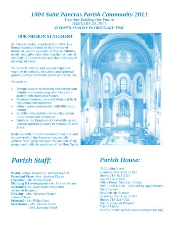 1904 Saint Pancras Parish Community 2011 Together Building Our Future FEBRUARY 20, 2011 SEVENTH SUNDAY IN ORDINARY TIME OUR MISSION STATEMENT St. Pancras Parish, established in 1904, is a Roman Catholic Parish of the Diocese of Brooklyn. We are a people of diverse cultures, needs, and gifts who come together as part of the Body of Christ to live and share the gospel message of Jesus. We value family life and our participation together in worship, education and spiritual growth, service to human needs and social life. We seek to: Become a more welcoming and caring community, communicating new ideas integrated with traditional values. Promote harmony, reconciliation and healing among our members. Form a more enthusiastic faith-filled community. Establish responsible stewardship of our time, talents and resources. Embrace the Kingdom of God while on our mutual spiritual journey to eternal life with Jesus. In the security of God’s unconditional love and empowered by the Resurrection, we will achieve these goals through the wisdom of the gospel and with the guidance of the Holy Spirit. Parish Staff: Parish House: Pastor:~Msgr. Gregory C. Wielunski J.C.D. Parochial Vicar:~Rev. Andrzej Klocek Organist:~ Mr. Steven Frank Planning & Development:~Mr. Vincent Arcuri Secretary:~Ms. Rose Marie Fitzsimons School of Religion: Director~ Mrs. Margaret Walter Parish School: Principal~ Mr. Philip Ciani Secretaries~ Mrs. Sharon Fisher ~ Mrs. Lorraine Ursol 72-22 68th Street Glendale, New York 11385 Phone: 718- 821-2323 Fax: 718-417-8021 Office Hours: Monday - Friday 9:00 – 1:00 & 2:00 – 4:30 and by appointment Parish School: 68-20 Myrtle Avenue Glendale, New York 11385 Phone: 718-821-6721 Parish School of Religion: 718-497-0590 visit us on the Web at: www.saintpancras.org We Celebrate… Sunday Mass 4:30 pm— Saturday Vigil 7:45, 9:00 (Polish), 10:15, 11:30 am Weekday Mass 8:30 am— Monday—Saturday Mass Intentions For the Week Sun 7:45 9:00 Holy Day Mass As announced in bulletin and at Sunday 10:15 11:30 Mass Mon 8:30 The Sacrament of Baptism Tue Baptism will take place on the 4th Sun8:30 day of the month at 2:00 pm. Parents must register at the parish office. An InWed structional Class for parents is held on 8:30 the 3rd Monday of the month at 7:30 pm in the Church. Parents must be regisThr tered members of the parish and pre8:30 sent the child’s birth certificate to regisFri ter for Baptism. 8:30 Chrzest w jezyku polskim w kazda Sat pierwsza niedziele miesiaca o 8:30 godzinie 13:00. Przypominsmy iz rodzice Proszacy o chrzest swojego 4:30 dziecka powinni byc zare- Sun February 20, 2011 SEVENTH SUNDAY IN ORDINARY TIME Harriet Ophoff (Rodriguez Family) Jan Saletra (Tomasz Saletra) Dario Cairo (Patricia & Bob Matheis) People of the Parish February 21, 2011 Maurice Hallahan (Catherine Kiely) February 22, 2011 Rosaria Scarpinato (Mr. & Mrs. Vincent Rannazzisi) February 23, 2011 Louie Gianesese (Mr. & Mrs. H. Irwin & Family) February 24, 2011 Mathias Fink (Mary & JoAnn) February 25, 2011 Maria Caliari 6th Anniversary (Family) February 26, 2011 Alois Kump (Anne Marie Tschinkel & Michael Schneider) Frankie Harris (Christina Lev) February 27, 2011 EIGHTH SUNDAY IN ORDINARY TIME People of the Parish Salvatore Salanitro (Rose Marie) Dario Cairo (Gary Moylan) Robert & Emma Hoenigmann (Elfi) jestrowanymi parafianami sw. Pank7:45 racego. 9:00 10:15 The Sacrament of Penance 11:30 3:30 pm Saturday or by appointment Prayer Opportunities The Sacrament of Marriage Couples must make arrangements with Miraculous Medal Novena: The Novena to Our one of the Priests at least six months Lady of the Miraculous Medal is prayed Monday morning at 8:15 am before Mass. prior to making any other arrangements. Please log on to www.pre-cana.org for The Rosary: This devotion reflects the important complete information about marriage events in the life of Jesus and His Mother, Mary, and preparation in our Diocese. enriches your daily prayer life. Please pray the roThe Sacrament of Anointing the Sick Is administered upon request following the 8:30 am Mass on Saturday. Please call no later than 3:00 pm Friday afternoon to make arrangements. sary privately or with the parishioners each morning following 8:30 am Mass. Scripture Study Group: The group meets Thursday at 7:30 pm to discuss the readings of the coming Sunday. Discover the depth of the scripture and the context in which it was written. BLOOD DRIVE Oddanie swojej krwi może ocalić komuś życie! Zachęcamy gorąco do włączenia się w akcję Give Blood. Save Lives krwiodawstwa która zostanie przeprowadzona w budynku szkoły w Pfeifer Hall w niedzielę, 6 marca 2011 roku w Donating blood saves lives! godzinach między 8:30 a 14:30. Wymagania dotyczące Please donate blood at our blood chętnych do oddania krwi są następujące: a) Trzeba być w drive scheduled on Sunday, wieku pomiędzy 17 a 75 rokiem życia. Osoby w wieku lat March 6, 2011 from the hours of 8:30 am to 2:30 pm at Pfeifer 16 mogą oddać krew za zgodą rodziców, osoby w wieku Hall. To be eligible to donate, ponad 75 lat muszą posiadać rekomendację lekarza. (b) you must be between the ages of Trzeba mieć wagę minimum 50 kilogramów i cieszyć się 17 – 75 (16 year olds with dobrym zdrowiem. Zachęcając do oddania krwi parental consent, and over 76 przypominamy iż krew oddana przez jedną osobę może and older with a doctor’s note), weigh at least ocalić życie nawet trzech ludzi gdyż oddana krew jest 110 pounds and be in good health. The blood rozdzielana w zależności od potrzeby różnym chorym. you donate can save up to three lives because each donation is broken down into parts and Ochotnicy do oddania krwi mogą wyrazić swoją wolę given to different people. Call the church office dzwoniąc do biura parafialnego lub podpisując deklarację to pledge or sign up to help. Sign up Sunday will które będą udostępnione w niedzielę 27 lutego. W ten be held on Sunday, February 27 when a r