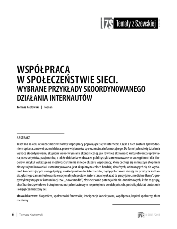 Nr 2(10) / 2013 WSPÓŁPRACA W SPOŁECZEŃSTWIE SIECI. WYBRANE PRZYKŁADY SKOORDYNOWANEGO DZIAŁANIA INTERNAUTÓW Tomasz Kozłowski | Poznań ABSTRAKT Tekst ma na celu wskazać możliwe formy współpracy pojawiające się w Internecie. Część z nich została z powodzeniem opisana, a nawet przewidziana, przez wizjonerów społeczeństwa informacyjnego. Do form tych należą działania wysoce skoordynowane, skupione wokół wymiany ekonomicznej, jak również aktywność kulturotwórcza uprawiana przez artystów, pasjonatów, a także działania w obszarze publicystyki zarezerwowane w szczególności dla blogerów. Artykuł wskazuje na możliwość istnienia innego obszaru współpracy, który cechuje się mniejszym stopniem zinstytucjonalizowania i ustrukturyzowana, jest skupiony na celach bardziej doraźnych, odnoszących się do wydarzeń koncentrujących uwagę tysięcy, niekiedy milionów internautów, będących czasem okazją do przeżycia katharsis, głośnego zamanifestowania emocjonalnych postaw. Autor stara się ukazać te grupy jako „medialne tłumy”, grupy wykorzystujące w komunikacji tzw. „nowe media”, złożone z osób potencjalnie nie-anonimowych, które to grupy, choć bardzo żywiołowe i skupione na natychmiastowym zaspokojeniu swoich potrzeb, potrafią działać skutecznie i osiągać zamierzony cel. słowa kluczowe: blogosfera, społeczności fanowskie, inteligencja konektywna, współpraca, kapitał społeczny, tłum medialny 6 Tomasz Kozłowski Nr 2(10) / 2013 Zjawiska społeczne, jakie funkcjonują w rzeczywistości Internetu, od dawna już są przedmiotem socjologicznej i psychologicznej refleksji. Nie ulega wątpliwości, że Internet jest dogodną płaszczyzną działań społecznych, środowiskiem, które staje się okazją do nowych form funkcjonowania, działania, komunikowania się z otoczeniem. Literatura przedmiotu pełna jest sugestywnych opisów form takich działań, nie brak jest szczegółowej charakterystyki grup, jakie konstytuują się w Internecie; przedmiotem badań stają się również zjawiska stricte psychologiczne i poznawcze. Innymi słowy, rzeczywistość sieci staje się ważną, jeśli nie dominującą przestrzenią funkcjonowania współczesnego społeczeństwa, a także jego poszczególnych członków, we wszystkich możliwych wymiarach1. Znaczenia Internetu nikt nie kwestionuje, choć naturalnie w dyskursie obecne są zróżnicowane interpretacje dotyczące kierunku tego rodzaju zmian. W obszarze tej dyskusji, co zupełnie zrozumiałe, znalazło się także miejsce dla analiz form współpracy, jakie możliwe są w Internecie. Na tym gruncie z pewnością wyróżniająca jest praca Dona Tapscotta, Gospodarka cyfrowa2, która choć pisana jeszcze u początków ery cyfrowej, okazała się w wielu swych przewidywaniach trafna. Tapscott na jej łamach szczegółowo opisuje możliwości współdziałania w obszarze zjawisk gospodarczych, jakie rysują się wraz z upowszechnieniem technologii komunikacyjnych rozprzestrzeniających się wraz z zasięgiem Internetu. Autor wskazuje na możliwości ogólnie rozumianego przyśpieszenia wszelkiego rodzaju operacji, zwiększenia ich zasięgu, dotarcia do potencjalnych klientów, reakcji na zapotrzebowanie rynku w danych obszarach. Kreśli przy tym pejzaż zupełnie nowych układów ekonomicznych, redukcji uciążliwych procedur, poprawy wydajności, etc. Jest to wizja ze wszech miar optymistyczna, niepozbawiona zresztą w wielu miejscach podstaw. W istocie, kilka lat po publikacji Tapscotta wiele z jego rozważań okazało się proroczymi. Gospodarka zdołała wykształcić nowatorskie formy współpracy, produkcji, komunikacji, dystrybucji dóbr, badań preferencji klienta, kreowania potrzeb konsumenckich, etc. Zjawiska te, równie szczegółowo opisane zresztą w Wikinomii, nie byłyby możliwe bez obecności Internetu. Nie zamierzam w tym miejscu polemizować ani z Tapscottem, ani z innymi piewcami możliwości, jakie roztacza przed nami „krzemowe remedium”, jak eufemistycznie określa Internet Clifford Stoll3. 1 » 2 » 3 » Zob. D. Tapscott, Gospodarka cyfrowa. Nadzieje i niepokoje ery świadomości systemowej, tłum. A. Święch, Warszawa: Business Press, 1998; D. Tapscott, A.D. Williams, Wikinomia. O globalnej współpracy, która zmienia wszystko, tłum. P. Cypryański, Warszawa: Wydawnictwa Akademickie i Profesjonalne, 2006; M. Castells, Galaktyka Internetu. Refleksje nad Internetem, biznesem i społeczeństwem, tłum. T. Hornowski, Poznań: Dom Wydawniczy REBIS, 2003; P. Wallace, Psychologia internetu, tłum. T. Hornowski, Poznań: Dom Wydawniczy REBIS, 2003; C. Stoll, Krzemowe remedium. Garść rozważań na temat infostrady, tłum. T. Hornowski, Poznań: Dom Wydawniczy REBIS, 2000; H. Jenkins, Kultura konwergencji. Zderzenie starych i nowych mediów, tłum. M. Bernatowicz, M. Filiciack, Warszawa: Wydawnictwa Akademickie i Profesjonalne, 2007; P. Winterhoff-Spurk, Psychologia mediów, tłum. P. Włodyga, Warszawa, WAM Wydawnictwo, 2007; J. Spiller, Online addicts, „Internet Today” 1996, nr 3. D. Tapscott, dz. cyt. C. Stoll, dz. cyt. Współpraca w społeczeństwie sieci. Wybrane przykłady skoordynowanego działania internautów 7 Nie ulega jednak wątpliwości, że podobne formy współpracy rysują się w tej perspektywie jako te zarezerwowane dla obszaru czysto ekonomicznego. Można postawić tezę, że są to działania, które z samej natury ekonomii powinny pojawić się w każdej możliwej przestrzeni. Społeczeństwo, gdziekolwiek by się „nie działo”, również w Internecie, musi umożliwić powstanie jakiej bądź platformy wymiany. Gospodarka, podobnie jak natura, nie znosi pustki i jej niewidzialna ręka prędzej czy później zasiedla wszystkie możliwe nisze. Innymi słowy, współpraca, która prowadzi do czysto ekonomicznych, wymiernych efektów jest tylko jedną z możliwych, wymuszoną przez konieczność samego funkcjonowania społeczeństwa. P