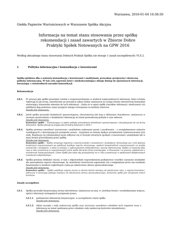Warszawa, 2016-01-04 10:36:50 Giełda Papierów Wartościowych w Warszawie Spółka Akcyjna Informacja na temat stanu stosowania przez spółkę rekomendacji i zasad zawartych w Zbiorze Dobre Praktyki Spółek Notowanych na GPW 2016 Według aktualnego stanu stosowania Dobrych Praktyk Spółka nie stosuje 1 zasad szczegółowych: VI.Z.2. I. Polityka informacyjna i komunikacja z inwestorami Spółka giełdowa dba o należytą komunikację z inwestorami i analitykami, prowadząc przejrzystą i skuteczną politykę informacyjną. W tym celu zapewnia łatwy i niedyskryminujący nikogo dostęp do ujawnianych informacji, korzystając z różnorodnych narzędzi komunikacji. Rekomendacje I.R.1. W sytuacji gdy spółka poweźmie wiedzę o rozpowszechnianiu w mediach nieprawdziwych informacji, które istotnie wpływają na jej ocenę, niezwłocznie po powzięciu takiej wiedzy zamieszcza na swojej stronie internetowej komunikat zawierający stanowisko odnośnie do tych informacji - chyba że w opinii spółki charakter informacji i okoliczności ich publikacji dają podstawy uznać przyjęcie innego rozwiązania za bardziej właściwe. Zasada jest stosowana. I.R.2. Jeżeli spółka prowadzi działalność sponsoringową, charytatywną lub inną o zbliżonym charakterze, zamieszcza w rocznym sprawozdaniu z działalności informację na temat prowadzonej polityki w tym zakresie. Zasada jest stosowana. Komentarz spółki : Funkcjonująca w spółce polityka prowadzenia działalności sponsoringowej i charytatywnej nie ma formy dokumentu. Spółka planuje ją przyjąć jako formalny dokument w 2016 r. I.R.3. Spółka powinna umożliwić inwestorom i analitykom zadawanie pytań i uzyskiwanie – z uwzględnieniem zakazów wynikających z obowiązujących przepisów prawa - wyjaśnień na tematy będące przedmiotem zainteresowania tych osób. Realizacja tej rekomendacji może odbywać się w formule otwartych spotkań z inwestorami i analitykami lub w innej formie przewidzianej przez spółkę. Zasada jest stosowana. Komentarz spółki : Spółka utrzymuje regularny i otwarty kontakt z inwestorami i analitykami. Komunikuje się z nimi podczas konferencji organizowanych po publikacji każdego raportu okresowego, spotkań bezpośrednich organizowanych na prośbę inwestorów i analityków, a także na bieżąco z wykorzystaniem telekonferencji i poczty elektronicznej. Spółka co najmniej kilka razy w roku uczestniczy w organizowanych przez siebie lub przez firmy inwestycyjne, w Warszawie i za granicą, spotkaniach z inwestorami instytucjonalnymi. Celem Spółki jest także aby przynajmniej raz w roku uczestniczyć w spotkaniach dedykowanych inwestorom indywidualnym. I.R.4. Spółka powinna dokładać starań, w tym z odpowiednim wyprzedzeniem podejmować wszelkie czynności niezbędne dla sporządzenia raportu okresowego, by umożliwiać inwestorom zapoznanie się z osiągniętymi przez nią wynikami finansowymi w możliwie najkrótszym czasie po zakończeniu okresu sprawozdawczego. Zasada jest stosowana. Komentarz spółki : Spółka publikuje raporty roczne w okresie dwóch miesięcy od zakończenia roku, a raporty kwartalne i półroczne w przeciągu jednego miesiąca od zakończenia okresu sprawozdawczego. Zamiarem spółki jest utrzymanie takich terminów. Zasady szczegółowe I.Z.1. Spółka prowadzi korporacyjną stronę internetową i zamieszcza na niej, w czytelnej formie i wyodrębnionym miejscu, oprócz informacji wymaganych przepisami prawa: I.Z.1.1. podstawowe dokumenty korporacyjne, w szczególności statut spółki, Zasada jest stosowana. I.Z.1.2. skład zarządu i rady nadzorczej spółki oraz życiorysy zawodowe członków tych organów wraz z informacją na temat spełniania przez członków rady nadzorczej kryteriów niezależności, Zasada jest stosowana. I.Z.1.3. schemat podziału zadań i odpowiedzialności pomiędzy członków zarządu, sporządzony zgodnie z zasadą II.Z.1, Zasada jest stosowana. I.Z.1.4. aktualną strukturę akcjonariatu, ze wskazaniem akcjonariuszy posiadających co najmniej 5% ogólnej liczby głosów w spółce – na podstawie informacji przekazanych spółce przez akcjonariuszy zgodnie z obowiązującymi przepisami, Zasada jest stosowana. I.Z.1.5. raporty bieżące i okresowe oraz prospekty emisyjne i memoranda informacyjne wraz z aneksami, opublikowane przez spółkę w okresie co najmniej ostatnich 5 lat, Zasada jest stosowana. I.Z.1.6. kalendarz zdarzeń korporacyjnych skutkujących nabyciem lub ograniczeniem praw po stronie akcjonariusza, kalendarz publikacji raportów finansowych oraz innych wydarzeń istotnych z punktu widzenia inwestorów – w terminie umożliwiającym podjęcie przez inwestorów decyzji inwestycyjnych, Zasada jest stosowana. I.Z.1.7. opublikowane przez spółkę materiały informacyjne na temat strategii spółki oraz jej wyników finansowych, Zasada jest stosowana. I.Z.1.8. zestawienia wybranych danych finansowych spółki za ostatnie 5 lat działalności, w formacie umożliwiającym przetwarzanie tych danych przez ich odbiorców, Zasada jest stosowana. I.Z.1.9. informacje na temat planowanej dywidendy oraz dywidendy wypłaconej przez spółkę w okresie ostatnich 5 lat obrotowych, zawierające dane na temat dnia dywidendy, terminów wypłat oraz wysokości dywidend - łącznie oraz w przeliczeniu na jedną akcję, Zasada jest stosowana. I.Z.1.10. prognozy finansowe – jeżeli spółka podjęła decyzję o ich publikacji - opublikowane w okresie co najmniej ostatnich 5 lat, wraz z informacją o stopniu ich realizacji, Zasada nie dotyczy spółki. Komentarz spółki : GPW nie publikuje prognoz finansowych. I.Z.1.11. informację o treści obowiązującej w spółce reguły dotyczącej zmieniania podmiotu uprawnionego do badania sprawozdań finansowych, bądź też o braku takiej reguły, Zasada jest stosowana. I.Z.1.12. zamieszczone w ostatnim opublikowanym raporcie rocznym oświadczenie spółki o stosowaniu ładu korporacyjnego, Za