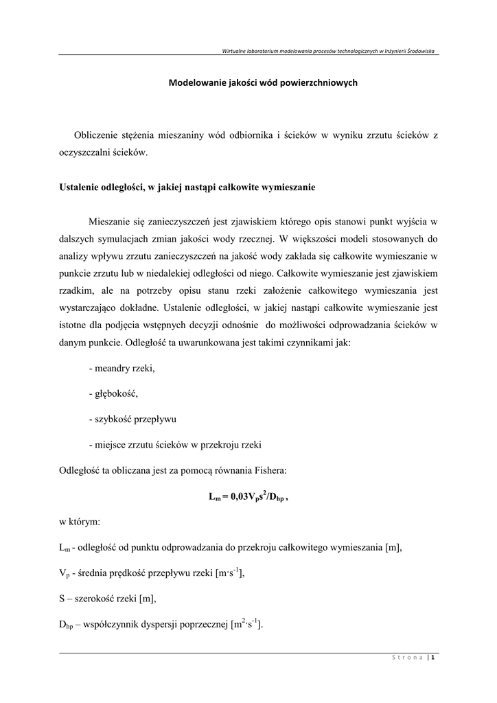 Wirtualne laboratorium modelowania procesów technologicznych w Inżynierii Środowiska Modelowanie jakości wód powierzchniowych Obliczenie stężenia mieszaniny wód odbiornika i ścieków w wyniku zrzutu ścieków z oczyszczalni ścieków. Ustalenie odległości, w jakiej nastąpi całkowite wymieszanie Mieszanie się zanieczyszczeń jest zjawiskiem którego opis stanowi punkt wyjścia w dalszych symulacjach zmian jakości wody rzecznej. W większości modeli stosowanych do analizy wpływu zrzutu zanieczyszczeń na jakość wody zakłada się całkowite wymieszanie w punkcie zrzutu lub w niedalekiej odległości od niego. Całkowite wymieszanie jest zjawiskiem rzadkim, ale na potrzeby opisu stanu rzeki założenie całkowitego wymieszania jest wystarczająco dokładne. Ustalenie odległości, w jakiej nastąpi całkowite wymieszanie jest istotne dla podjęcia wstępnych decyzji odnośnie do możliwości odprowadzania ścieków w danym punkcie. Odległość ta uwarunkowana jest takimi czynnikami jak: - meandry rzeki, - głębokość, - szybkość przepływu - miejsce zrzutu ścieków w przekroju rzeki Odległość ta obliczana jest za pomocą równania Fishera: Lm = 0,03Vps2/Dhp , w którym: Lm - odległość od punktu odprowadzania do przekroju całkowitego wymieszania [m], Vp - średnia prędkość przepływu rzeki [m·s-1], S – szerokość rzeki [m], Dhp – współczynnik dyspersji poprzecznej [m2·s-1]. S t r o n a |1 Wirtualne laboratorium modelowania procesów technologicznych w Inżynierii Środowiska Wyznaczenie współczynnika dyspersji poprzecznej Dhp jest trudne, ale dla rzek wolno płynących można jego wartość oszacować z równania: Dhp = 0,2HVp , w którym: H – średnia głębokość rzeki [m]. Przy całkowitym wymieszaniu w punkcie dopływu stężenie zanieczyszczeń w mieszaninie C0 opisane jest równaniem: C0 = Q r Cr + q s Cs , Qr + q s w którym: Qr i qs - przepływ rzeki i ścieków [m3·s-1] Cr i Cs - stężenie danego składnika w wodzie rzeki powyżej dopływu ścieków i w ściekach [g·m-3] Średnioroczny przepływ SQ-Qr jest jednakowy dla wszystkich okresów badawczych. Przy określaniu średnich przepływów na badanych rzekach w odpowiednich punktach pomiarowych można wykorzystać wzór Iszkowskiego, który ma postać: SQ – Qr = 0,0317·cs·P·A [m3·s-1] , gdzie: cs – współczynnik odpływu [-], P – wysokość warstwy normalnego opadu rocznego (ok. 600 mm – 0,6 m [m]), A – powierzchnia zlewni [km2]. Dla zlewni nizinnych wartość cs można przyjąć 0,30 według Iszkowskiego. S t r o n a |2 Wirtualne laboratorium modelowania procesów technologicznych w Inżynierii Środowiska Grupa topograficzna zlewni Współczynnik odpływu cs Bagna i niziny 0,20 Niziny i płaskie wysoczyzny 0,25 Częściowo niziny, częściowo pagórki 0,30 Niezbyt strome pagórki 0,35 Częściowo przedgórza, częściowo pagórki lub tylko strome pagórki 0,40 Wzniesienia terenu, Westerwald, odgałęzienia jak Ardeny, Eifel, Vogelsberg, Odenwald oraz większych pasm górskich, 0,45 zależnie od stromości – średnio Wzniesienia terenu, jak: Harz, Las Turyński, Rhön, Las Frankoński, Góry Smreczane (Fichtelgebrige), Rudawy (Erzgebrige), 0,50 Czeski Las, Góry Łużyckie, Erlitzgebrige, Las Wiedeński i inne – średnio Wzniesienia terenu, jak: Czarny Las, Wogezy, 0,55 Karkonosze, Sudety, Beskidy i inne – średnio Wysokie góry według stromości 0,6 - 0,7 S t r o n a |3