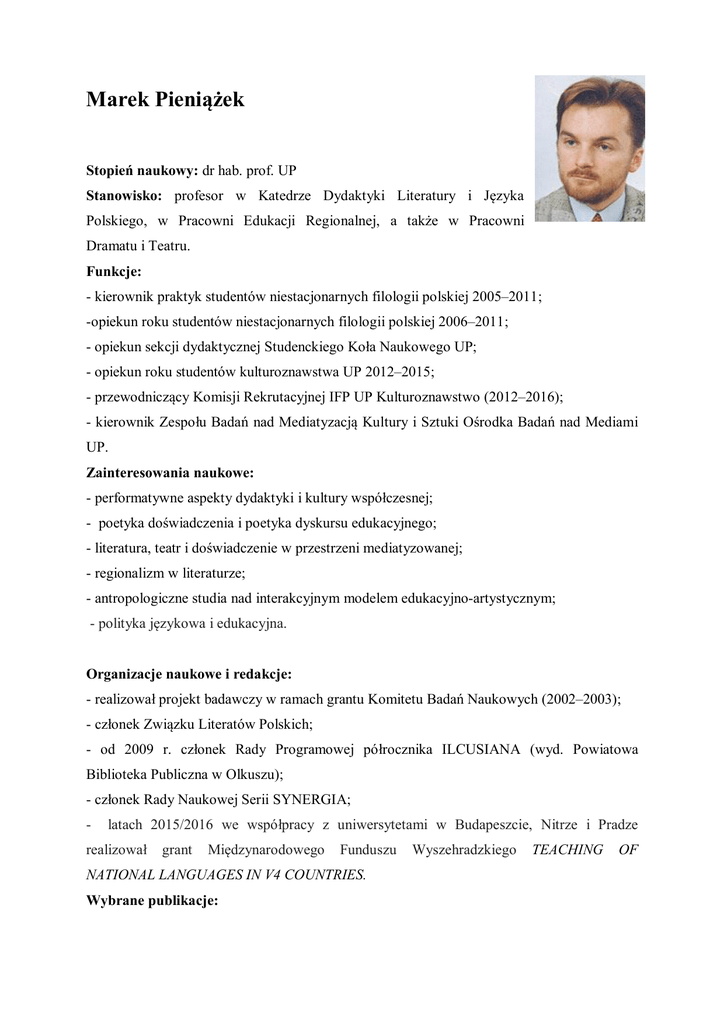 Marek Pieniążek Stopień naukowy: dr hab. prof. UP Stanowisko: profesor w Katedrze Dydaktyki Literatury i Języka Polskiego, w Pracowni Edukacji Regionalnej, a także w Pracowni Dramatu i Teatru. Funkcje: - kierownik praktyk studentów niestacjonarnych filologii polskiej 2005–2011; -opiekun roku studentów niestacjonarnych filologii polskiej 2006–2011; - opiekun sekcji dydaktycznej Studenckiego Koła Naukowego UP; - opiekun roku studentów kulturoznawstwa UP 2012–2015; - przewodniczący Komisji Rekrutacyjnej IFP UP Kulturoznawstwo (2012–2016); - kierownik Zespołu Badań nad Mediatyzacją Kultury i Sztuki Ośrodka Badań nad Mediami UP. Zainteresowania naukowe: - performatywne aspekty dydaktyki i kultury współczesnej; - poetyka doświadczenia i poetyka dyskursu edukacyjnego; - literatura, teatr i doświadczenie w przestrzeni mediatyzowanej; - regionalizm w literaturze; - antropologiczne studia nad interakcyjnym modelem edukacyjno-artystycznym; - polityka językowa i edukacyjna. Organizacje naukowe i redakcje: - realizował projekt badawczy w ramach grantu Komitetu Badań Naukowych (2002–2003); - członek Związku Literatów Polskich; - od 2009 r. członek Rady Programowej półrocznika ILCUSIANA (wyd. Powiatowa Biblioteka Publiczna w Olkuszu); - członek Rady Naukowej Serii SYNERGIA; - latach 2015/2016 we współpracy z uniwersytetami w Budapeszcie, Nitrze i Pradze realizował grant Międzynarodowego Funduszu NATIONAL LANGUAGES IN V4 COUNTRIES. Wybrane publikacje: Wyszehradzkiego TEACHING OF Monografie: 1. Akt twórczy jako mimesis. „Dziś są moje urodziny” – ostatni spektakl Tadeusza Kantora, Universitas, Kraków 2005. 2. Szkolny teatr przemiany. Dramatyzacja działań twórczych w procesie wychowawczym, Wydawnictwo Naukowe UP, Kraków 2009. 3. Uczeń jako aktor kulturowy. Polonistyka szkolna w warunkach płynnej nowoczesności, Wydawnictwo Naukowe UP, Kraków 2013. Publikacje pod redakcją: 1. Jan Waśniewski, Ognie w pirytach, [wznowienie powieści z 1935 roku], wstęp i oprac.: M. Pieniążek, J. Liszka, wydawca: GOK Bolesław, Bolesław-Katowice 2008. 2. Jan Waśniewski, Po dniówce, [wznowienie opowiadań z 1938 roku], wstęp i oprac.: M. Pieniążek, wydawca: GOK Bolesław, Bolesław 2009. 3. Rzeka płynie przez mój dom. XXX-lecie Klubu Literackiego MOK w Olkuszu. 1982– 2012, wyb., red. i wstęp: M. Pieniążek, Olkusz 2012. 4. Anna Piątek, Mój prywatny konfesjonał, red. i przedm.: M. Pieniążek, Olkusz 2012. 5. Ewa Pogan, Mogę się śmiać, red. M. Pieniążek, M. Drapacz, przedm.: M. Pieniążek, Olkusz 2014. 6. Uwierz (katalog wystawy poświęconej walce z rakiem), red. M. Pieniążek i Stowarzyszenie Zielone Światło, wstęp: M. Pieniążek, Olkusz 2014. 7. Jacek Majcherkiewicz, Dotyk anioła, red. i wstęp: Marek Pieniążek, Olkusz 2015. 8. Irena Włodarczyk, Rozmowy numerowane, red. i wstęp: Marek Pieniążek, Olkusz 2015. 9. Kazimiera Janczy, Nim zatrzyma mnie czas, red. i wstęp: Marek Pieniążek, Klucze 2016. 10. TEACHING OF NATIONAL LANGUAGES IN THE V4 COUNTRIES, red. Marek Pieniążek i Stanislav Štěpáník, Praga 2016. Artykuły naukowe w tomach zbiorowych: 1. Tadeusz Kantor – idealny widz własnego spektaklu, [w:] Uwzględniając widza. Od Pirandella do Bergmana, pod red W. Balucha i M. Sugiery, wyd. Księgarnia Akademicka, Kraków 2001. 2. Granice dyskursu strukturalno-semiotycznego na przykładzie partytury Wielopole, Wielopole Tadeusza Kantora. [w:] Interpretacje dramatu. Dyskurs, postać, gender, pod red. M. Sugiery, wyd. Księgarnia Akademicka 2002. 3. Poetyckie zakorzenianie tożsamości, czyli o związkach olkuskich literatów z regionalizmem, [w:] Region i edukacja. Literatura – kultura - społeczeństwo, pod red. Z. Budrewicz i M. Kani, Wydawnictwo Naukowe DWN, Kraków 2006. 4. Podręcznik jako narzędzie do „czytania” ucznia, [w:] Podręczniki do kształcenia polonistycznego w zreformowanej szkole – koncepcje, funkcje, język, pod red. H. Synowiec, Wydawnictwo Edukacyjne, Kraków 2007. 5. Recepcja ostatniego spektaklu Tadeusza Kantora „Dziś są moje urodziny” w Niemczech i Szwajcarii, [w:] Sztuka jest przestępstwem. Tadeusz Kantor a Niemcy i Szwajcaria, pod red. U. Schorlemmer, Cricoteka, Verlag für moderne Kunst Nürnberg, Kraków–Nürnberg 2007 (wersja polska i niemiecka). 6. Baśniowy Cygan jako współczesny „homo sacer” Cygańsko-polska antropologia ponowoczesnego marzenia, [w:] Romowie w Polsce i Europie. Historia, prawo, kultura, pod red. P. Borka, Wydawnictwo Naukowe AP, Kraków 2007. 7. Poetyka kulturowa dla szkoły. Dydaktyka polonistyczna wobec wyzwań antropologii literatury, [w:] Annales Academiae Paedagogicae Cracoviensis, Studia Historicolitteraria VIII, pod red. B. Farona, WN AP Kraków, Kraków 2008. 8. Powieść „stąd” jako czytelnicze studium antropologiczno-cywilizacyjne. Podolkuskie ścieżki tekstów Jana Waśniewskiego, [w:] Zapisane w krajobrazie. Literackokulturowe obrazy regionów dawniej i dziś, pod red. Z. Budrewicz i M. Kani, Wydawnictwo PANDIT, Kraków–Bukowno 2008. 9. Odys – Wyspiański – Grotowski – Kantor – uczeń” Historia i ciało w perspektywie antropologicznej dydaktyki dramatu, [w:] Dramat w historii, historia w dramacie, pod red. J. Waligóry, K. Latawiec i in., WN UP, Kraków 2009. 10. Szkolna polonistyka odcięta od diagnoz współczesności: groźne konsekwencje modernistycznego wyprofilowania licealnej podstawy programowej, [w:] Nowa podstawa programowa: proces dydaktyczny – egzamin, red. E. Jaskółowa, M. WójcikDudek, Katowice 2009, s. 140–150. 11. Szkolny dialog modernizmu z postmodernizmem: z dramatu milczącej wrogości ku metodyce dramatycznego poznania, [w:] Dialog kultur w edukacji, pod red. B. Myrdzik, M. Karwatowskiej, Wyd. UMCS, Lublin 2009. 12. Uczeń jako aktor kulturowy. Wstęp do antropologicznej metodyki literatury i języka polskiego, [w:] Kształcenie literacko-kulturowe w dobie kultury polisensorycznej, pod red. D. Ka