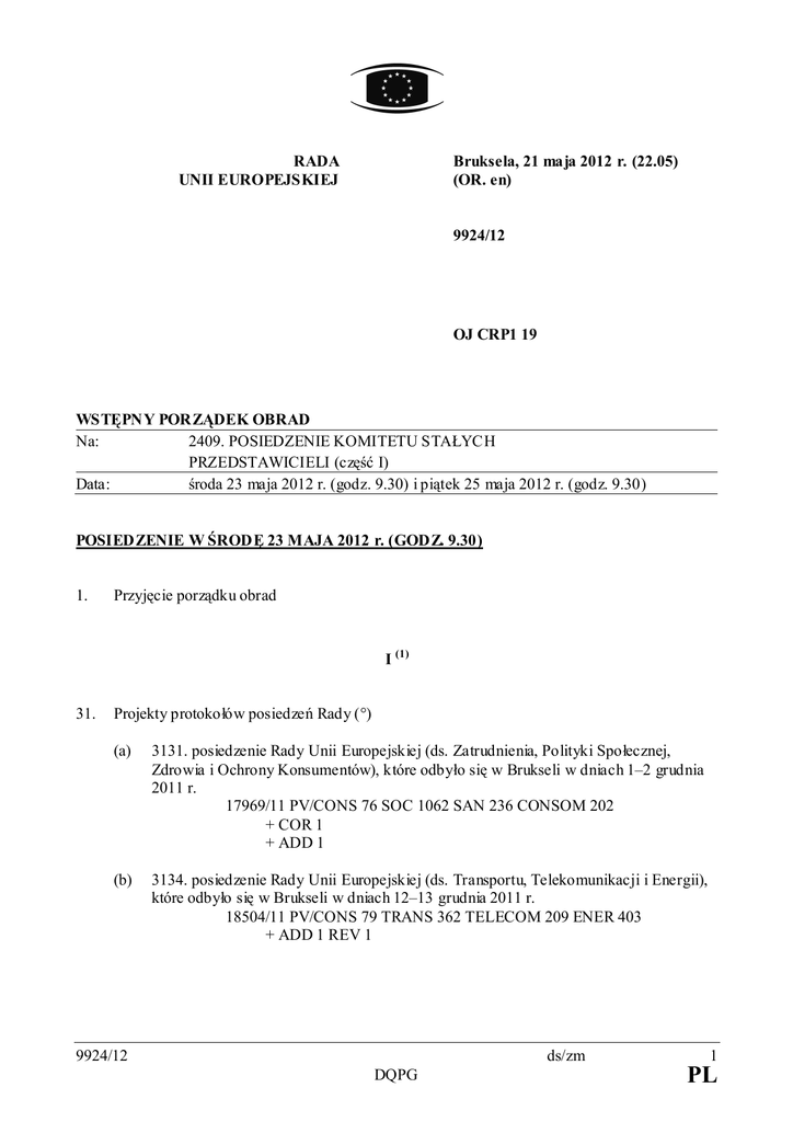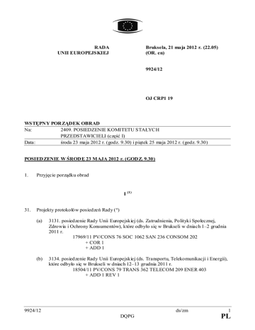 RADA UNII EUROPEJSKIEJ Bruksela, 21 maja 2012 r. (22.05) (OR. en) 9924/12 OJ CRP1 19 WSTĘPNY PORZĄDEK OBRAD Na: 2409. POSIEDZENIE KOMITETU STAŁYCH PRZEDSTAWICIELI (część I) Data: środa 23 maja 2012 r. (godz. 9.30) i piątek 25 maja 2012 r. (godz. 9.30) POSIEDZENIE W ŚRODĘ 23 MAJA 2012 r. (GODZ. 9.30) 1. Przyjęcie porządku obrad I (1) 31. Projekty protokołów posiedzeń Rady (°) (a) 3131. posiedzenie Rady Unii Europejskiej (ds. Zatrudnienia, Polityki Społecznej, Zdrowia i Ochrony Konsumentów), które odbyło się w Brukseli w dniach 1–2 grudnia 2011 r. 17969/11 PV/CONS 76 SOC 1062 SAN 236 CONSOM 202 + COR 1 + ADD 1 (b) 3134. posiedzenie Rady Unii Europejskiej (ds. Transportu, Telekomunikacji i Energii), które odbyło się w Brukseli w dniach 12–13 grudnia 2011 r. 18504/11 PV/CONS 79 TRANS 362 TELECOM 209 ENER 403 + ADD 1 REV 1 9924/12 DQPG ds/zm 1 PL (c) 3137. posiedzenie Rady Unii Europejskiej (ds. Rolnictwa i Rybołówstwa), które odbyło się w Brukseli w dniach 15–16 grudnia 2011 r. 18732/11 PV/CONS 82 AGRI 890 PECHE 408 + ADD 1 (d) 3139. posiedzenie Rady Unii Europejskiej (ds. Środowiska), które odbyło się w Brukseli w dniu 19 grudnia 2011 r. 18850/11 PV/CONS 84 ENV 995 + COR 1(de) + COR 2 REV 1 + ADD 1 32. Sprawa wniesiona do Trybunału Sprawiedliwości Unii Europejskiej Sprawa C-165/12: Komisja przeciwko Radzie Unii Europejskiej – Nota informacyjna dla Komitetu Stałych Przedstawicieli (część I) 9912/12 JUR 277 PECHE 164 AGRI 307 AGRIORG 81 RELEX 436 33. Komitet Doradczy ds. Bezpieczeństwa i Ochrony Zdrowia w Miejscu Pracy Mianowanie Wikinga HUSBERGA, zastępcy członka z Finlandii, na miejsce Erkkiego YRJÄNHEIKKIEGO, który złożył rezygnację – Przyjęcie 9652/12 SOC 339 34. Rada Zarządzająca Europejskiej Agencji ds. Bezpieczeństwa i Ochrony Zdrowia w Miejscu Pracy Mianowanie Stamatiny PISSIMISSI, zastępcy członka z Grecji, na miejsce Antoniosa CHRISTODOULOU, który złożył rezygnację – Przyjęcie 9684/12 SOC 340 35. Komitet Doradczy ds. Swobodnego Przepływu Pracowników Mianowanie Tatjany ČERIN, zastępcy członka ze Słowenii, na miejsce Igora ANTAUERA, który złożył rezygnację – Przyjęcie 9709/12 SOC 344 9924/12 DQPG ds/zm 2 PL 36. Komitet Doradczy ds. Swobodnego Przepływu Pracowników Mianowanie Igora ANTAUERA, członka ze Słowenii, na miejsce Tatjany ČERIN, która złożyła rezygnację – Przyjęcie 9710/12 SOC 345 37. Rada Zarządzająca Europejskiej Agencji ds. Bezpieczeństwa i Ochrony Zdrowia w Miejscu Pracy Mianowanie Alexandra BURZA, zastępcy członka z Austrii, na miejsce Alexandry SCHÖNGRUNDNER, która złożyła rezygnację – Przyjęcie 9769/12 SOC 349 + COR 1 38. Komitet Doradczy ds. Swobodnego Przepływu Pracowników Mianowanie Līgi EMULE-KONONE, członka z Łotwy, na miejsce Ilze ZVĪDRIŅY, która złożyła rezygnację – Przyjęcie 9858/12 SOC 358 39. Komitet Doradczy ds. Swobodnego Przepływu Pracowników Mianowanie Ilze ZVĪDRIŅY, zastępcy członka z Łotwy, na miejsce Imantsa LIPSIKSA, który złożył rezygnację – Przyjęcie 9859/12 SOC 359 40. Komitet Doradczy ds. Swobodnego Przepływu Pracowników Mianowanie Mārisa SIMULISA, członka z Łotwy, na miejsce Zandy GRUNDBERGI, która złożyła rezygnację – Przyjęcie 9860/12 SOC 360 41. Projekt rozporządzenia Komisji (UE) nr …/… z dnia XXX r. ustanawiającego przepisy wykonawcze dotyczące certyfikacji statków powietrznych i związanych z nimi wyrobów, części i akcesoriów w zakresie zdatności do lotu i ochrony środowiska oraz dotyczące certyfikacji organizacji projektujących i produkujących (wersja przekształcona) – Decyzja o braku sprzeciwu wobec przyjęcia 8632/12 AVIATION 63 9690/12 AVIATION 83 9924/12 DQPG ds/zm 3 PL 42. Projekt rozporządzenia Komisji (UE) nr …/… z dnia XXX r. zmieniającego rozporządzenie (WE) nr 1881/2006 w odniesieniu do najwyższych dopuszczalnych zanieczyszczeń ochratoksyną A, polichlorowanymi bifenylami o działaniu niepodobnym do dioksyn i melaminą w środkach spożywczych – Decyzja o braku sprzeciwu wobec przyjęcia 9954/12 DENLEG 46 AGRI 311 8478/12 DENLEG 35 AGRI 207 43. Projekt decyzji Rady w sprawie wniosku Unii Europejskiej dotyczącego zmiany do załącznika III do Konwencji o międzynarodowym handlu dzikimi zwierzętami i roślinami gatunków zagrożonych wyginięciem (CITES) – Przyjęcie 9494/12 ENV 327 PECHE 147 WTO 161 OC 212 10031/12 ENV 368 PECHE 168 WTO 190 OC 230 44. Wniosek dotyczący rozporządzenia Parlamentu Europejskiego i Rady w sprawie egzekwowania przepisów celnych w zakresie praw własności intelektualnej (pierws ze czytanie) (obrady ustawodawcze) – Informacje o mandacie do rozmów trójstronnych 7427/3/12 UD 64 PI 31 COMER 51 CODEC 1361 REV 3 45. Wniosek dotyczący rozporządzenia Parlamentu Europejskiego i Rady w sprawie roamingu w publicznych sieciach łączności ruchomej wewnątrz Unii (przekształcenie) (tekst mający znaczenie dla EOG) (pierws ze czytanie) (obrady ustawodawcze + oświadczenie) – Przyjęcie aktu ustawodawczego PE-CONS 20/12 TELECOM 65 COMPET 181 MI 210 CONSOM 38 CODEC 848 OC 166 9661/12 CODEC 1229 TELECOM 83 COMPET 251 MI 310 CONSOM 65 OC 221 + ADD 1 46. Wniosek dotyczący rozporządzenia Parlamentu Europejskiego i Rady dotyczącego wywozu i przywozu niebezpiecznych chemikaliów (przekształcenie) (pierws ze czytanie) (obrady ustawodawcze + oświadczenie) – Przyjęcie aktu ustawodawczego PE-CONS 12/12 ENV 183 WTO 83 MI 161 CODEC 577 OC 117 9659/12 CODEC 1228 ENV 338 WTO 169 MI 309 OC 220 + ADD 1 9924/12 DQPG ds/zm 4 PL II 47. Międzyrządowa Organizacja Międzynarodowych Prze wozów Kole jami (OTIF) – przygotowania do wyborów sekretarza generalnego – Skoordynowanie stanowiska UE / państw członkowskich, które zostanie przedstawione na najbliższym posiedzeniu komitetu administracyjnego (Berno, 23–24 maja 2012 r.) 10021/12 TRANS 163 RESTREINT UE (x) 48. Ustalenie wstępnego porządku obrad na posiedzenie Rady (ds
