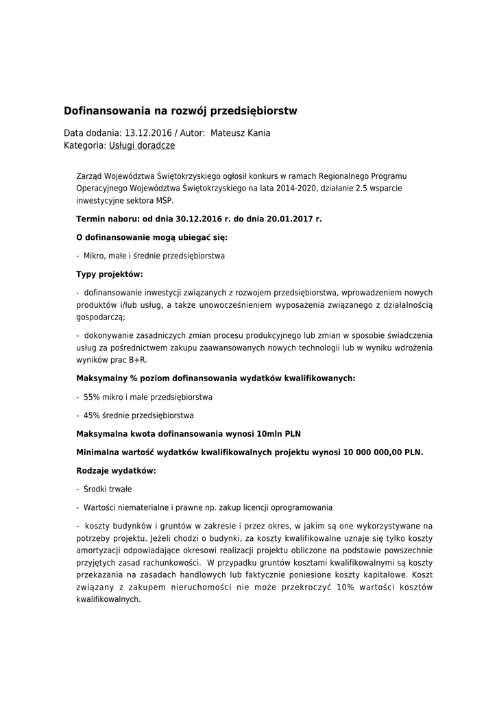Dofinansowania na rozwój przedsiębiorstw Data dodania: 13.12.2016 / Autor: Mateusz Kania Kategoria: Usługi doradcze Zarząd Województwa Świętokrzyskiego ogłosił konkurs w ramach Regionalnego Programu Operacyjnego Województwa Świętokrzyskiego na lata 2014-2020, działanie 2.5 wsparcie inwestycyjne sektora MŚP. Termin naboru: od dnia 30.12.2016 r. do dnia 20.01.2017 r. O dofinansowanie mogą ubiegać się: - Mikro, małe i średnie przedsiębiorstwa Typy projektów: - dofinansowanie inwestycji związanych z rozwojem przedsiębiorstwa, wprowadzeniem nowych produktów i/lub usług, a także unowocześnieniem wyposażenia związanego z działalnością gospodarczą; - dokonywanie zasadniczych zmian procesu produkcyjnego lub zmian w sposobie świadczenia usług za pośrednictwem zakupu zaawansowanych nowych technologii lub w wyniku wdrożenia wyników prac B+R. Maksymalny % poziom dofinansowania wydatków kwalifikowanych: - 55% mikro i małe przedsiębiorstwa - 45% średnie przedsiębiorstwa Maksymalna kwota dofinansowania wynosi 10mln PLN Minimalna wartość wydatków kwalifikowalnych projektu wynosi 10 000 000,00 PLN. Rodzaje wydatków: - Środki trwałe - Wartości niematerialne i prawne np. zakup licencji oprogramowania - koszty budynków i gruntów w zakresie i przez okres, w jakim są one wykorzystywane na potrzeby projektu. Jeżeli chodzi o budynki, za koszty kwalifikowalne uznaje się tylko koszty amortyzacji odpowiadające okresowi realizacji projektu obliczone na podstawie powszechnie przyjętych zasad rachunkowości. W przypadku gruntów kosztami kwalifikowalnymi są koszty przekazania na zasadach handlowych lub faktycznie poniesione koszty kapitałowe. Koszt związany z zakupem nieruchomości nie może przekroczyć 10% wartości kosztów kwalifikowalnych. - leasing finansowy Wspierane będą wyłącznie projekty dotyczące prowadzenia działalności gospodarczej związanej z przetwórstwem przemysłowym(PKD 2007 Sekcja C – działy od 10 do 32 włącznie) Więcej informacji na stronie internetowej: http://www.rpo-swietokrzyskie.pl/ Szczegółowych informacji udzielają doradcy Krajowego Stowarzyszenia Wsparcia Przedsiębiorczości, którzy pomogą Ci przygotować i opracować dokumentację do złożenia wniosku. Zapraszamy!!! Telefon: 41 375 14 55 41 26046 63 e-mail: [email protected] 41 260 46 62