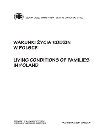 Opracowanie publikacji GUS, Departament Bada Spoecznych i Warunków ycia Preparation of the publication CSO, Social Surveys and Living Conditions Department kierujcy supervisor dr Piotr yso Dyrektor Departamentu Bada Spoecznych i Warunków ycia Director of the Social Surveys and Living Conditions Department zespó team Magdalena Fijakowska, Bogusawa Gawza, Agata Kaczmarek-Firth, Marek Kowalewski, Renata okietek, Joanna Wawrzyniak tumaczenie translation Agata Kaczmarek-Firth naliczanie tablic tables compiled by Centrum Informatyki Statystycznej Central Statistical Computing Centre Wydzia Badania Warunków ycia Ludnoci Departamentu Bada Spoecznych i Warunków ycia Living Conditions Surveys Section Social Surveys and Living Conditions Department wspópraca co-operation Renata Brzeziska, Rafa Kupis, Joanna Drop Orodek Warunków ycia i Bada Ankietowych w odzi Centre for Living Conditions and Surveys in ód Maciej Bana – Departament Studiów Makroekonomicznych i Finansów Macroeconomic Studies and Finance Department Projekt okładki Cover design Druk i oprawa Lidia Motrenko-Makuch Zakad Wydawnictw Statystycznych Statistical Publishing Establishment ISBN 978-83-7027-547-1 Publikacja dostpna na CD oraz w Internecie – www.stat.gov.pl Publication available on CD and on Internet – www.stat.gov.pl ZAK£AD WYDAWNICTW STATYSTYCZNYCH, 00-925 WARSZAWA, AL. NIEPODLEG£0ŒCI 208 Informacje w sprawach sprzeda¿y publikacji – tel.: (0 22) 608 32 10, 608 38 10 PRZEDMOWA Mamy przyjemność przekazać Państwu publikację “Warunki życia rodzin w Polsce”, która jest oparta na wtórnym wykorzystaniu wyników badań ankietowych przeprowadzonych w gospodarstwach domowych. Dane z badania „Budżety gospodarstw domowych” zostały wykorzystane do przedstawienia struktury populacji oraz dochodów i wydatków. Z „Europejskiego badania dochodów i warunków życia” (EU-SILC) wykorzystano dane dotyczące warunków mieszkaniowych, zagrożenia ubóstwem i deprywacją materialną. „Badanie spójności społecznej” było źródłem informacji o dzieciach a zwłaszcza zaspokajaniu ich potrzeb oraz o pomocy dla rodziny. Z „Badania budżetu czasu” zostały pozyskane dane dotyczące dobowego budżetu czasu, zwłaszcza te odnoszące się do czasu poświęcanego na pracę i obowiązki rodzinne (w tym opiekę nad dziećmi). Dane z Narodowego Spisu Powszechnego Ludności i Mieszkań (NSP2011) zostały wykorzystane jedynie w ograniczonym zakresie do przedstawienia struktury rodzin, ze względu m.in. na odmienną metodologię w stosunku do wykorzystywanej w badaniach ankietowych oraz przygotowywaną odrębną publikację dot. rodzin na podstawie wyników NSP2011. Ze względu na metodologię badań ankietowych w publikacji zawarto opis gospodarstw rodzinnych wyodrębnionych z gospodarstw domowych. Ich struktura w największym możliwym zakresie odzwierciedla strukturę rodzin. Małżeństwo i rodzina są podstawą życia społecznego i dlatego tak ważna jest troska o ich dobrą kondycję w różnych istotnych wymiarach. Artykuł 18 Konstytucji RP stanowi, że „małżeństwo jako związek kobiety i mężczyzny, rodzina, macierzyństwo i rodzicielstwo znajdują się pod ochroną i opieką Rzeczypospolitej Polskiej”. Rolą GUS jest dostarczenie możliwie pełnej informacji na ten temat. Mam nadzieję, że niniejsza publikacja wypełni znaczną część luk informacyjnych występujących do tej pory w odniesieniu do warunków życia rodzin w Polsce. dr Piotr Łysoń Dyrektor Departamentu Badań Społecznych i Warunków Życia Warszawa, grudzień 2013 r. PREFACE We are pleased to present you with the publication “Living Conditions of Families in Poland”. This publication is based on secondary analysis of the CSO surveys results. All the surveys were conducted in households. Data from the Household Budget Survey was used to present the structure of the population as well as income and expenditure. From the European Union Statistics on Income and Living Conditions (EU-SILC) data on accommodation, risk of poverty and material deprivation was used. The Social Cohesion Survey was the source of data on children, especially on fulfilling children needs as well as on assistance for family households. From the Time Use Survey, information on daily time budget was obtained, especially with regard to time spent on paid work and housework (including childcare). Data from the National Population and Housing Census 2011 was used in order to present family structure. It was used to a limited extent due to e.g. significantly different methodology when compared to surveys methodology, moreover a separate publication on families based on the census results is being prepared. Due to the surveys methodology this publication includes a description of family households derived from households, in order to reflect family structure to the greatest possible extent. Marriage and family are the foundation of social life and therefore it is crucial to care about their wellbeing in various relevant dimensions. Article 18 of the Polish Constitution states that “marriage, being a union of a man and a woman, as well as the family, motherhood and parenthood, shall be placed under the protection and care of the Republic of Poland”. The role of the CSO is to provide the fullest possible information on this subject. We do hope that this publication will fill a significant number of research gaps regarding the living conditions of families in Poland. Piotr yso, Ph.D. Director of the Social Surveys and Living Conditions Department Warsaw, December 2013 5 SPIS TRECI Strona 1. Uwagi metodyczne .............................................................................................. 11 1.1. róda danych ............................................................................................ 11 1.2. Zakres danych ........................................................................................... 13 1.3. Objanienia podstawow