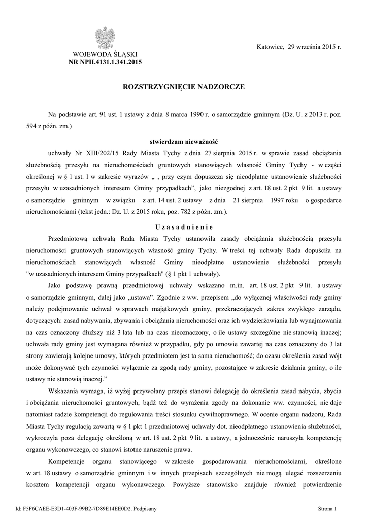 Katowice, 29 września 2015 r. WOJEWODA ŚLĄSKI NR NPII.4131.1.341.2015 ROZSTRZYGNIĘCIE NADZORCZE Na podstawie art. 91 ust. 1 ustawy z dnia 8 marca 1990 r. o samorządzie gminnym (Dz. U. z 2013 r. poz. 594 z późn. zm.) stwierdzam nieważność uchwały Nr XIII/202/15 Rady Miasta Tychy z dnia 27 sierpnia 2015 r. w sprawie zasad obciążania służebnością przesyłu na nieruchomościach gruntowych stanowiących własność Gminy Tychy - w części określonej w § 1 ust. 1 w zakresie wyrazów „ , przy czym dopuszcza się nieodpłatne ustanowienie służebności przesyłu w uzasadnionych interesem Gminy przypadkach”, jako niezgodnej z art. 18 ust. 2 pkt 9 lit. a ustawy o samorządzie gminnym w związku z art. 14 ust. 2 ustawy z dnia 21 sierpnia 1997 roku o gospodarce nieruchomościami (tekst jedn.: Dz. U. z 2015 roku, poz. 782 z późn. zm.). Uzasadnienie Przedmiotową uchwałą Rada Miasta Tychy ustanowiła zasady obciążania służebnością przesyłu nieruchomości gruntowych stanowiących własność gminy Tychy. W treści tej uchwały Rada dopuściła na nieruchomościach stanowiących własność Gminy nieodpłatne ustanowienie służebności przesyłu "w uzasadnionych interesem Gminy przypadkach" (§ 1 pkt 1 uchwały). Jako podstawę prawną przedmiotowej uchwały wskazano m.in. art. 18 ust. 2 pkt 9 lit. a ustawy o samorządzie gminnym, dalej jako „ustawa”. Zgodnie z ww. przepisem „do wyłącznej właściwości rady gminy należy podejmowanie uchwał w sprawach majątkowych gminy, przekraczających zakres zwykłego zarządu, dotyczących: zasad nabywania, zbywania i obciążania nieruchomości oraz ich wydzierżawiania lub wynajmowania na czas oznaczony dłuższy niż 3 lata lub na czas nieoznaczony, o ile ustawy szczególne nie stanowią inaczej; uchwała rady gminy jest wymagana również w przypadku, gdy po umowie zawartej na czas oznaczony do 3 lat strony zawierają kolejne umowy, których przedmiotem jest ta sama nieruchomość; do czasu określenia zasad wójt może dokonywać tych czynności wyłącznie za zgodą rady gminy, pozostające w zakresie działania gminy, o ile ustawy nie stanowią inaczej.” Wskazania wymaga, iż wyżej przywołany przepis stanowi delegację do określenia zasad nabycia, zbycia i obciążania nieruchomości gruntowych, bądź też do wyrażenia zgody na dokonanie ww. czynności, nie daje natomiast radzie kompetencji do regulowania treści stosunku cywilnoprawnego. W ocenie organu nadzoru, Rada Miasta Tychy regulacją zawartą w § 1 pkt 1 przedmiotowej uchwały dot. nieodpłatnego ustanowienia służebności, wykroczyła poza delegację określoną w art. 18 ust. 2 pkt 9 lit. a ustawy, a jednocześnie naruszyła kompetencję organu wykonawczego, co stanowi istotne naruszenie prawa. Kompetencje organu stanowiącego w zakresie gospodarowania nieruchomościami, określone w art. 18 ustawy o samorządzie gminnym i w innych przepisach szczególnych nie mogą ulegać rozszerzeniu kosztem kompetencji organu wykonawczego. Id: F5F6CAEE-E3D1-403F-99B2-7D89E14EE0D2. Podpisany Powyższe stanowisko znajduje również potwierdzenie Strona 1 w orzecznictwie sądowo-administracyjnym m.in. w wyroku z dnia 7 października 2004 roku (sygn. akt II SA 3144/03, Centralna Baza Orzeczeń Sadów Administracyjnych) Wojewódzki Sąd Administracyjny w Warszawie stwierdził, iż: „Art. 18 ust. 2 pkt 9 ustawy o samorządzie gminnym uprawniający radę gminy do podejmowania uchwał w sprawach majątkowych gminy przekraczających zakres zwykłego zarządu ustanawia wyjątki od generalnej zasady wyrażonej w art. 30 ust. 2 pkt 3 tejże ustawy stanowiącej, iż to wójt gminy gospodaruje mieniem komunalnym. Przekazanie pewnych spraw do kompetencji rady gminy jest wyjątkiem, który musi być interpretowany ściśle i nie może prowadzić do swobodnego przejmowania przez radę do rozstrzygania w drodze uchwał wszystkich spraw ważnych z punktu widzenia gospodarki gminy.” Jednocześnie podkreślenia wymaga, iż zgodnie z brzmieniem art. 7 Konstytucji RP organy władzy publicznej mogą działać jedynie na podstawie i w granicach przyznanych im uprawnień. Oznacza to, że podczas, gdy jednostka posiada swobodę działania zgodnie z zasadą, iż co nie jest wyraźnie zabronione przez prawo jest dozwolone, to organy władzy publicznej mogą działać tylko w tych przypadkach i w takim zakresie, w których upoważnia je do tego prawo (por. W. Skrzydło, Konstytucja RP. Komentarz. Zakamycze 1999 r., s. 15, por. wyrok NSA z dnia 15 stycznia 1997 r., sygn. akt II SA 534/96, M. Podat. 1997/12/374). Artykuł 7 Konstytucji RP zawiera normę zakazującą domniemywania kompetencji organu i tym samym nakazuje, by wszelkie działania organu władzy publicznej były oparte na wyraźnie określonej normie kompetencyjnej. Niezależnie od powyższego podkreślić należy, że normy regulujące zasady obrotu nieruchomościami należącymi do jednostek samorządu terytorialnego (także Skarbu Państwa) mają w większości charakter prawa publicznego i są bezwzględnie obowiązujące (patrz. uchwała Sądu Najwyższego z dnia 17 lipca 2013 r., sygn. akt III CZP 46/03, Lex nr 81521, publ. OSNC 2004/10/153, Prok. i Pr.- wkł. 2004/3/37, Biul. SN 2003/7/7, Wokanda 2003/11/8, Wspólnota 2003/16/53). Zgodnie z art. 14 ust. 2 ustawy o gospodarce nieruchomościami - nieruchomości Skarbu Państwa mogą być nieodpłatnie obciążane ograniczonymi prawami rzeczowymi na rzecz jednostek samorządu terytorialnego, a nieruchomości będące własnością jednostek samorządu terytorialnego – na rzecz Skarbu Państwa lub innych jednostek samorządu terytorialnego. Z powyższego w sposób jednoznaczny wynika, iż tylko pomiędzy wskazanymi w tym przepisie podmiotami dozwolone jest ustanawianie ograniczonych praw rzeczowych nieodpłatnie. Stosownie do art. 244 § 1 Kodeksu cywilnego ograniczonymi prawami rzeczowymi są: użytkowanie, służebność, zastaw, spółdzielcze własnościowe prawo