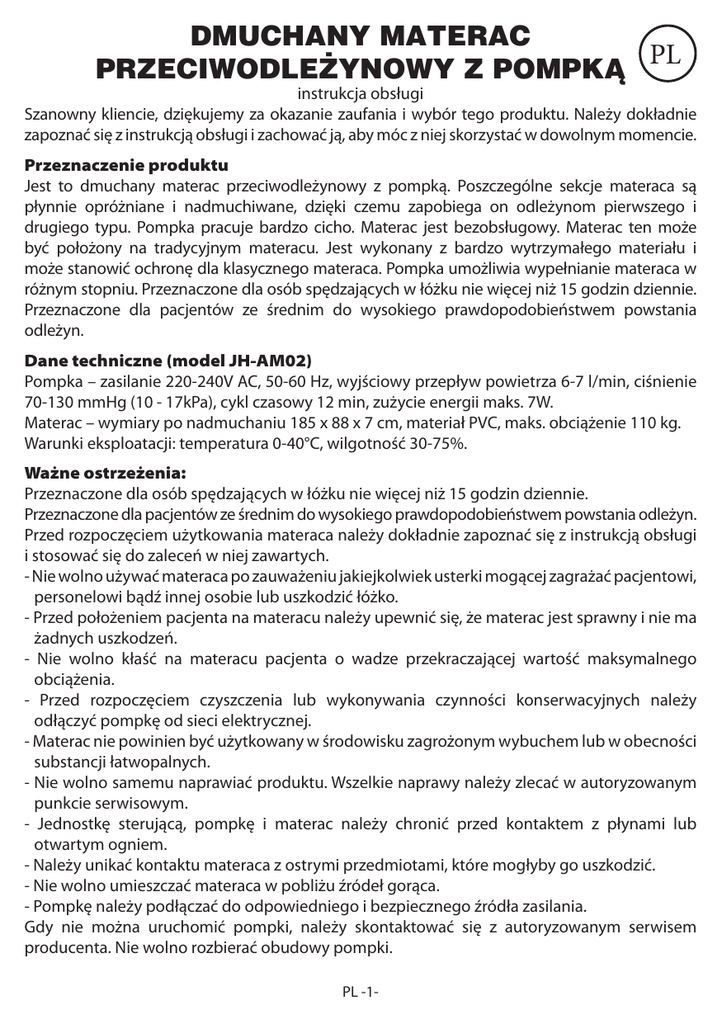 DMUCHANY MATERAC PL PRZECIWODLEŻYNOWY Z POMPKĄ instrukcja obsługi Szanowny kliencie, dziękujemy za okazanie zaufania i wybór tego produktu. Należy dokładnie zapoznać się z instrukcją obsługi i zachować ją, aby móc z niej skorzystać w dowolnym momencie. Przeznaczenie produktu Jest to dmuchany materac przeciwodleżynowy z pompką. Poszczególne sekcje materaca są płynnie opróżniane i nadmuchiwane, dzięki czemu zapobiega on odleżynom pierwszego i drugiego typu. Pompka pracuje bardzo cicho. Materac jest bezobsługowy. Materac ten może być położony na tradycyjnym materacu. Jest wykonany z bardzo wytrzymałego materiału i może stanowić ochronę dla klasycznego materaca. Pompka umożliwia wypełnianie materaca w różnym stopniu. Przeznaczone dla osób spędzających w łóżku nie więcej niż 15 godzin dziennie. Przeznaczone dla pacjentów ze średnim do wysokiego prawdopodobieństwem powstania odleżyn. Dane techniczne (model JH-AM02) Pompka – zasilanie 220-240V AC, 50-60 Hz, wyjściowy przepływ powietrza 6-7 l/min, ciśnienie 70-130 mmHg (10 - 17kPa), cykl czasowy 12 min, zużycie energii maks. 7W. Materac – wymiary po nadmuchaniu 185 x 88 x 7 cm, materiał PVC, maks. obciążenie 110 kg. Warunki eksploatacji: temperatura 0-40°C, wilgotność 30-75%. Ważne ostrzeżenia: Przeznaczone dla osób spędzających w łóżku nie więcej niż 15 godzin dziennie. Przeznaczone dla pacjentów ze średnim do wysokiego prawdopodobieństwem powstania odleżyn. Przed rozpoczęciem użytkowania materaca należy dokładnie zapoznać się z instrukcją obsługi i stosować się do zaleceń w niej zawartych. - Nie wolno używać materaca po zauważeniu jakiejkolwiek usterki mogącej zagrażać pacjentowi, personelowi bądź innej osobie lub uszkodzić łóżko. - Przed położeniem pacjenta na materacu należy upewnić się, że materac jest sprawny i nie ma żadnych uszkodzeń. - Nie wolno kłaść na materacu pacjenta o wadze przekraczającej wartość maksymalnego obciążenia. - Przed rozpoczęciem czyszczenia lub wykonywania czynności konserwacyjnych należy odłączyć pompkę od sieci elektrycznej. - Materac nie powinien być użytkowany w środowisku zagrożonym wybuchem lub w obecności substancji łatwopalnych. - Nie wolno samemu naprawiać produktu. Wszelkie naprawy należy zlecać w autoryzowanym punkcie serwisowym. - Jednostkę sterującą, pompkę i materac należy chronić przed kontaktem z płynami lub otwartym ogniem. - Należy unikać kontaktu materaca z ostrymi przedmiotami, które mogłyby go uszkodzić. - Nie wolno umieszczać materaca w pobliżu źródeł gorąca. - Pompkę należy podłączać do odpowiedniego i bezpiecznego źródła zasilania. Gdy nie można uruchomić pompki, należy skontaktować się z autoryzowanym serwisem producenta. Nie wolno rozbierać obudowy pompki. PL -1- MONTAŻ I EKSPLOATACJA 1. Rozpakuj produkt, sprawdź jego kompletność a także, czy nie doszło do jego uszkodzenia w trakcie transportu. 2. Rozłóż produkt na znajdującym się w łóżku materacu tak, żeby rurki doprowadzające powietrze znajdowały się od strony nóg pacjenta. 3. Rozłóż elementy służące do zawieszania pompki (znajdują się z tyłu) i umieść ją na ramie łóżka od strony nóg pacjenta. Zwróć uwagę na to, żeby rurka doprowadzająca powietrze nie była załamana lub przyciśnięta materacem. 4. Podłącz wtyczkę przewodu zasilającego do gniazdka z uziemieniem. Wyłącznik na panelu czołowym przełącz w pozycję „ON”. Pompka rozpocznie wypełnianie materaca powietrzem. 5. Ustaw regulator ciśnienia w pozycji „Max”, aby przyspieszyć wypełnianie pustego materaca. Nie wolno kłaść się na materacu, gdy nie jest on całkowicie nadmuchany (ok. 10 min). 6. Po napompowaniu materaca, ostrożnie rozłóż na nim pościel, łóżko będzie wtedy przygotowane do położenia w nim pacjenta. Ustaw regulator ciśnienia na wybraną wartość biorąc pod uwagę potrzeby pacjenta, ewentualnie skonsultuj to z lekarzem prowadzącym. 7. Gdy nie da się osiągnąć pożądanego ciśnienia, sprawdź, czy powietrze nie ucieka z powodu nieszczelności rurek doprowadzających lub uszkodzenia materaca. 8. Zalecamy stosowanie bawełnianego prześcieradła, aby nie dochodziło do bezpośredniego kontaktu z powierzchnią materaca. 9. Pompka powinna być cały czas załączona (wyłącznik w pozycji „ON”) w czasie, gdy pacjent leży na łóżku. Pompkę można wyłączyć, gdy nikt nie leży na materacu. 10. Zawsze wyjmuj wtyczkę przewodu zasilającego z gniazdka, gdy nie korzystasz z produktu. filtr rys. 1 CZYSZCZENIE I PRZECHOWYWANIE powietrza Materac jest bezobsługowy jednak, gdy zaistnieje taka potrzeba, można go czyścić nawilżoną, miękką elementy szmatką z dodatkiem detergentu. Gdy materac jest służące do mocno zabrudzony, należy czyścić go tradycyjnymi zawieszania metodami. Nie wolno używać agresywnych środków czyszczących. Należy przechowywać w suchym bezpiecznik miejscu w temperaturze 10-40 °C. 250 V 1,5 A Czyszczenie filtra powietrza Po ok. miesiącu użytkowania należy sprawdzić i ewentualnie wyczyścić filtr powietrza (jego umiejscowienie można zobaczyć na rys. 1). - Czubkiem nożyka lub małym śrubokrętem należy rys. 2 podważyć wieczko filtra, wyjąć filtr piankowy i wieczko wypłukać go w letniej wodzie a następnie wysuszyć filtra (zob. rys. 2) – po całkowitym wysuszeniu należy założyć filtr na swoje miejsce i zabezpieczyć go wieczkiem. Uwaga: w opakowaniu znajduje się 5 szt. filtr zapasowych filtrów piankowych. piankowy Ochrona środowiska naturalnego Informacje dotyczące utylizacji elektrycznych i elektronicznych urządzeń PL -2- Po upłynięciu okresu przydatności do użycia nie wolno wyrzucać produktu do odpadów domowych. Aby dokonać właściwej utylizacji produktu, należy oddać go do wyznaczonego miejsca zbiórki, gdzie zostanie przyjęty nieodpłatnie. Dokonując prawid