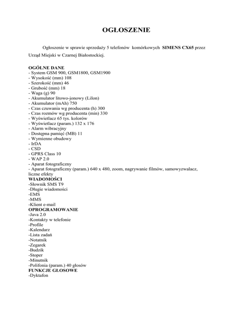 OGŁOSZENIE Ogłoszenie w sprawie sprzedaży 5 telefonów komórkowych SIMENS CX65 przez Urząd Miejski w Czarnej Białostockiej. OGÓLNE DANE - System GSM 900, GSM1800, GSM1900 - Wysokość (mm) 108 - Szerokość (mm) 46 - Grubość (mm) 18 - Waga (g) 90 - Akumulator litowo-jonowy (LiIon) - Akumulator (mAh) 750 - Czas czuwania wg producenta (h) 300 - Czas rozmów wg producenta (min) 330 - Wyświetlacz 65 tys. kolorów - Wyświetlacz (param.) 132 x 176 - Alarm wibracyjny - Dostępna pamięć (MB) 11 - Wymienne obudowy - IrDA - CSD - GPRS Class 10 - WAP 2.0 - Aparat fotograficzny - Aparat fotograficzny (param.) 640 x 480, zoom, nagrywanie filmów, samowyzwalacz, liczne efekty WIADOMOŚCI -Słownik SMS T9 -Długie wiadomości -EMS -MMS -Klient e-mail OPROGRAMOWANIE -Java 2.0 -Kontakty w telefonie -Profile -Kalendarz -Lista zadań -Notatnik -Zegarek -Budzik -Stoper -Minutnik -Polifonia (param.) 40 głosów FUNKCJE GŁOSOWE -Dyktafon -System głośnomówiący W ZESTAWIE: -bateria -instrukcja obsługi -opakowanie OPIS: Telefon w 100% sprawny, wizualnie drobne ślady użytkowania, nie przeszkadzają w użytkowaniu. Sugerowana cena 10 zł (słownie pięćdziesiąt złotych). Ewentualne pytania proszę kierować na adres mailowy: [email protected] lub telefonicznie (085) 713 13 60. Istnieje możliwość obejrzenia telefonów w Urzędzie Miejski w Czarnej Białostockiej w pokoju nr 6.