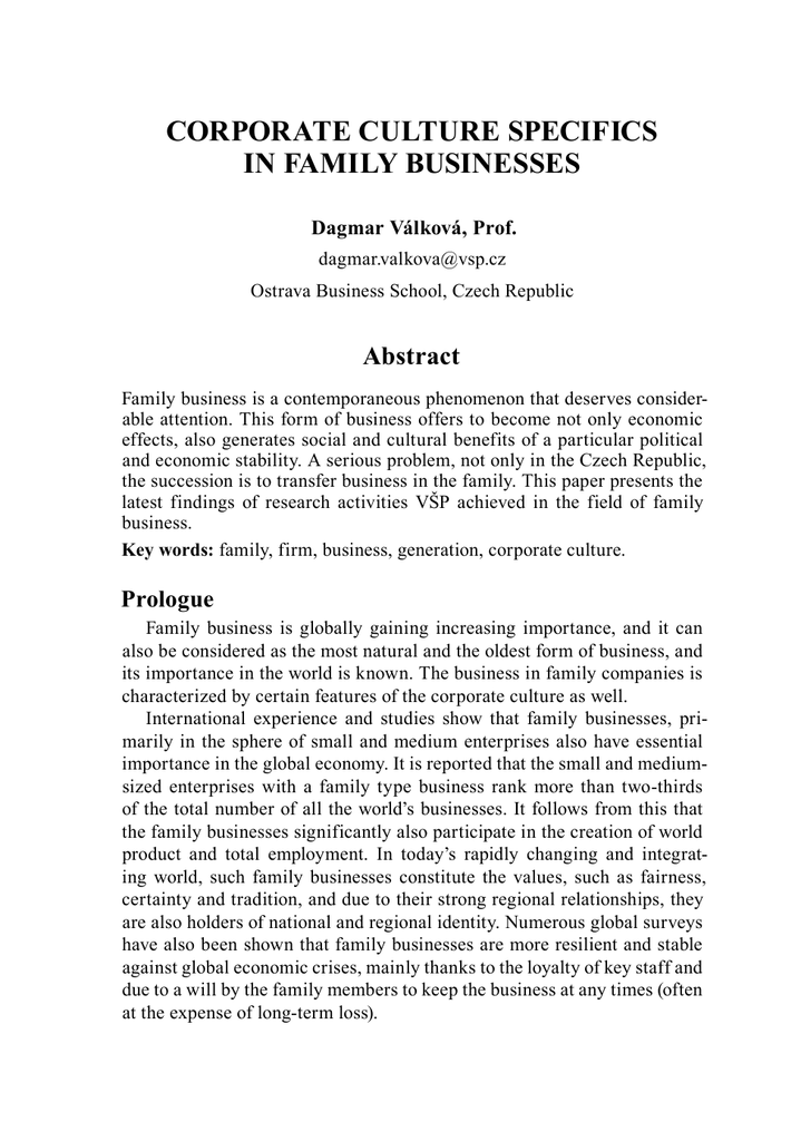 CORPORATE CULTURE SPECIFICS IN FAMILY BUSINESSES Dagmar Válková, Prof. [email protected] Ostrava Business School, Czech Republic Abstract Family business is a contemporaneous phenomenon that deserves considerable attention. This form of business offers to become not only economic effects, also generates social and cultural benefits of a particular political and economic stability. A serious problem, not only in the Czech Republic, the succession is to transfer business in the family. This paper presents the latest findings of research activities VŠP achieved in the field of family business. Key words: family, firm, business, generation, corporate culture. Prologue Family business is globally gaining increasing importance, and it can also be considered as the most natural and the oldest form of business, and its importance in the world is known. The business in family companies is characterized by certain features of the corporate culture as well. International experience and studies show that family businesses, primarily in the sphere of small and medium enterprises also have essential importance in the global economy. It is reported that the small and mediumsized enterprises with a family type business rank more than two-thirds of the total number of all the world’s businesses. It follows from this that the family businesses significantly also participate in the creation of world product and total employment. In today’s rapidly changing and integrating world, such family businesses constitute the values, such as fairness, certainty and tradition, and due to their strong regional relationships, they are also holders of national and regional identity. Numerous global surveys have also been shown that family businesses are more resilient and stable against global economic crises, mainly thanks to the loyalty of key staff and due to a will by the family members to keep the business at any times (often at the expense of long-term loss). Forum Scientiae Oeconomia Volume 2 (2014) No 1 In the Czech Republic the family business should have had also longstanding history and its expansion had been primarily at the time of the First Republic, when many businesses had crossed the border of the Czech Republic and have become international (one of the most famous examples is the shoe company Bata). After the Second World War, with the rise of totalitarianism and centrally planned economy, the continuity of family business was broken until 1989. By the beginning of the nineties of the last century the business environment began to arise again and a market economy started to develop. Unfortunately, in the Czech Republic the conditions for doing business and family business are still on a long track and especially the family business is not solved at all (legislative process is lengthy, and constantly changing). Therefore yet, the family business; except a very small exceptions; do not have suitable conditions for its further development and almost no support. Family businesses have to in addition the current economic difficulties face also the entire series; for family businesses; especially characteristic problems (Gersick et al. 1997), in particular sociological-psychological and legal nature. One of the biggest challenges to the long-term sustainability of the family company is to ensure continuity in the management and, therefore, the tendency should be directed in this area also to support the solution of generational replacement. Handing over the company to the next generation is considered by managers as a strategic task and the successful holding from the first generation on the other one, according to the available data, make it even half of all family businesses (Strážovská, Strážovská 2002). Current issue of succession in family businesses in the Czech Republic should become one of the main strategic objectives of each of the family business and in this direction should logically go also all other tendencies in the field of family business. Sense of solutions in this topic also lies in the fact that businesses that were founded as a family at the beginning of the 1990s or after the privatization they have become as the family business, are in their lifetime at the end of the second decade and the owners-managers of these companies will necessarily have to ask the question, what’s next? 1. Scope of family business 1.1.Definition of family business Yet, the family business is the oldest and most natural form of business at all, there is not an accurate and consistent global definition, which would have been an internationally validation and allows a mutual comparison. It is not easy to define clearly the family business and it’s mainly because it can be difficult to generally define the relationship between the family 122 Corporate culture specifics in family businesses and the enterprise. Everything is exacerbated by the fact that the concept of family is not seen similar in all cultures as well. In some communities it is understood only as a family group consisting of parents and children, elsewhere, then includes other members (uncles, aunts, cousins, etc.); and non-family members are subject to the common values and culture. With various sizes of the company also significantly changes the strategic influence of the family and ownership (the ratio of the total capital in the hands of the family). The worldwide need to define a family business mainly follows from the needs of macroeconomic and legal definition of the separate forms of business for the purposes of categorization and peer comparisons. Despite the fact that today there are a number of definitions of a family business that are different in many ways, we can see a series of identical, key characteristics. How for example Hesková lists; family-run business is a company, which is owned and managed by members of one or more families and these have a major impact on business strategy (Hesková, Vojtko 2008). A propor