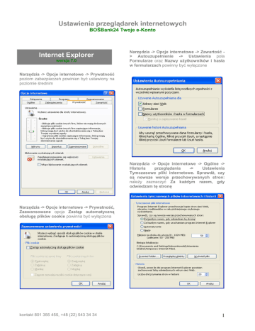 Ustawienia przeglądarek internetowych BOŚBank24 Twoje e-Konto Internet Explorer wersja 7.0 Narzędzia -> Opcje internetowe -> Zawartość > Autouzupełnienie -> Ustawienia pola Formularze oraz Nazwy użytkowników i hasła w formularzach powinny być wyłączone Narzędzia -> Opcje internetowe -> Prywatność poziom zabezpieczeń powinien być ustawiony na poziomie średnim Narzędzia -> Opcje internetowe -> Ogólne -> Historia przeglądania -> Ustawienia Tymczasowe pliki internetowe. Sprawdź, czy są nowsze wersje przechowywanych stron: należy zaznaczyć Za każdym razem, gdy odwiedzam tę stronę Narzędzia -> Opcje internetowe -> Prywatność, Zaawansowane opcja Zastąp automatyczną obsługę plików cookie powinna być wyłączona kontakt 801 355 455, +48 (22) 543 34 34 1 Ustawienia przeglądarek internetowych BOŚBank24 Twoje e-Konto Narzędzia -> Opcje internetowe -> Zaawansowane w części Przeglądanie powinno być odznaczone pole Włącz rozszerzenia przeglądarki innych firm Internet Explorer wersje 8.0 i 9.0 Narzędzia -> Opcje internetowe -> Prywatność poziom zabezpieczeń powinien być ustawiony na poziomie średnim Narzędzia -> Opcje internetowe -> Zaawansowane w części Zabezpieczenia powinno być zaznaczone pole Nie zapisuj zaszyfrowanych stron na dysku kontakt 801 355 455, +48 (22) 543 34 34 Narzędzia -> Opcje internetowe -> Prywatność, Zaawansowane opcja Zastąp automatyczną obsługę plików cookie powinna być wyłączona 2 Ustawienia przeglądarek internetowych BOŚBank24 Twoje e-Konto Narzędzia -> Opcje internetowe -> Zawartość > Autouzupełnienie pola Formularze oraz Nazwy użytkowników i hasła w formularzach powinny być wyłączone Narzędzia -> Opcje internetowe -> Ogólne -> Historia przeglądania -> Sprawdź, czy są nowsze wersje przechowywanych stron: należy zaznaczyć Przy każdej wizycie na tej stronie kontakt 801 355 455, +48 (22) 543 34 34 Narzędzia -> Opcje internetowe -> Zaawansowane w części Przeglądanie powinno być odznaczone pole Włącz rozszerzenia przeglądarki innych firm Narzędzia -> Opcje internetowe -> Zaawansowane w części Zabezpieczenia powinno być zaznaczone pole Nie zapisuj zaszyfrowanych stron na dysku 3