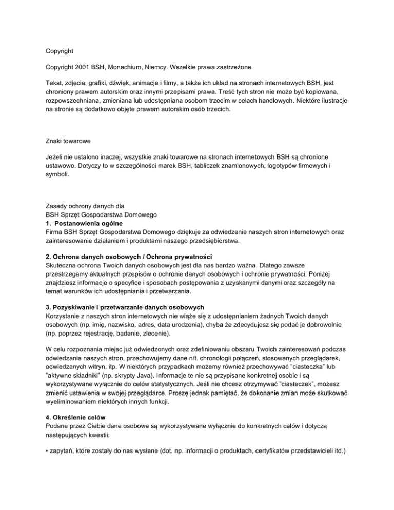 Copyright Copyright 2001 BSH, Monachium, Niemcy. Wszelkie prawa zastrzeżone. Tekst, zdjęcia, grafiki, dźwięk, animacje i filmy, a także ich układ na stronach internetowych BSH, jest chroniony prawem autorskim oraz innymi przepisami prawa. Treść tych stron nie może być kopiowana, rozpowszechniana, zmieniana lub udostępniana osobom trzecim w celach handlowych. Niektóre ilustracje na stronie są dodatkowo objęte prawem autorskim osób trzecich. Znaki towarowe Jeżeli nie ustalono inaczej, wszystkie znaki towarowe na stronach internetowych BSH są chronione ustawowo. Dotyczy to w szczególności marek BSH, tabliczek znamionowych, logotypów firmowych i symboli. Zasady ochrony danych dla BSH Sprzęt Gospodarstwa Domowego 1. Postanowienia ogólne Firma BSH Sprzęt Gospodarstwa Domowego dziękuje za odwiedzenie naszych stron internetowych oraz zainteresowanie działaniem i produktami naszego przedsiębiorstwa. 2. Ochrona danych osobowych / Ochrona prywatności Skuteczna ochrona Twoich danych osobowych jest dla nas bardzo ważna. Dlatego zawsze przestrzegamy aktualnych przepisów o ochronie danych osobowych i ochronie prywatności. Poniżej znajdziesz informacje o specyfice i sposobach postępowania z uzyskanymi danymi oraz szczegóły na temat warunków ich udostępniania i przetwarzania. 3. Pozyskiwanie i przetwarzanie danych osobowych Korzystanie z naszych stron internetowych nie wiąże się z udostępnianiem żadnych Twoich danych osobowych (np. imię, nazwisko, adres, data urodzenia), chyba że zdecydujesz się podać je dobrowolnie (np. poprzez rejestrację, badanie, zlecenie). W celu rozpoznania miejsc już odwiedzonych oraz zdefiniowaniu obszaru Twoich zainteresowań podczas odwiedzania naszych stron, przechowujemy dane n/t. chronologii połączeń, stosowanych przeglądarek, odwiedzanych witryn, itp. W niektórych przypadkach możemy również przechowywać ”ciasteczka” lub ”aktywne składniki” (np. skrypty Java). Informacje te nie są przypisane konkretnej osobie i są wykorzystywane wyłącznie do celów statystycznych. Jeśli nie chcesz otrzymywać ”ciasteczek”, możesz zmienić ustawienia w swojej przeglądarce. Proszę jednak pamiętać, że dokonanie zmian może skutkować wyeliminowaniem niektórych innych funkcji. 4. Określenie celów Podane przez Ciebie dane osobowe są wykorzystywane wyłącznie do konkretnych celów i dotyczą następujących kwestii: • zapytań, które zostały do nas wysłane (dot. np. informacji o produktach, certyfikatów przedstawicieli itd.) • zamówień realizowanych za pośrednictwem naszego portalu • badań i ankiet (np. poziomu zadowolenia klienta) • wniosków 5. Wykorzystanie i przekaz danych W celu utrzymania kontaktu między klientem, a dostawcą, korzystamy z przechowywanych danych osobowych poprzez ich przekazywanie: • naszym filiom na całym świecie lub • innym podmiotom działającym w naszym imieniu Dane pomagają nam reagować na Twoje potrzeby tak szybko i efektywnie, jak to możliwe i są niezbędne przy: • doborze produktu lub pytaniach ofertowych • wysyłce zamówionych przez Ciebie produktów • informowaniu o specjalnych ofertach • badaniach ankietowych 6. Prawo dostępu do treści danych Pamiętaj, że masz prawo dostępu do treści swoich danych oraz ich poprawiania 7. Środki bezpieczeństwa BSH Sprzęt Gospodarstwa Domowego zachowuje wszelkie niezbędne środki techniczne i organizacyjne, aby chronić dane osobowe przed: • wszelkimi nieprawidłowościami lub nielegalnym usuwaniem, • nieautoryzowanymi zmianami lub przeniesieniami, • nieuprawnionym ujawnieniem lub udostępnieniem osobom nieupoważnionym • zabraniem przez osobę nieuprawnioną • przetwarzaniem z naruszeniem ustawy • ich utratą, uszkodzeniem lub zniszczeniem 8. Linki do innych stron internetowych Strona internetowa BSH Sprzęt Gospodarstwa Domowego może zawierać linki do innych stron, z zastrzeżeniem nieponoszenia przez nas odpowiedzialności za zawartą w nich treść oraz stosowaną politykę prywatności. 9. Kontakt Jeśli masz jakieś pytania, sugestie, wątpliwości lub skargi, skontaktuj się z nami telefonicznie lub przez email z jedną z osób wymienionych w liście kontaktów. 10. Proces rozwojowy zasad ochrony danych Stały rozwój dziedziny ofert internetowych obejmuje również modernizację zasad ochrony danych. Dlatego na naszej stronie będziemy regularnie informować o wszelkich zmianach. Prosimy o jej regularne sprawdzanie, aby na bieżąco śledzić aktualizację zasad ochrony danych.
