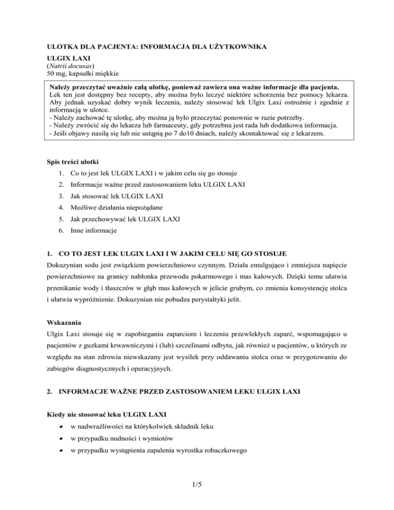 ULOTKA DLA PACJENTA: INFORMACJA DLA UŻYTKOWNIKA ULGIX LAXI (Natrii docusas) 50 mg, kapsułki miękkie Należy przeczytać uważnie całą ulotkę, ponieważ zawiera ona ważne informacje dla pacjenta. Lek ten jest dostępny bez recepty, aby można było leczyć niektóre schorzenia bez pomocy lekarza. Aby jednak uzyskać dobry wynik leczenia, należy stosować lek Ulgix Laxi ostrożnie i zgodnie z informacją w ulotce. - Należy zachować tę ulotkę, aby można ją było przeczytać ponownie w razie potrzeby. - Należy zwrócić się do lekarza lub farmaceuty, gdy potrzebna jest rada lub dodatkowa informacja. - Jeśli objawy nasilą się lub nie ustąpią po 7 do10 dniach, należy skontaktować się z lekarzem. Spis treści ulotki 1. Co to jest lek ULGIX LAXI i w jakim celu się go stosuje 2. Informacje ważne przed zastosowaniem leku ULGIX LAXI 3. Jak stosować lek ULGIX LAXI 4. Możliwe działania niepożądane 5. Jak przechowywać lek ULGIX LAXI 6. Inne informacje 1. CO TO JEST LEK ULGIX LAXI I W JAKIM CELU SIĘ GO STOSUJE Dokuzynian sodu jest związkiem powierzchniowo czynnym. Działa emulgująco i zmniejsza napięcie powierzchniowe na granicy nabłonka przewodu pokarmowego i mas kałowych. Dzięki temu ułatwia przenikanie wody i tłuszczów w głąb mas kałowych w jelicie grubym, co zmienia konsystencję stolca i ułatwia wypróżnienie. Dokuzynian nie pobudza perystaltyki jelit. Wskazania Ulgix Laxi stosuje się w zapobieganiu zaparciom i leczeniu przewlekłych zaparć, wspomagająco u pacjentów z guzkami krwawniczymi i (lub) szczelinami odbytu, jak również u pacjentów, u których ze względu na stan zdrowia niewskazany jest wysiłek przy oddawaniu stolca oraz w przygotowaniu do zabiegów diagnostycznych i operacyjnych. 2. INFORMACJE WAŻNE PRZED ZASTOSOWANIEM LEKU ULGIX LAXI Kiedy nie stosować leku ULGIX LAXI • w nadwrażliwości na którykolwiek składnik leku • w przypadku nudności i wymiotów • w przypadku wystąpienia zapalenia wyrostka robaczkowego 1/5 • w przypadku wystąpienia niedrożności jelit oraz stanów zagrażających wystąpieniem niedrożności jelit (nagromadzenie mas kałowych, zapalenie jelit, zwężenie jelit, zrosty otrzewnowe, przepukliny, polipy, guzy) • w razie ostrego bólu o nieznanej przyczynie w jamie brzusznej • w przypadku krwawienia z przewodu pokarmowego o nieznanej przyczynie • w przypadku stanów odwodnienia organizmu • (patrz również interakcje). Kiedy zachować szczególną ostrożność stosując lek ULGIX LAXI Długotrwałe stosowanie leku (powyżej 7 do 10 dni) może spowodować przyzwyczajenie na dokuzynian sodu i brak reakcji na leczenie. W przypadku zaobserwowania zaburzeń motoryki jelita grubego (objawiających się jako zmiany nawyków dotyczących wypróżnień, np. częstości oddawania stolca i jego konsystencji), które utrzymują się przez okres dłuższy niż 2 tygodnie, środki przeczyszczające należy stosować ostrożnie i zasięgnąć porady lekarskiej. Chodzi tu zwłaszcza o uniknięcie przeoczenia nowotworu jelit, którego objawem mogą być wspomniane zmiany nawyków. Wystąpienie krwawienia z odbytnicy lub osłabienia naturalnych ruchów jelit (przejawiających się utrudnieniem albo niemożnością oddawania stolca) po zastosowaniu środków przeczyszczających może wskazywać na poważne schorzenie. W takim przypadku należy zaprzestać stosowania leku. Stosowanie leku ULGIX LAXI z innymi lekami Należy powiedzieć lekarzowi o wszystkich przyjmowanych ostatnio lekach, również tych, które wydawane są bez recepty. Leku nie należy stosować z: - olejem mineralnym (parafiną ciekłą), ponieważ ich jednoczesne stosowanie może powodować nasilenie odkładania się oleju mineralnego w węzłach chłonnych, błonie śluzowej jelita, w wątrobie i śledzionie; może to powodować przewlekłe zapalenie tych narządów oraz dodatkowo naciekanie komórek wątroby - dantronem, ponieważ lek zwiększa wchłanianie dantronu powodując wzrost jego toksyczności, co może prowadzić do uszkodzenia wątroby - droperidolem, ze względu na ryzyko kardiotoksyczności (uszkodzenie mięśnia sercowego) - lewometadonem, ponieważ ich jednoczesne stosowanie może prowadzić do poważnych zaburzeń rytmu serca - glikozydami naparstnicy, ze względu na możliwość nasilenia ich działania kardiotoksycznego, poprzez obniżenie stężenia potasu w surowicy krwi - kortykosteroidami, ponieważ dokuzynian nasila ich działanie obniżające stężenie potasu; interakcja ta może zajść dopiero przy długotrwałym stosowaniu obu leków 2/5 - kwasem acetylosalicylowym, ponieważ ich jednoczesne stosowanie może nasilać działanie niepożądane kwasu acetylosalicylowego na błonę śluzową przewodu pokarmowego - tetracyklinami, ponieważ dokuzynian zmniejsza biodostępność antybiotyków z tej grupy - lekami moczopędnymi, ponieważ długotrwałe, równoczesne stosowanie może powodować nasilenie utraty potasu lub osłabienie działania oszczędzającego potas leków moczopędnych, z takim mechanizmem działania. Stosowanie leku ULGIX LAXI u dzieci Lek jest zalecany dla dzieci powyżej 6 lat. Ciąża i karmienie piersią Przed zastosowaniem każdego leku należy poradzić się lekarza. Lek może być stosowany w ciąży jedynie w przypadkach, gdy w opinii lekarza korzyść dla matki przeważa nad potencjalnym ryzykiem dla płodu. Dokuzynian sodu przenika do mleka matki i dlatego nie zaleca się stosowania leku przez kobiety karmiące piersią. Prowadzenie pojazdów i obsługa maszyn Nie przeprowadzono badań nad wpływem leku na zdolność prowadzenia pojazdów mechanicznych i obsługiwania urządzeń mechanicznych w ruchu. Ważne informacje o niektórych składnikach leku ULGIX LAXI Lek zawiera sorbitol. Jeśli u pacjenta stwierdzono nietolerancję niektórych cukrów, to przed przyjęciem leku należy skontaktować się z lekarzem. 3. JAK STOSOWAĆ LEK ULGIX LAXI W razie wątpliwości związanych ze stosowani
