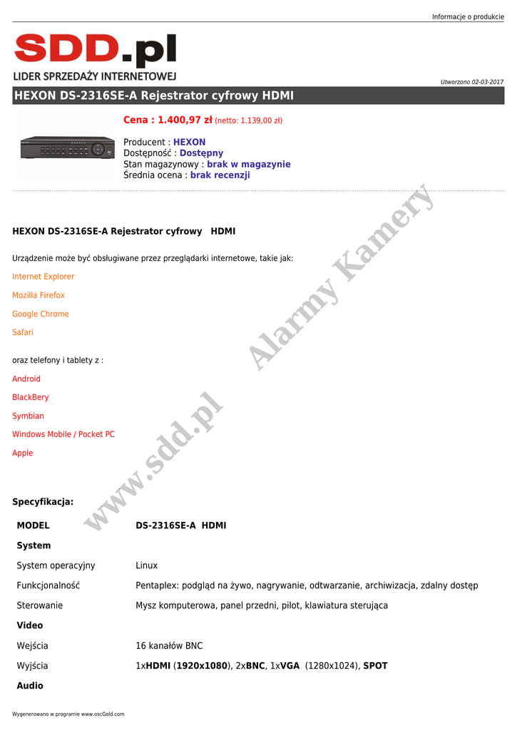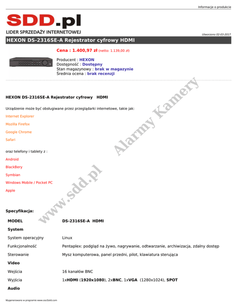Informacje o produkcie Utworzono 02-03-2017 HEXON DS-2316SE-A Rejestrator cyfrowy HDMI Cena : 1.400,97 zł (netto: 1.139,00 zł) er y Producent : HEXON Dostępność : Dostępny Stan magazynowy : brak w magazynie Średnia ocena : brak recenzji am HEXON DS-2316SE-A Rejestrator cyfrowy HDMI K Urządzenie może być obsługiwane przez przeglądarki internetowe, takie jak: y Internet Explorer Al ar m Mozilla Firefox Google Chrome Safari oraz telefony i tablety z : Android .p l BlackBery Symbian dd Windows Mobile / Pocket PC MODEL w Specyfikacja: w w .s Apple DS-2316SE-A HDMI System System operacyjny Linux Funkcjonalność Pentaplex: podgląd na żywo, nagrywanie, odtwarzanie, archiwizacja, zdalny dostęp Sterowanie Mysz komputerowa, panel przedni, pilot, klawiatura sterująca Video Wejścia 16 kanałów BNC Wyjścia 1xHDMI (1920x1080), 2xBNC, 1xVGA (1280x1024), SPOT Audio Wygenerowano w programie www.oscGold.com Wejścia 4xRCA Wyjścia 1xRCA Alarm Wejścia alarmowe 16 (NO/NC) Wyjścia alarmowe 1 wyjście przekaźnikowe Rozdzielczość nagrywania D1 (704x576) CIF (352X288) Prędkość nagrywania 100kl/s w D1, 400kl/s w CIF 14 kanałów CIF Real time + 2 kanały D1 Real time Tryby nagrywania Ręczny/Terminarz/Detekcja ruchu Dual Streaming Tak K Archiwizacja Pendrive USB, Sieć Dodatkowe interfejsy Tak RS-485 2 porty USB 2.0 2 porty .p l RJ45 Pozostałe 1xSATA Wymiary 300x260x60mm .s dd Dysk twardy 2kg w w w Waga Al ar m 1,2,4,8,16 kanałów y Odtwarzanie i archiwizacja Odtwarzanie er H.264 am Kompresja y Nagrywanie